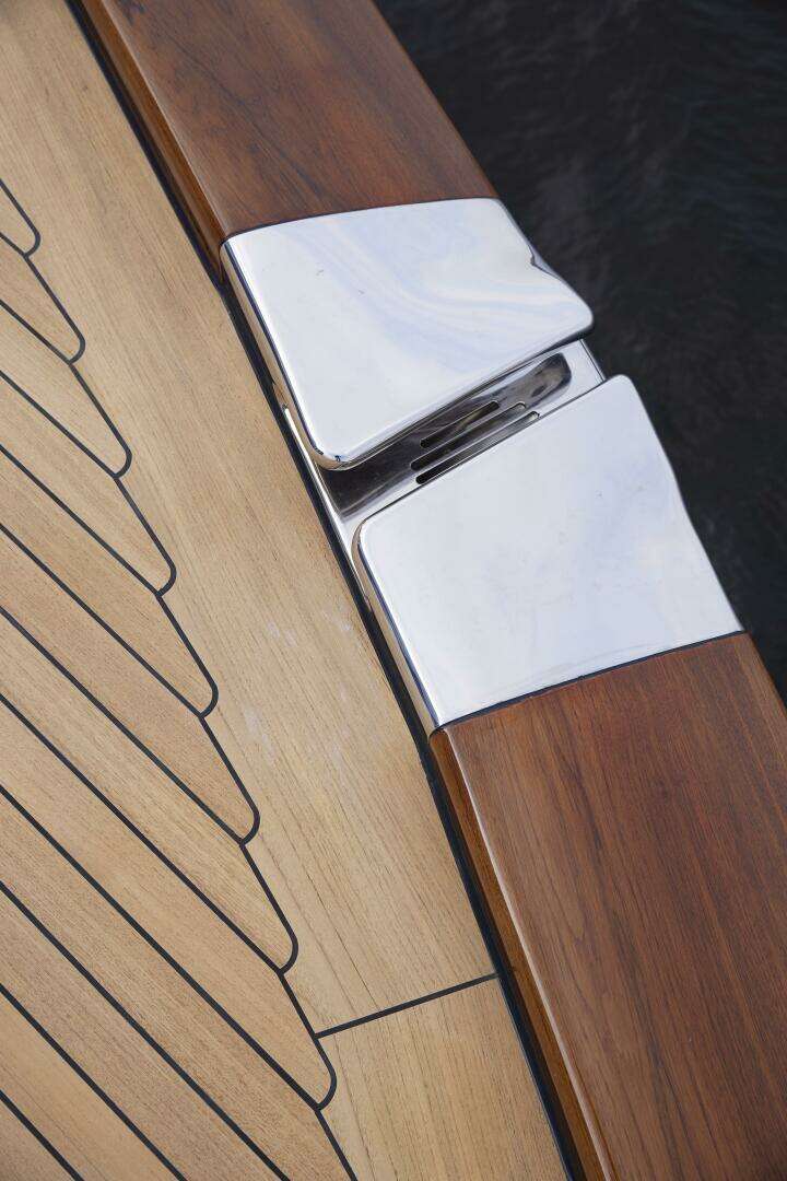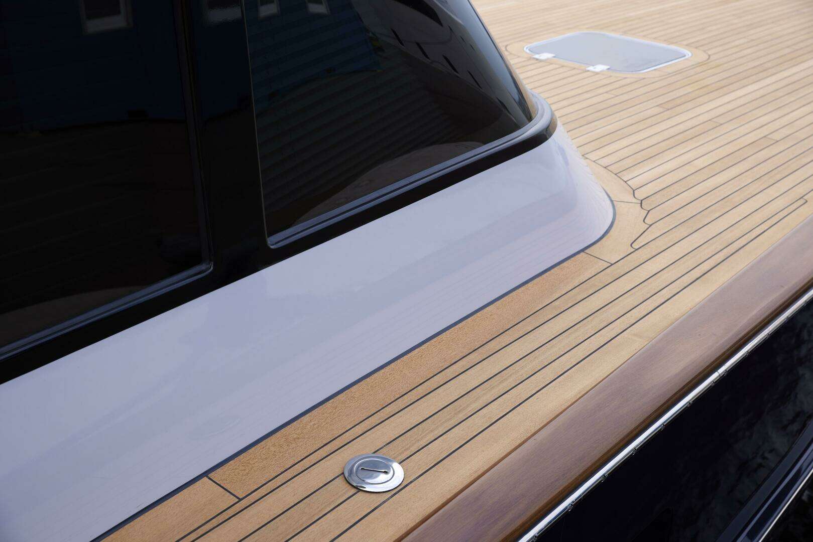 Boarding the cockpit – port or starboard, on her custom boarding system, the intricate details begin. Natural teak cap rails and teak decks, along with a varnished teak transom and varnished teak bulkheads, give an immediate, elegant feeling. Complete with all the necessary equipment to fish or entertain, nothing has been overlooked in its stunning design, which is elegant, clean, and practical.