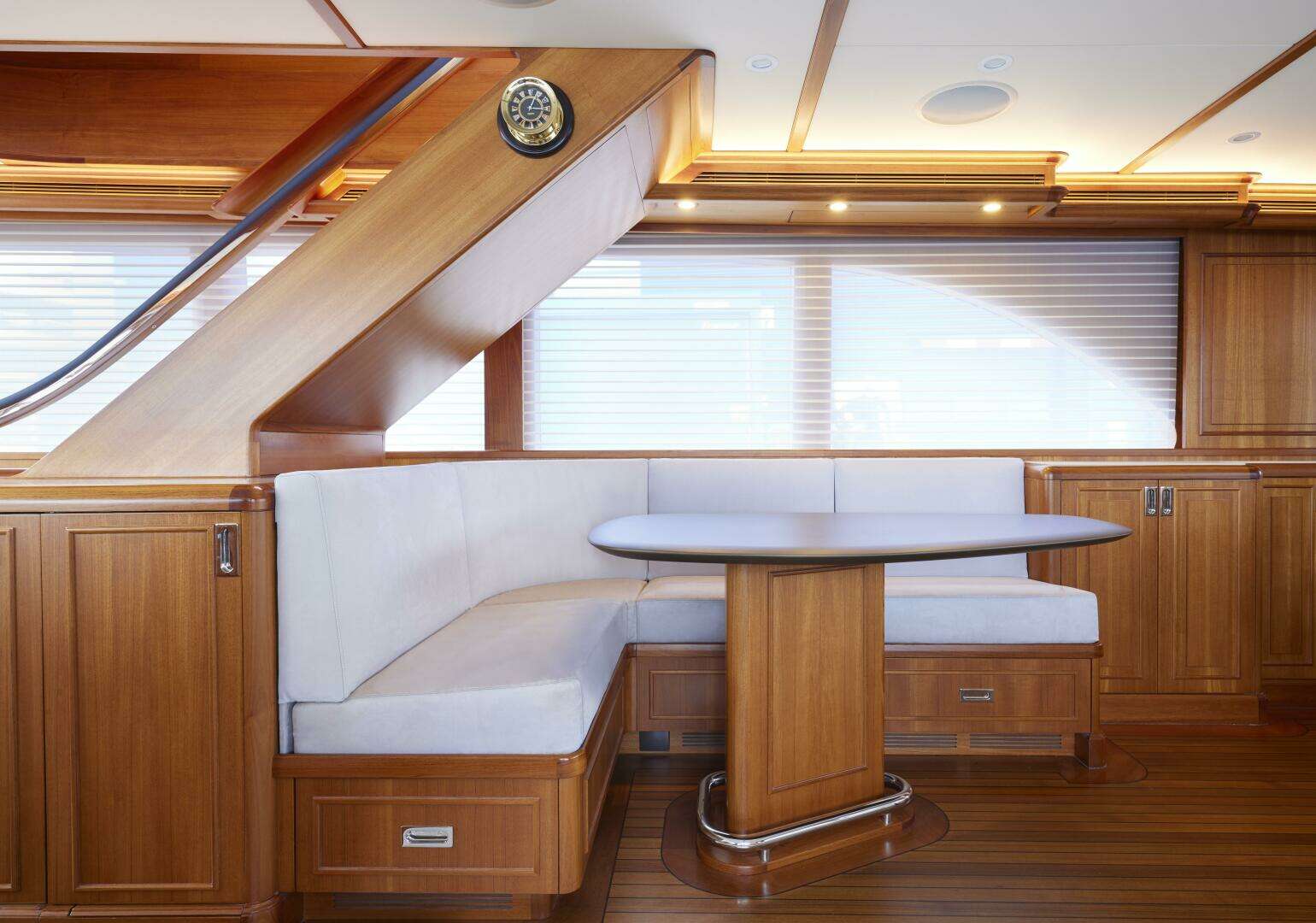 As you enter the salon from the mezzanine seating on the starboard quarter, you are immediately struck by the 360 degrees of windows, allowing natural light and great vistas, all of which can be hidden by the push of a button, as the custom electric blinds quietly obscure the outside world. The blend of classic teak wood joinery combined with rich fabric creates an atmosphere of classic luxury and comfort. All loose furnishings have been replaced throughout the vessel.
