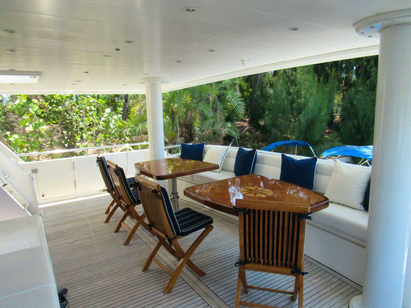 Sanctuary is a raised pilothouse design with walk-around decks, four staterooms and three cabins for crew. Galley / Country Kitchen is forward on the main deck. Aft on the main deck is a generous salon with a dining area forward and lounge / social area aft.