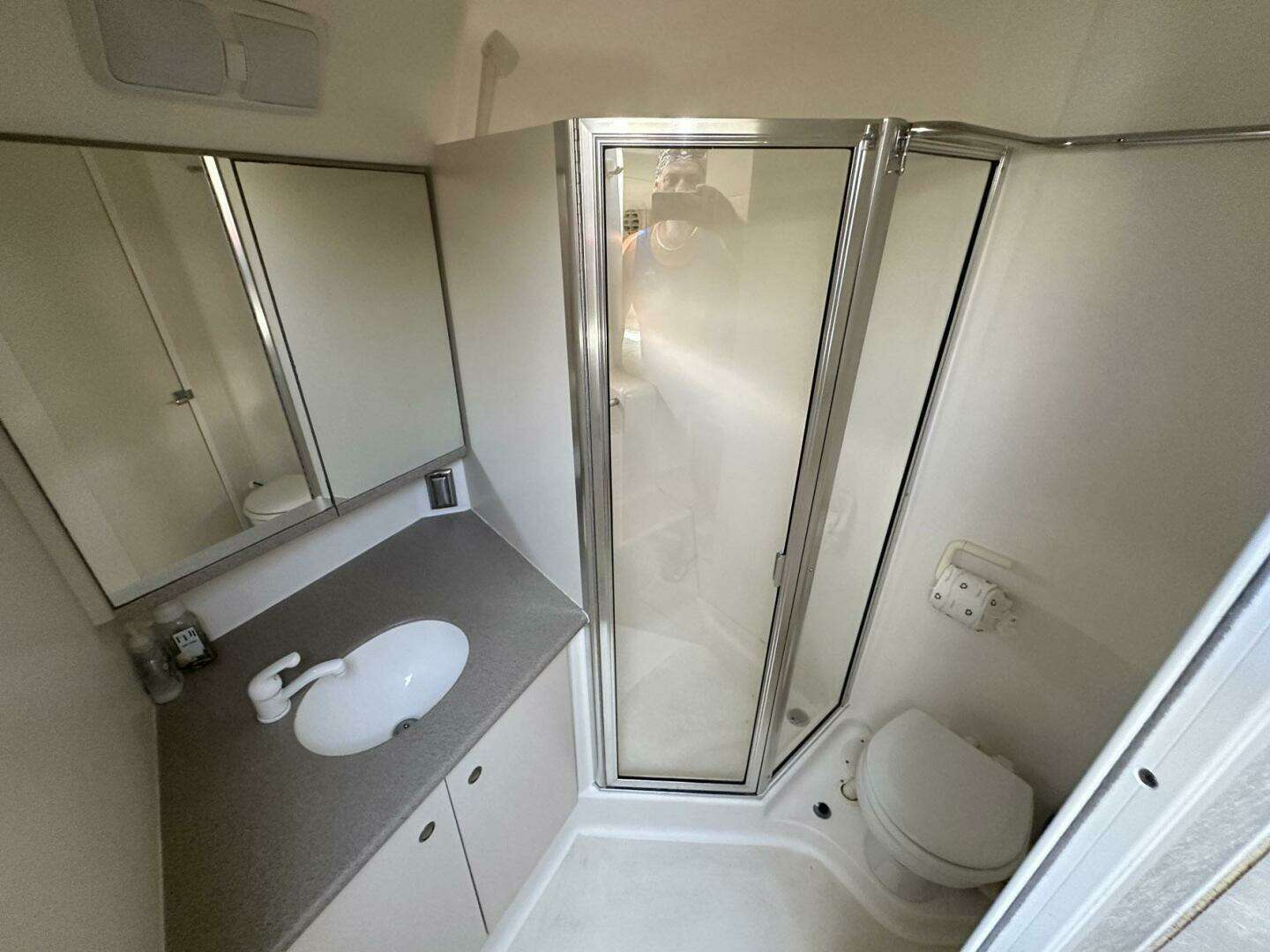 - Separate shower stall with portlight