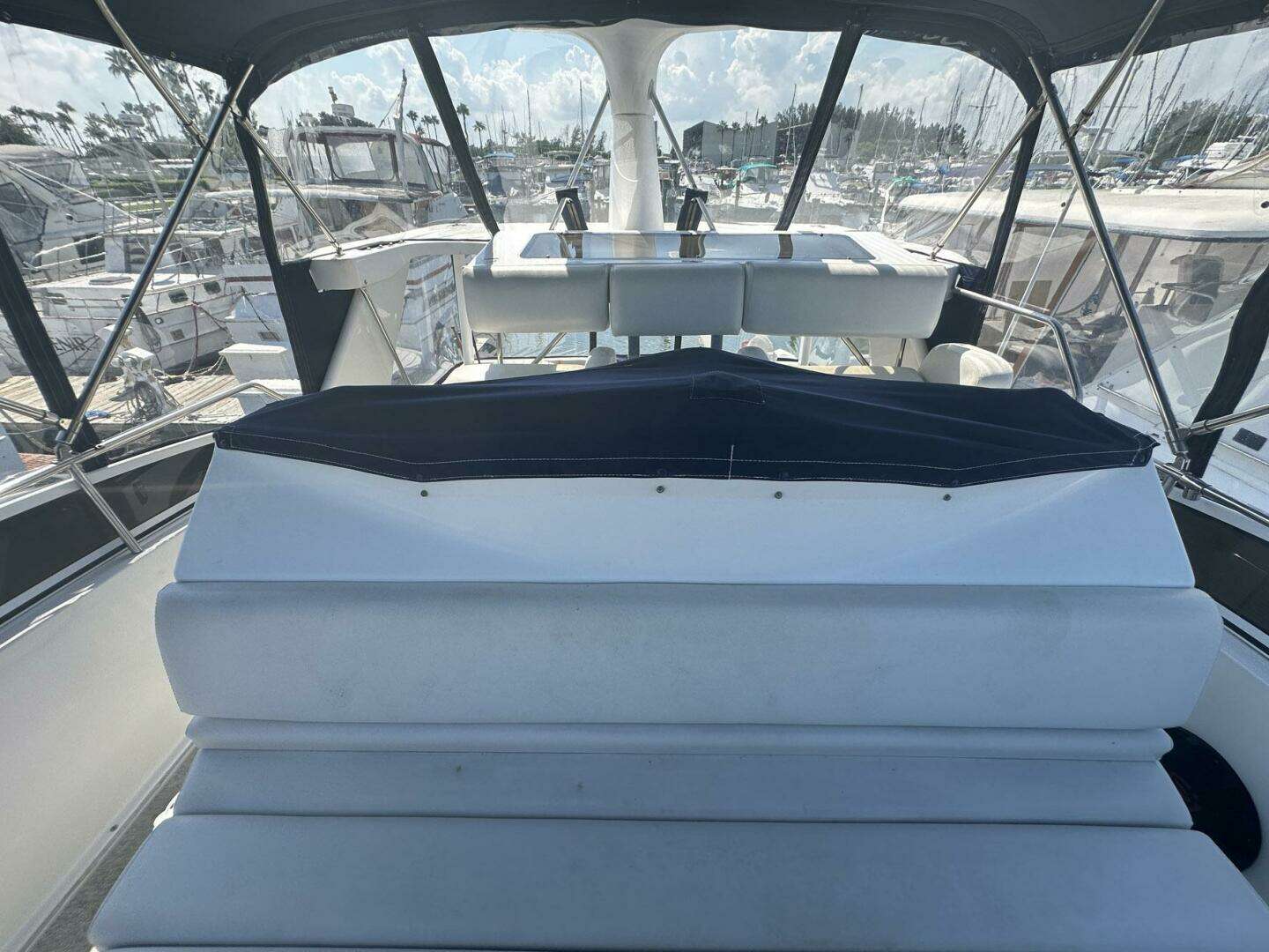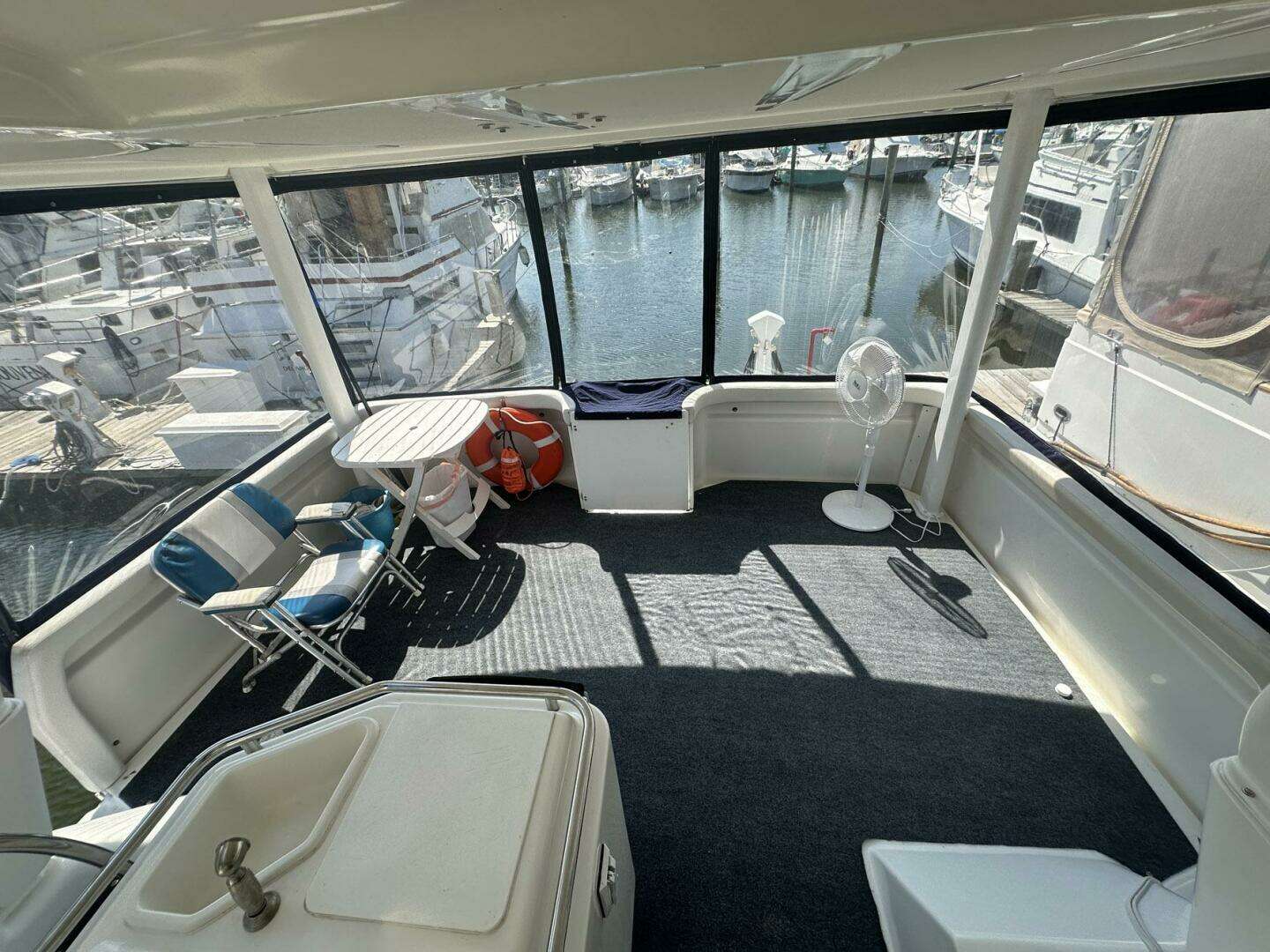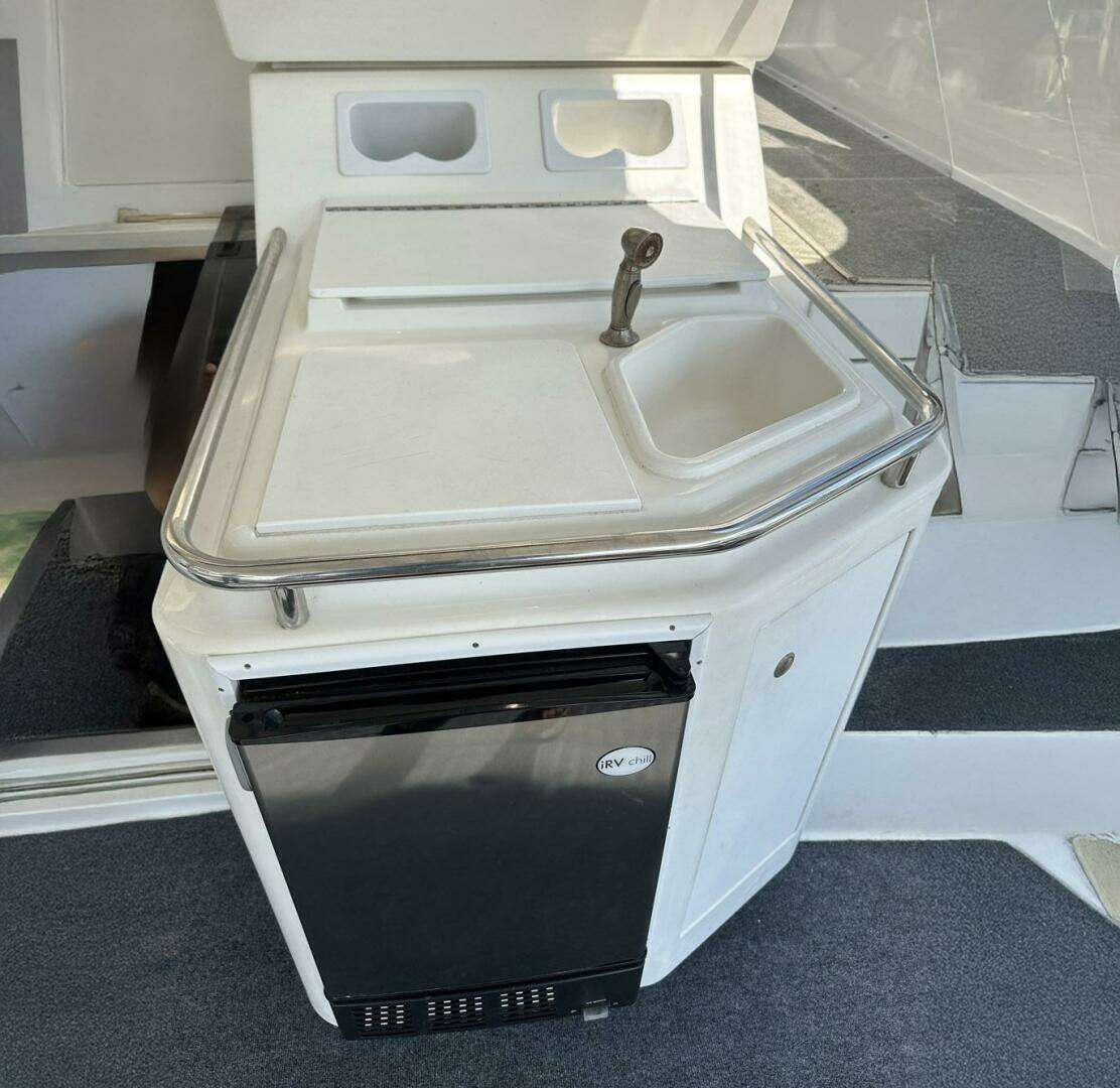 The aft sundeck is fully enclosed with Sunbrella and isinglass panels with screens. For entertaining there is a wet bar and ice The flybridge, four steps up from the aft deck, has a center-line adjustable helm seat with mate seats on both sides. There is also a bench seat forward of the helm for additional guests.