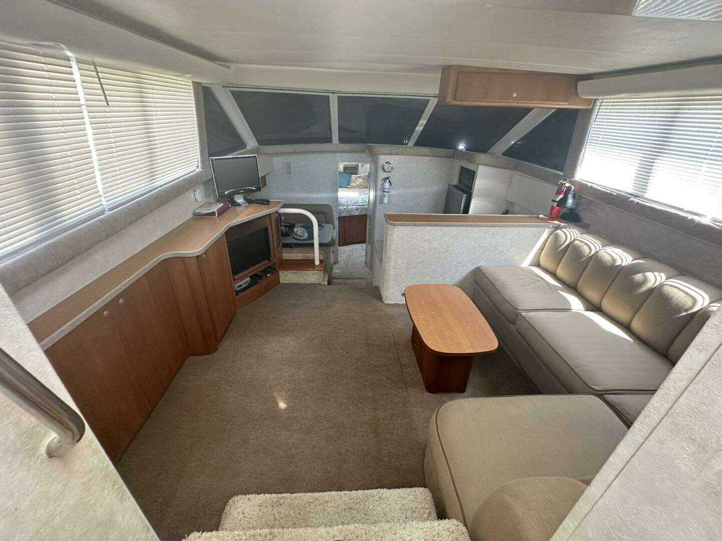 The bright and airy main salon has wall-to-wall carpeting, cherry wood cabinetry, built-in entertainment center, a large “L” shaped settee, coffee table, and designer window treatments with mini blinds.
