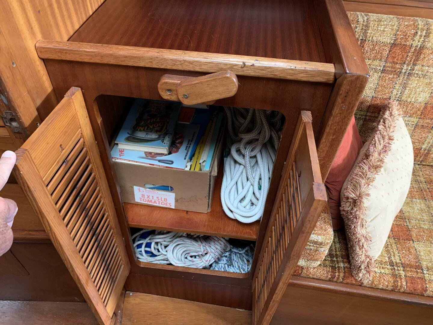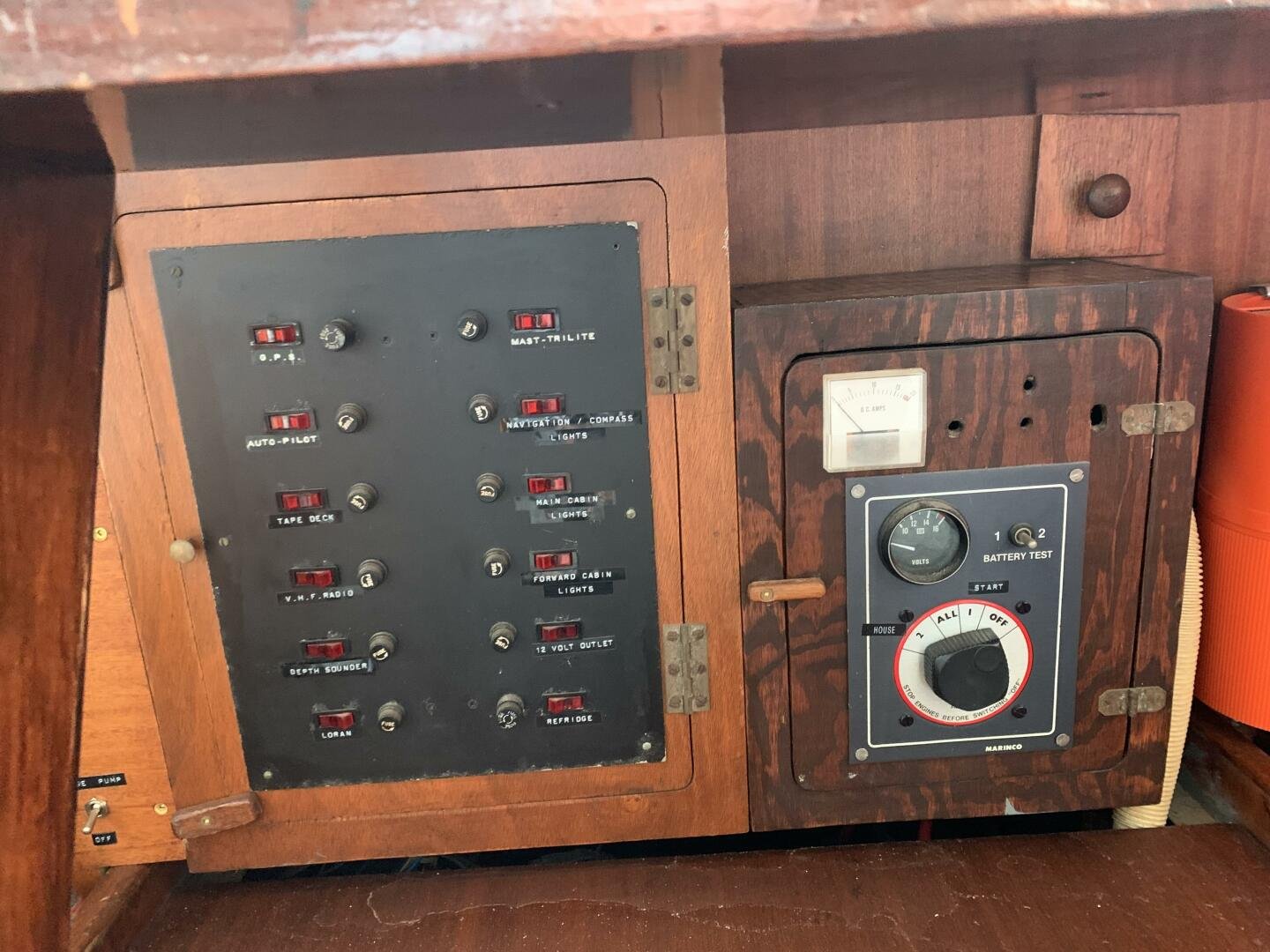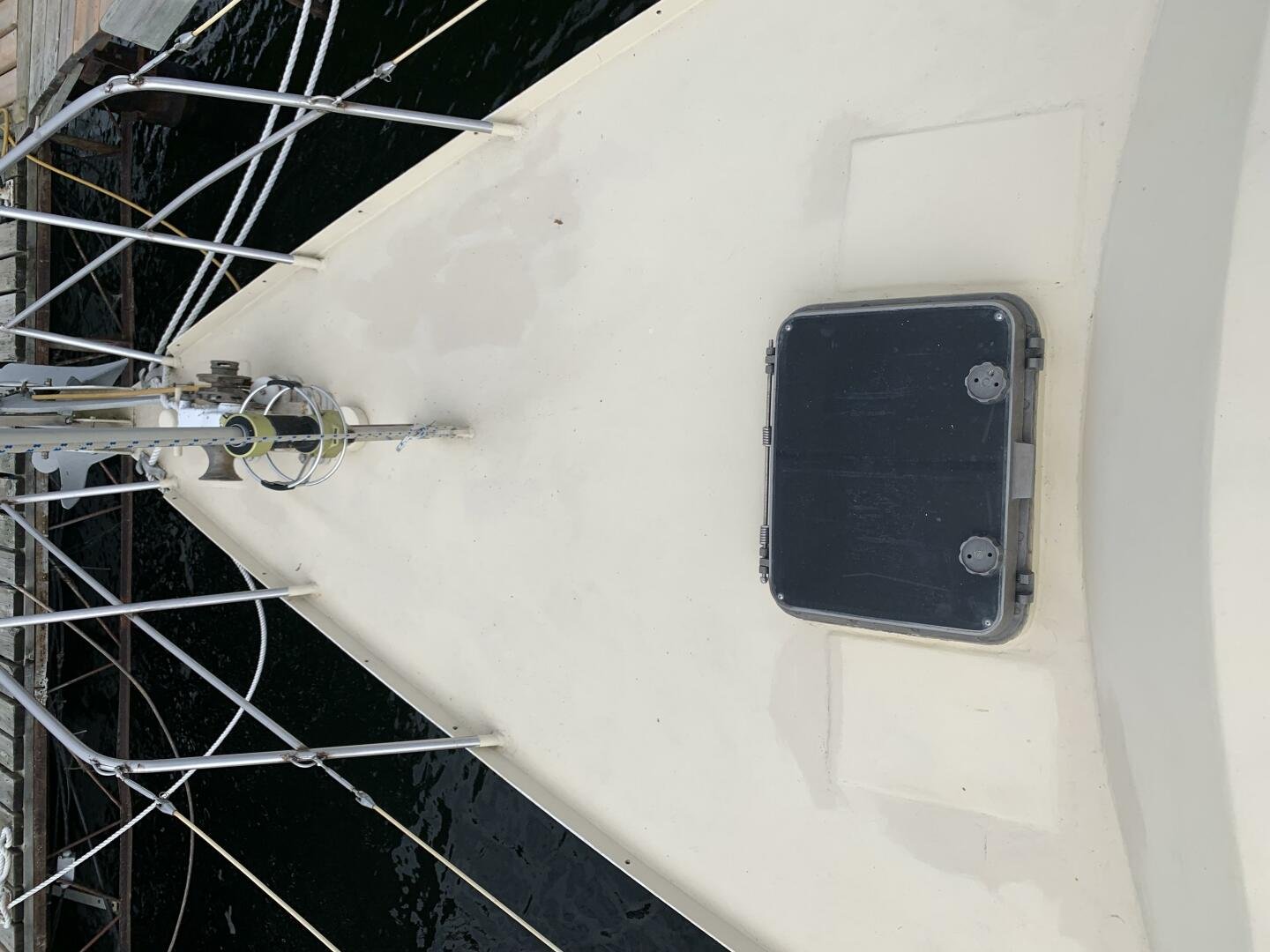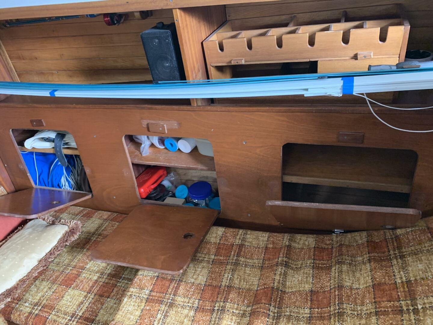 The layout features double quarterberths aft, a midship galley to port & nav station/storage drawers to starboard. A step down to the salon with opposing settees & centreline table. A bulkhead mounted Blueseas diesel cabin heater has not been used in many years but may be usable again. Enclosed head to port with hanging lockers opposite. Conventional V berth forward.