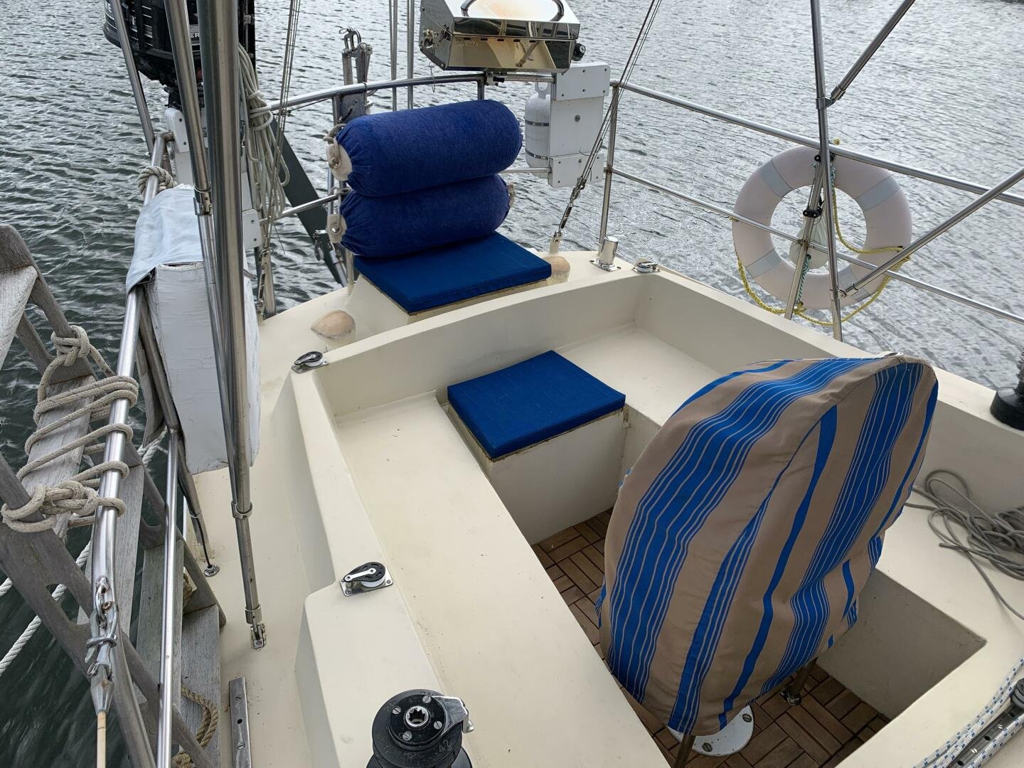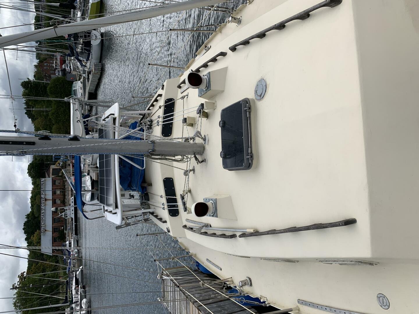 The deck has a conventional trunk cabin with good side & fore deck working surfaces. The cockpit is a blue water design with pedestal steering and traveller on the bridgedeck. Hardtop dodger & bimini arrangement. All welded pulpits & stanchions. There is a transom mounted self steering gear.