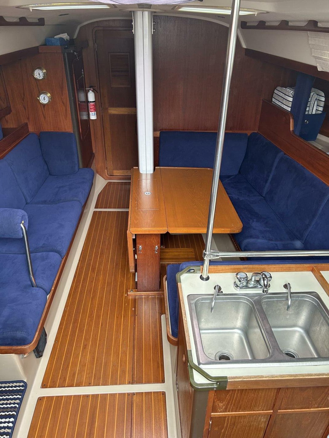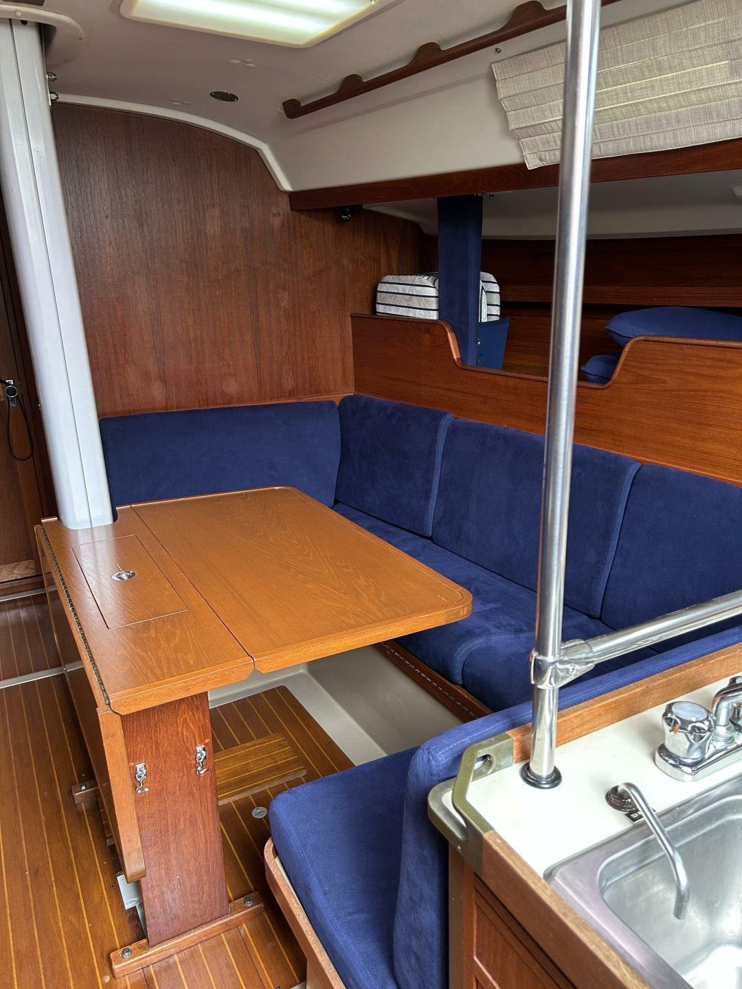 The main salon has a dinette to starboard with a fixed drop leaf centreline table. Settee to port side with the nav station situated the aft end.