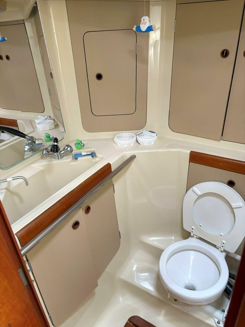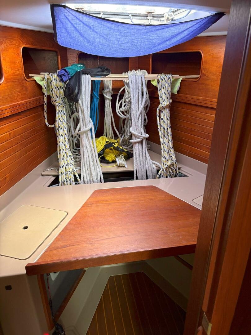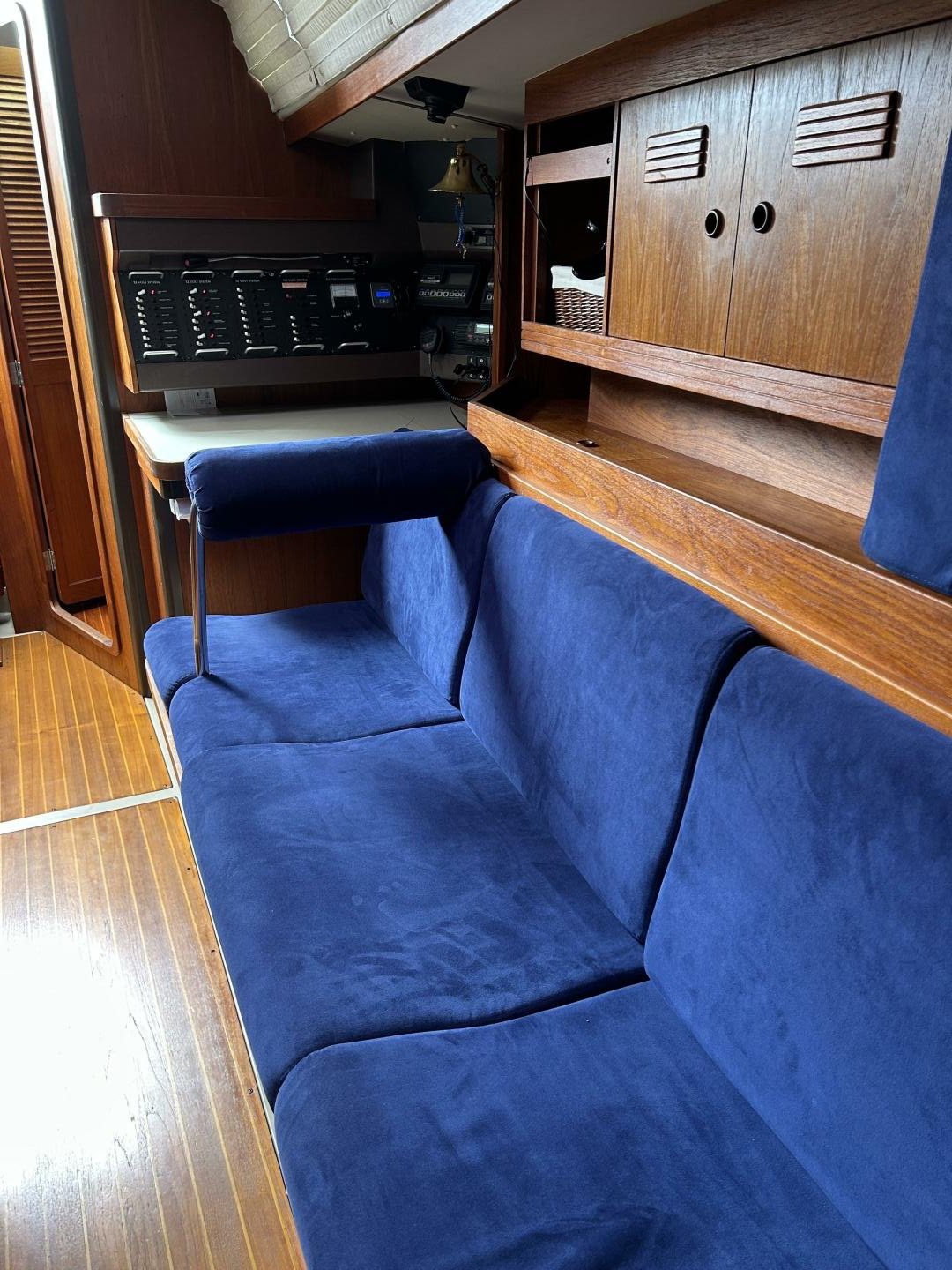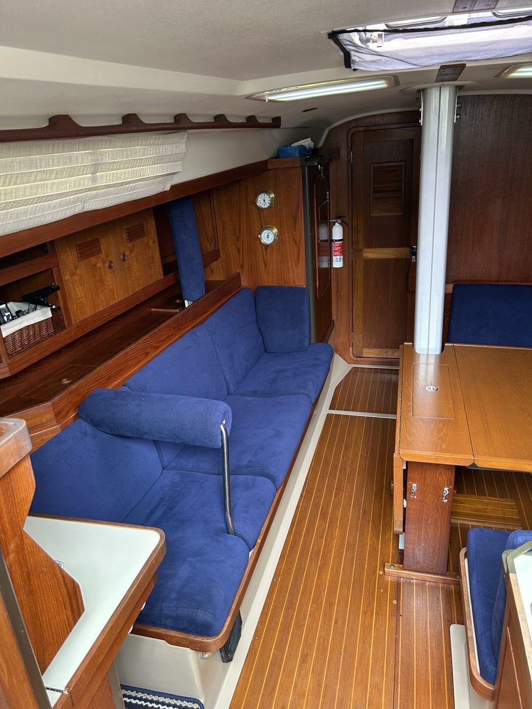 Enclosed head is to starboard with hanging lockers opposite. Updated upholstery. Teak & holly cabin sole. The interior shows very well.