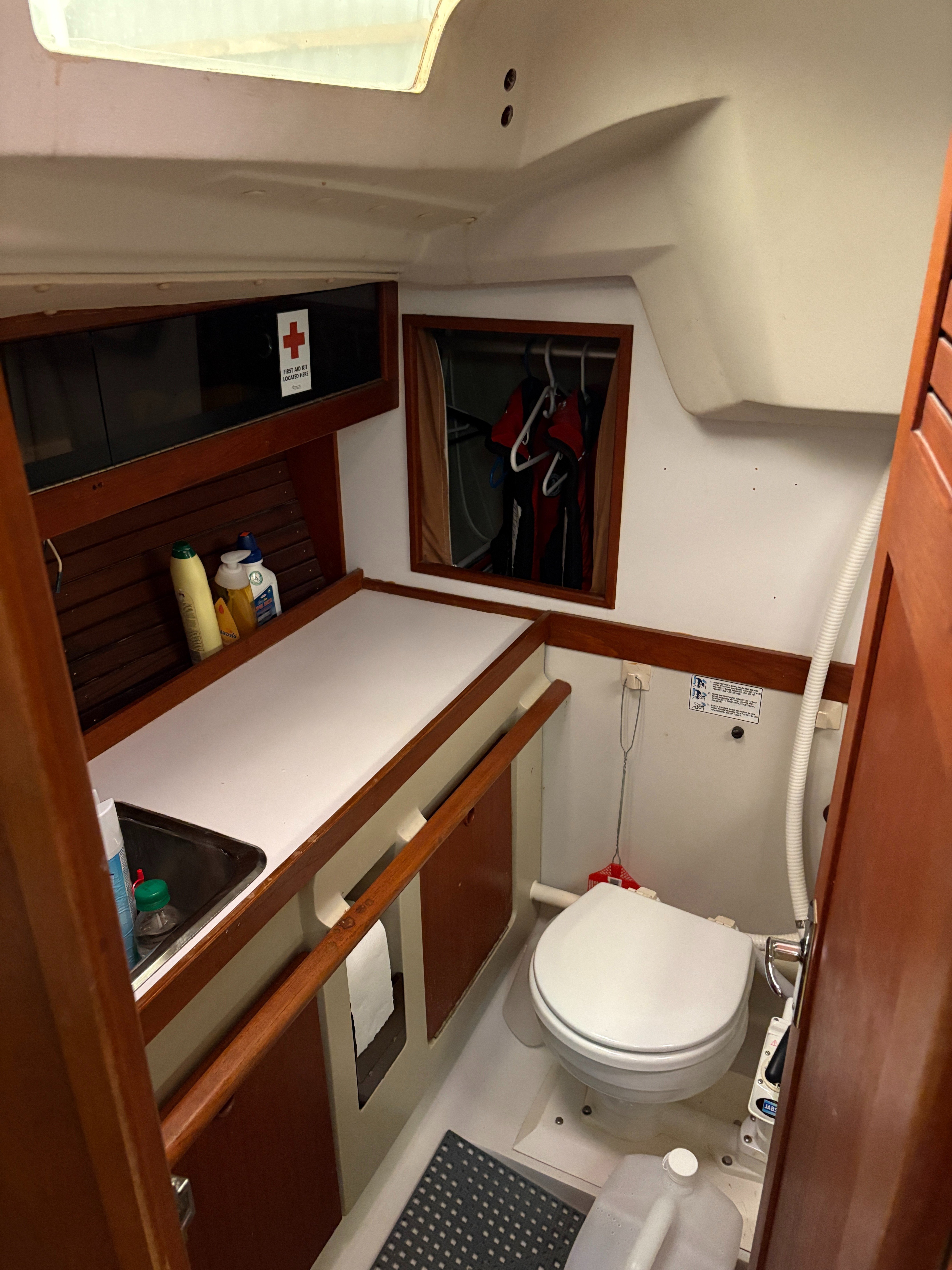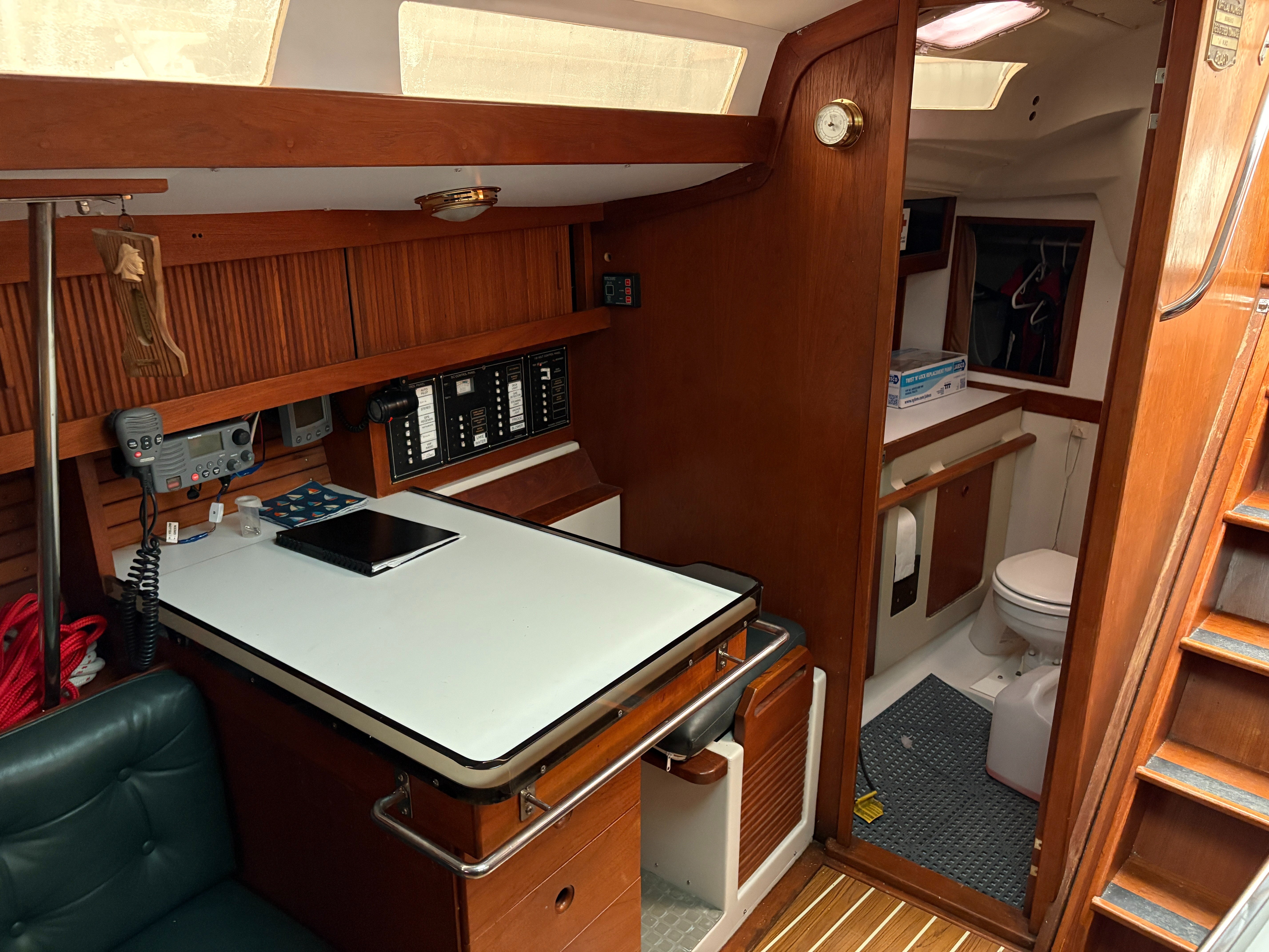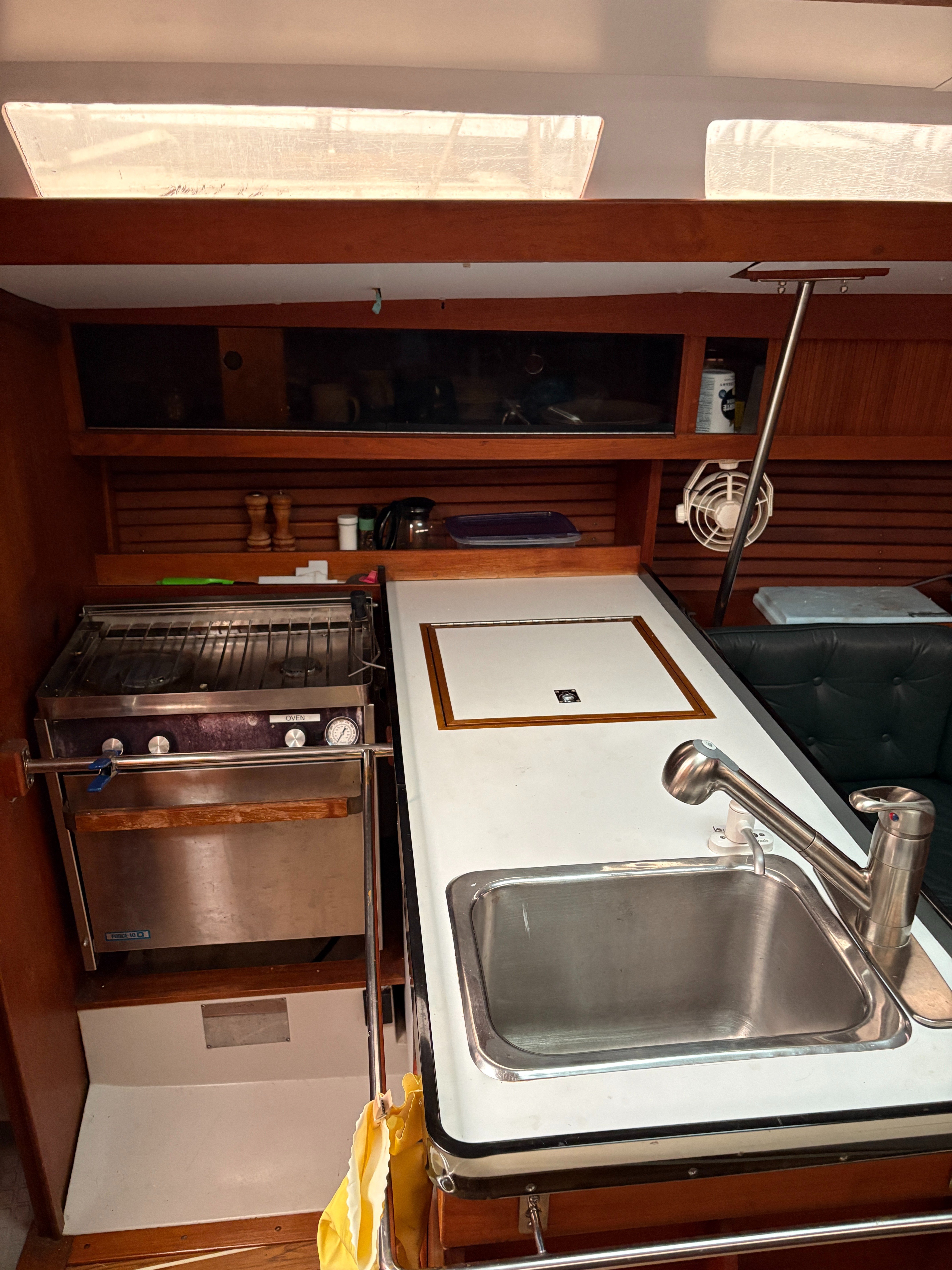 The Express 35 has a comfortable aft cabin, aft head layout with the main salon featuring opposing settees with a centreline drop leaf table. Unique use of acrylics as fiddle rails. The galley is L shaped & has 12V Isotherm refrigeration, hot & cold pressure water, propane stove & oven & sea water pump.