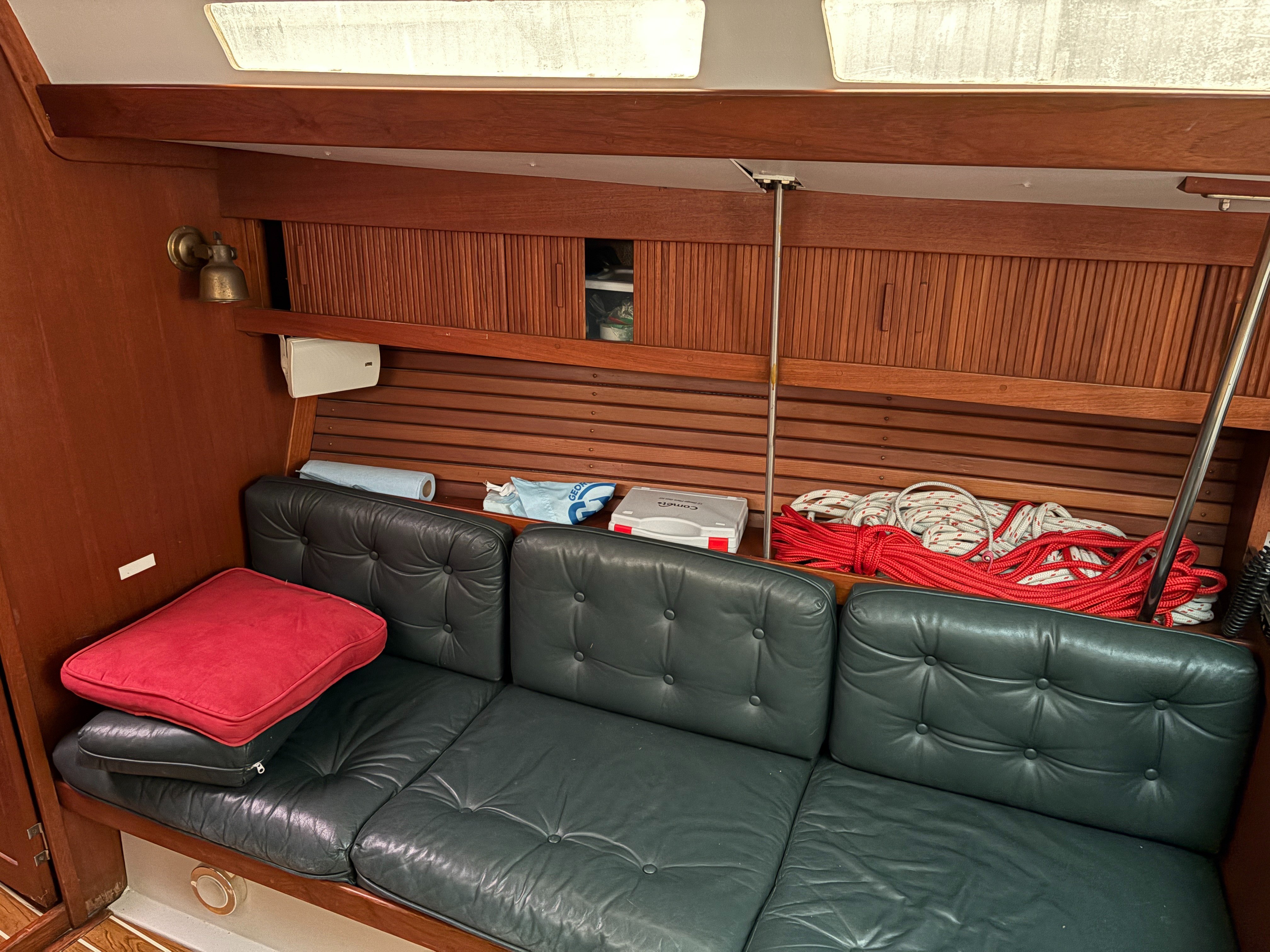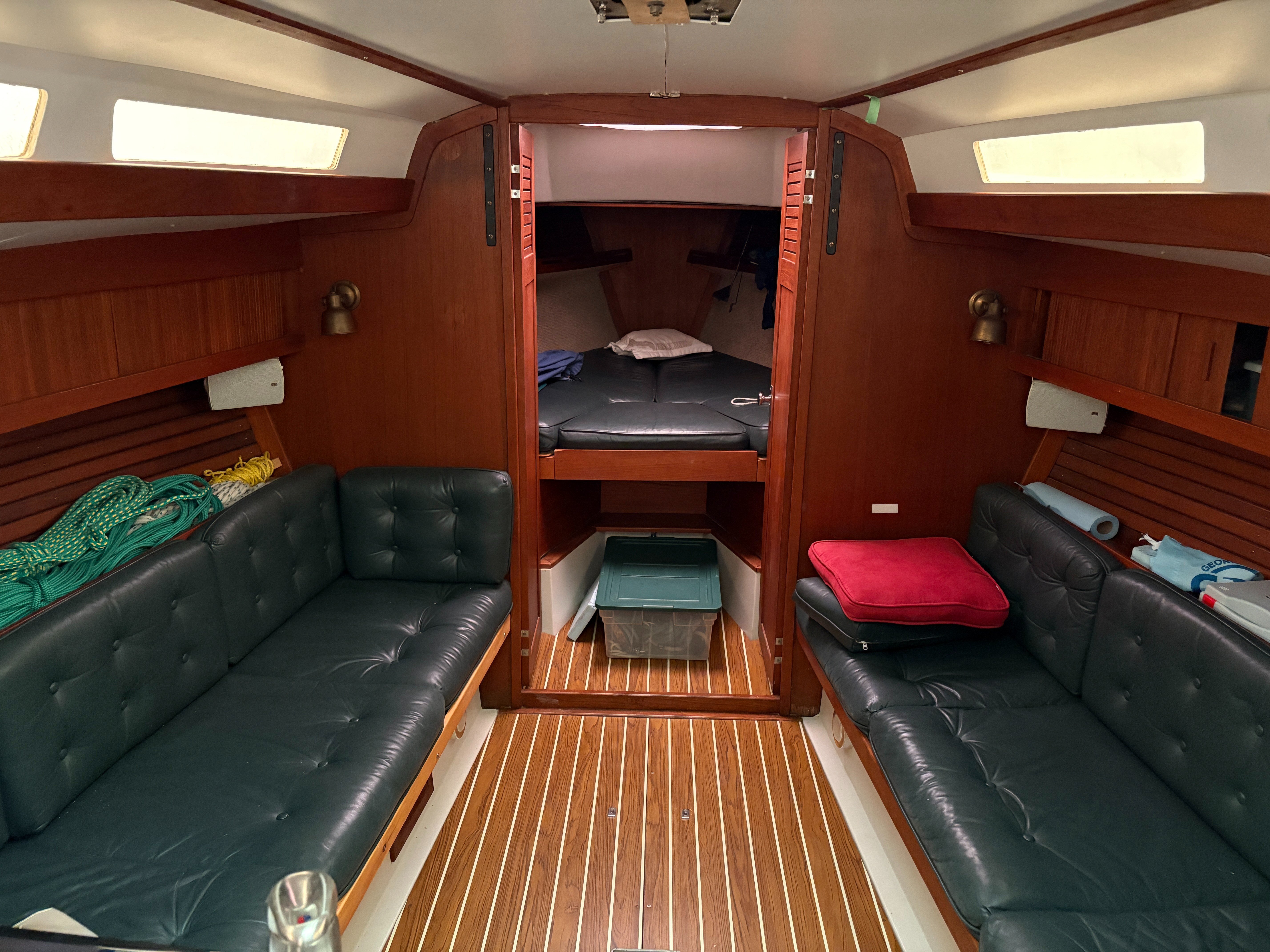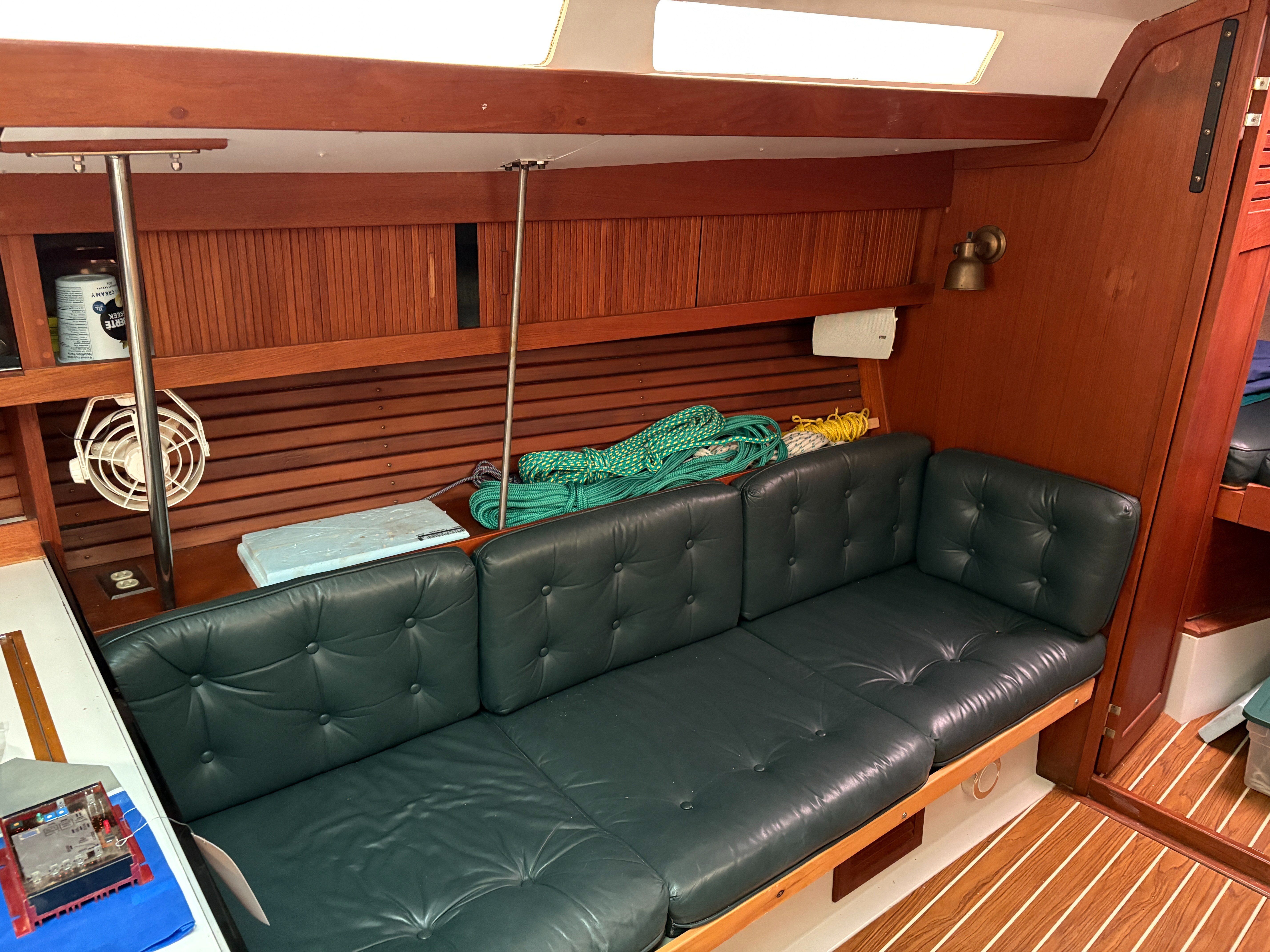 The Express 35 has a comfortable aft cabin, aft head layout with the main salon featuring opposing settees with a centreline drop leaf table. Unique use of acrylics as fiddle rails. The galley is L shaped & has 12V Isotherm refrigeration, hot & cold pressure water, propane stove & oven & sea water pump.