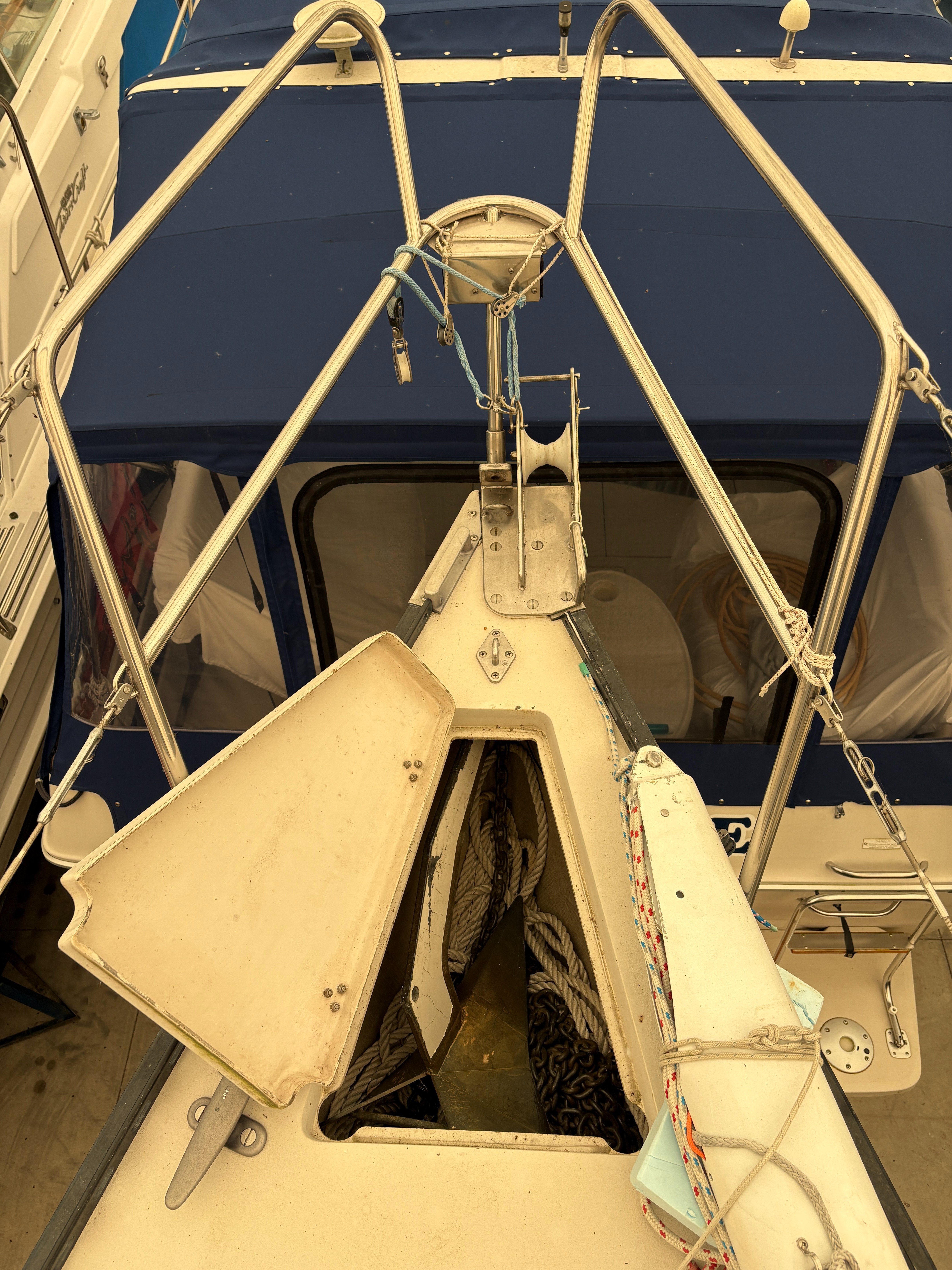 35 lb Lewmar Delta anchor with 50 feet of 5/16 inch high strength chain and 175 ft. of 5/8 inch triple braid premium rope rode