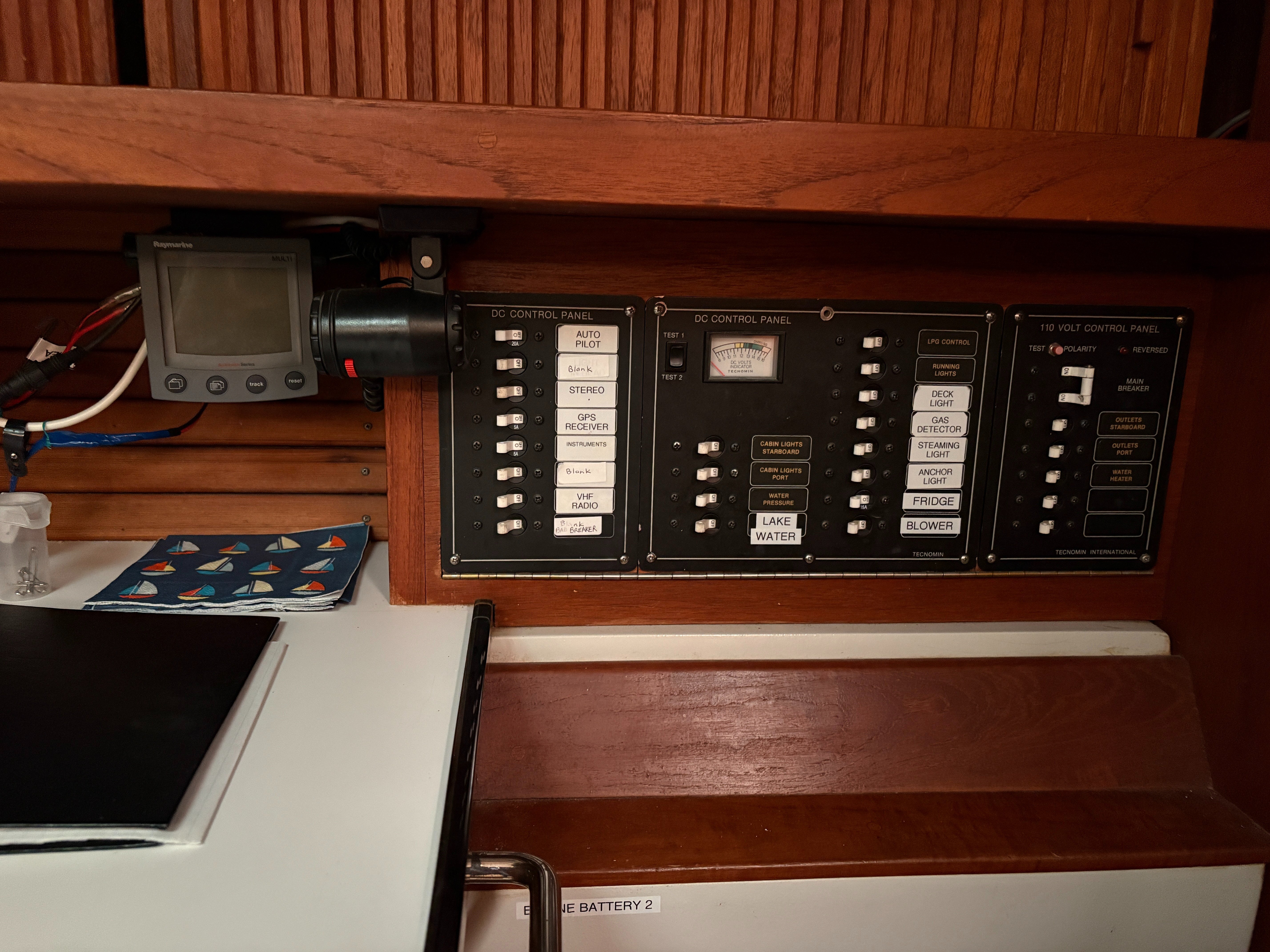 Raymarine VHF radio at navigation station with ST60 multi head display, masthead antenna, internal & external cockpit speakers