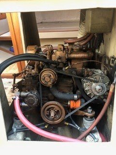 The galley is spacious with double sinks, hot & cold pressure water, 12v refrigeration & a Force 10 propane stove with oven. Ample lockers & drawers.