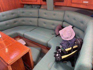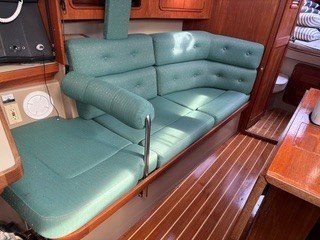 Teak & holly cabin sole, leather upholstery, sit down navigation station. Cabin heater.