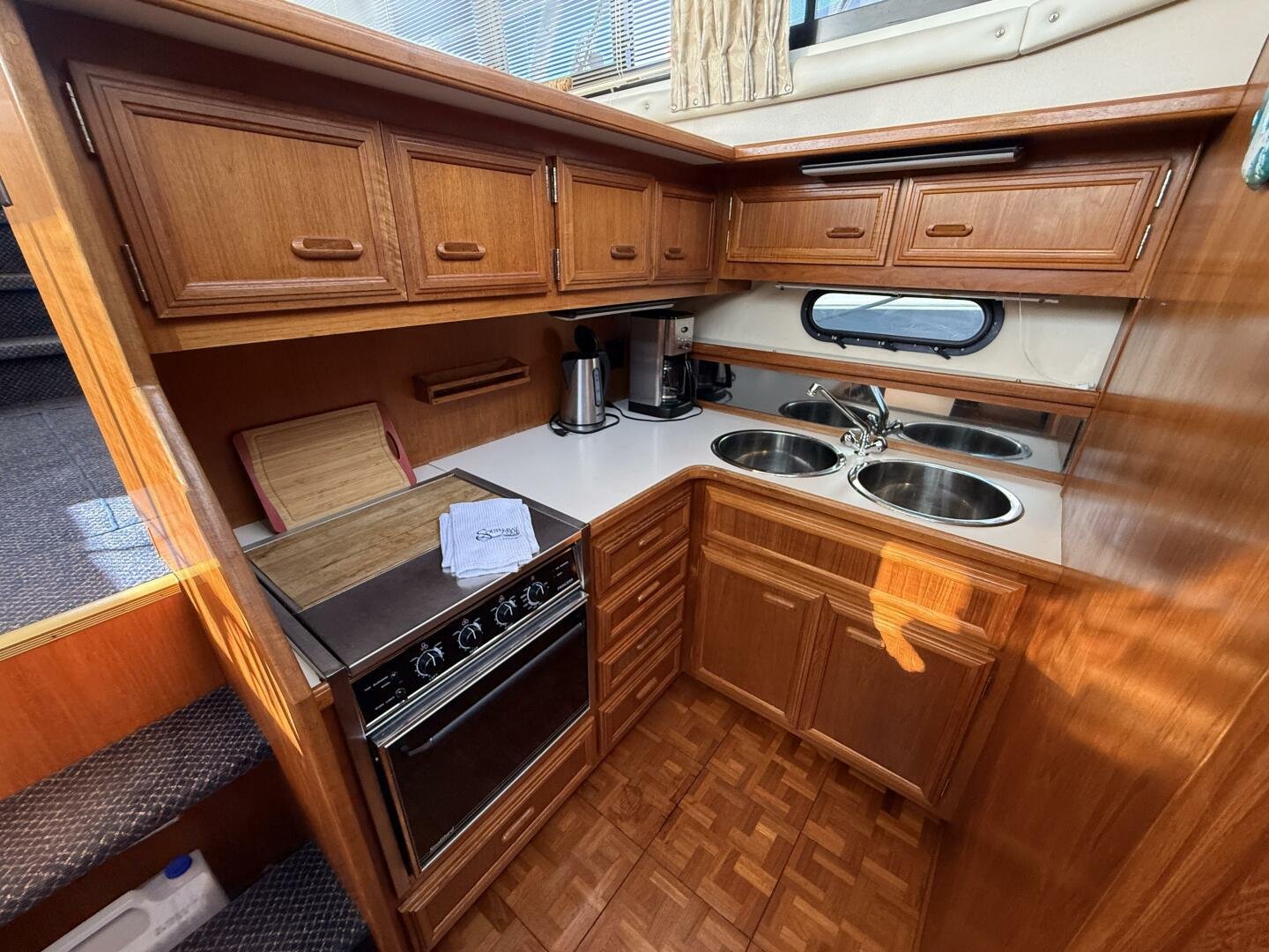 GALLEY: Spacious galley with double basin stainless steel sinks. Opening portlight for ventilation and under-counter lighting.