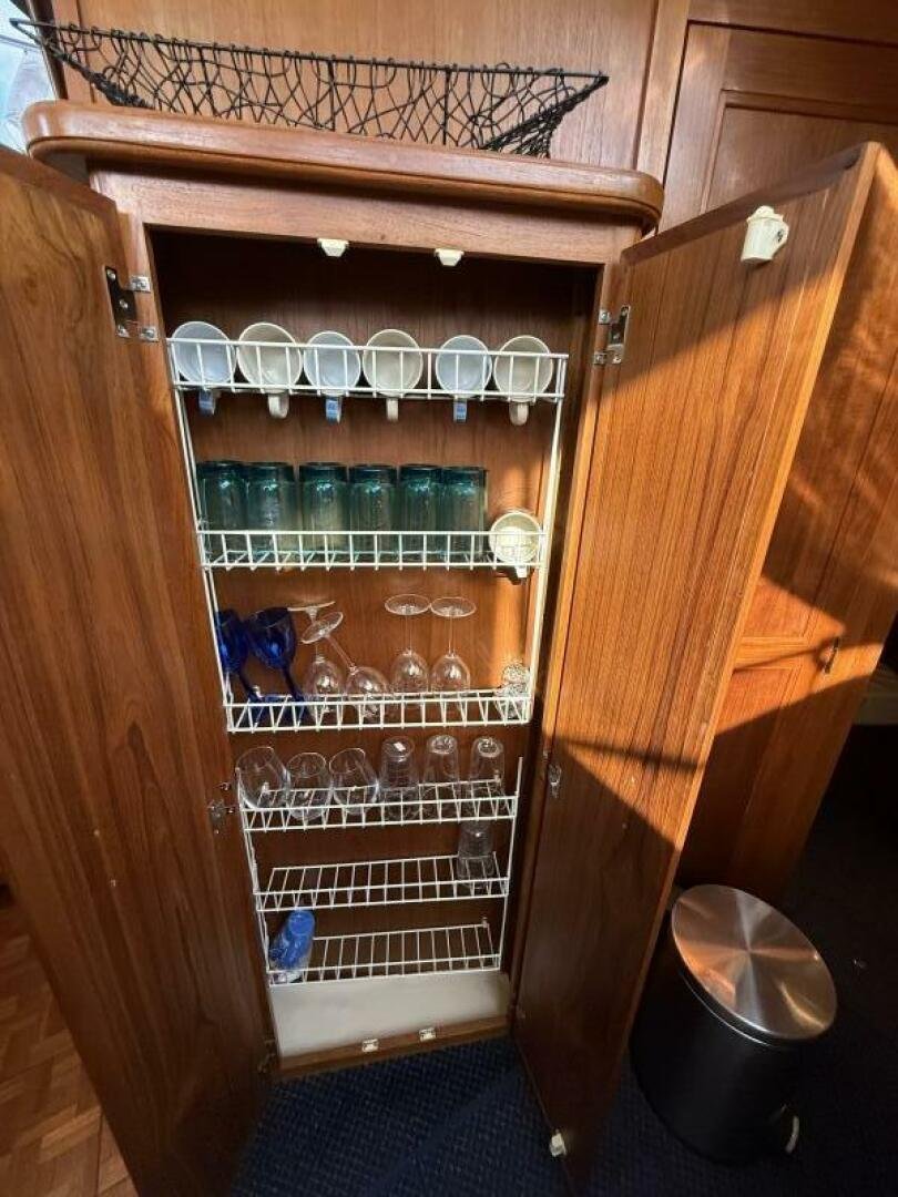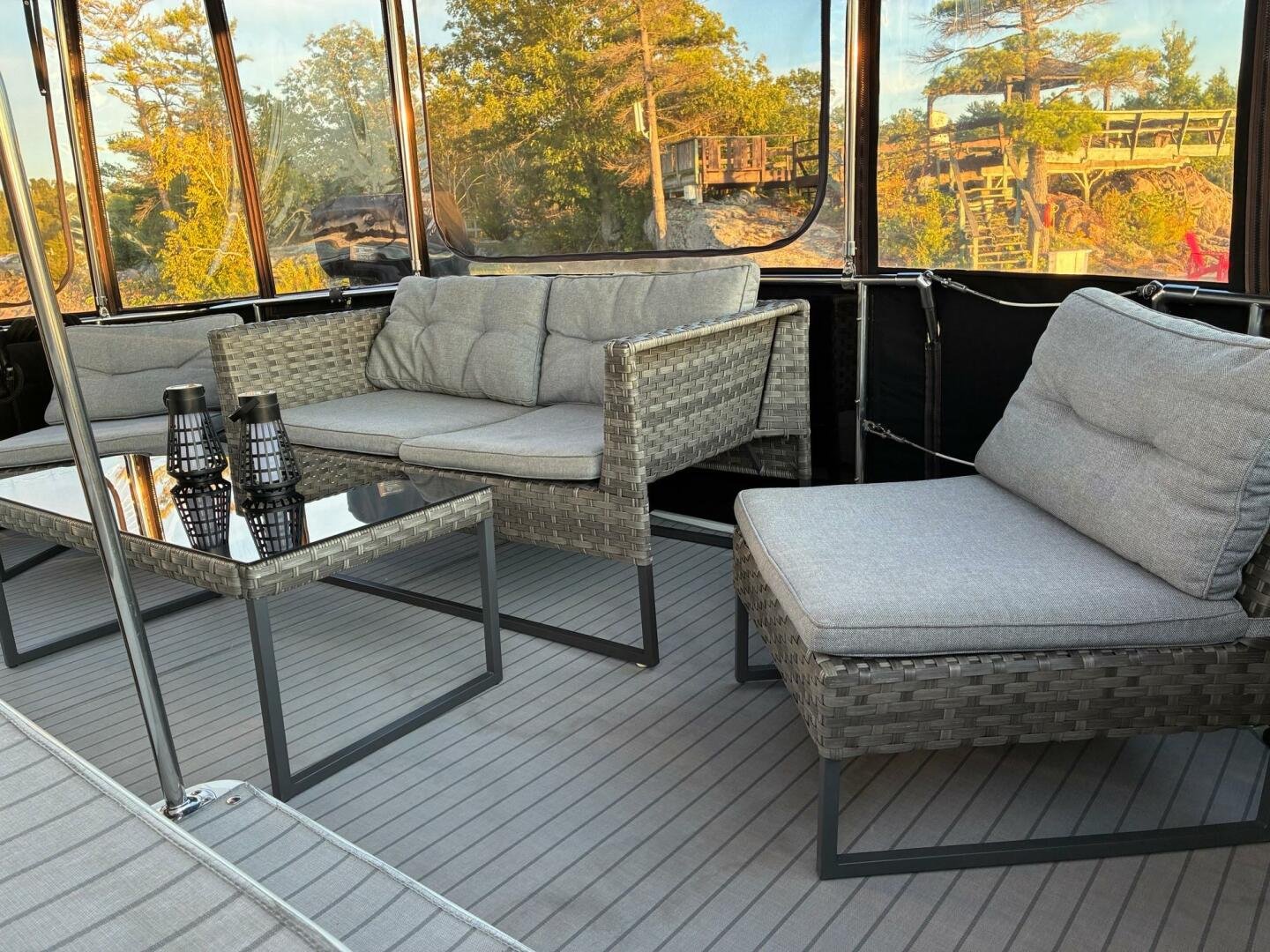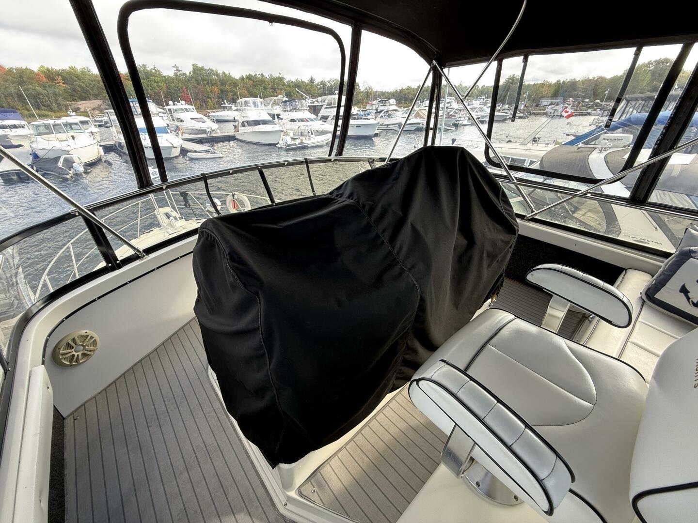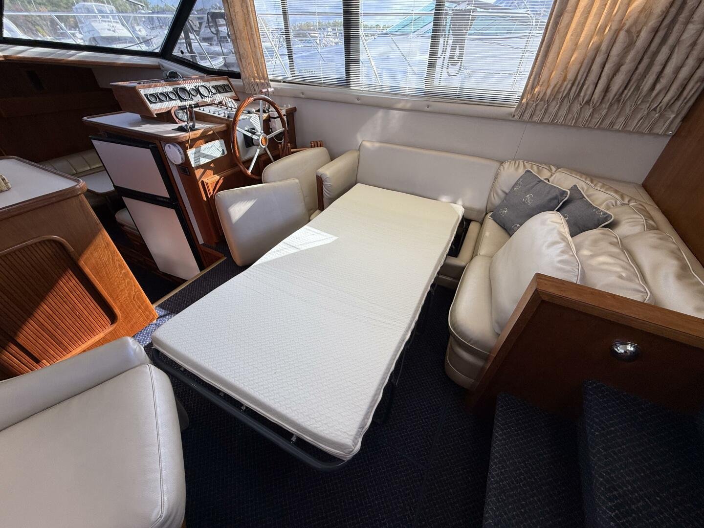 Outside, the aft deck provides a versatile entertaining space with plenty of room for chairs and tables, all protected by a full enclosure. Wide side decks and sturdy railings make moving forward easy, while the flybridge offers excellent visibility and additional seating for guests.