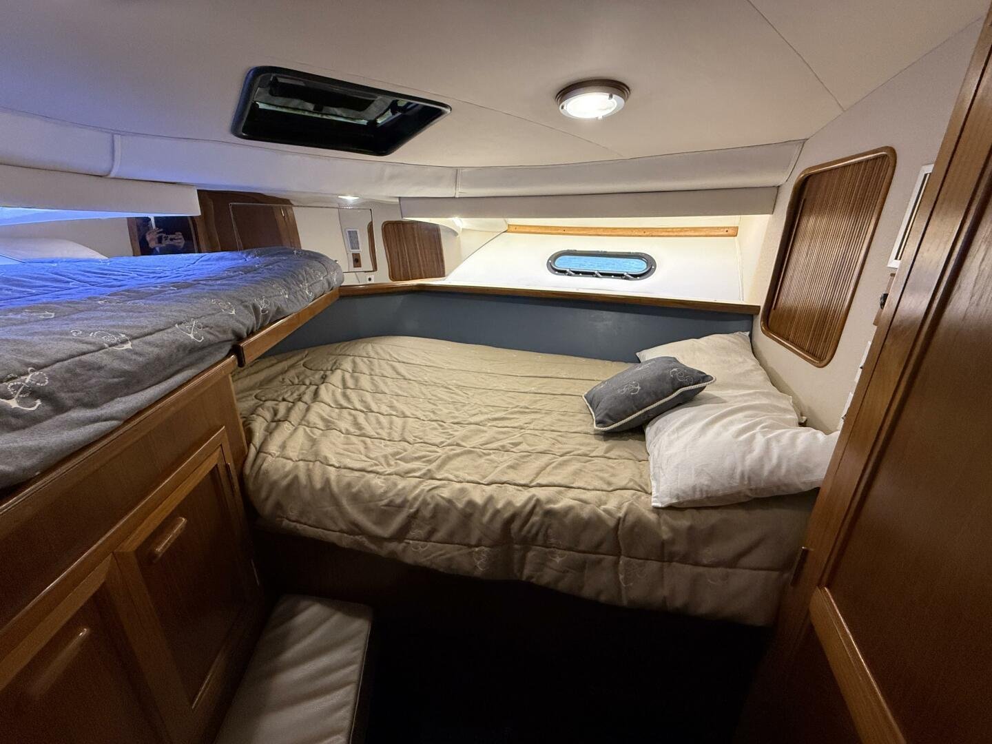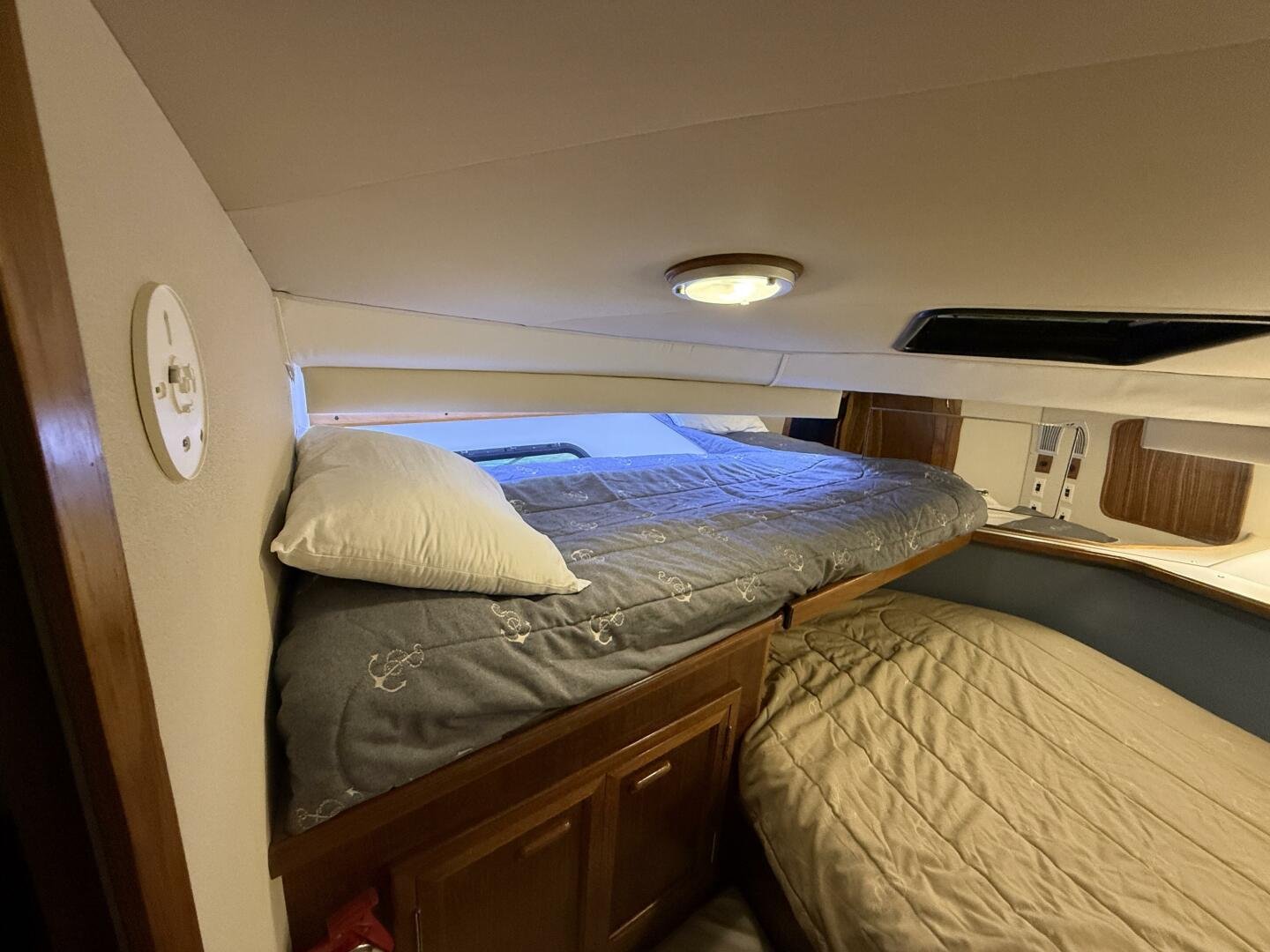 Forward Cabin: Twin berths with an upper single bunk to port, ample storage beneath, and private access to the forward head.