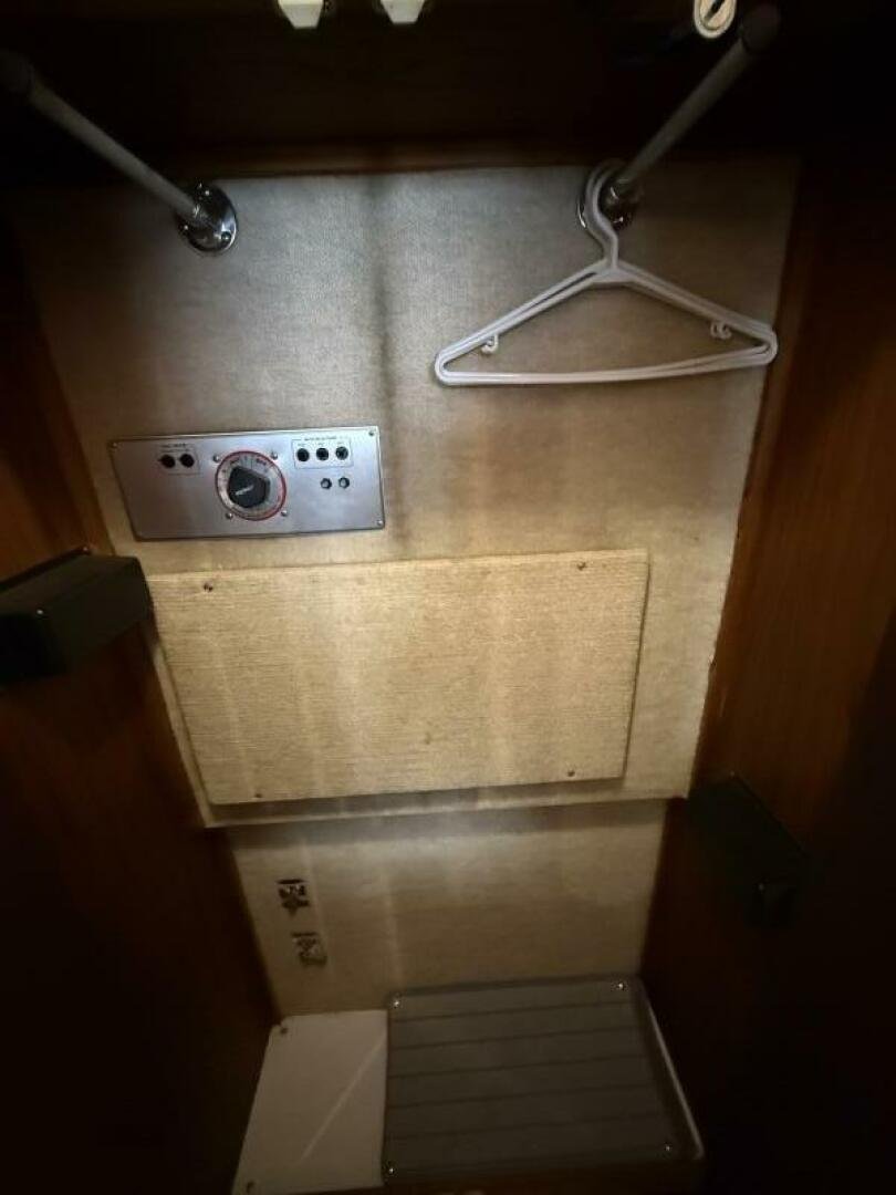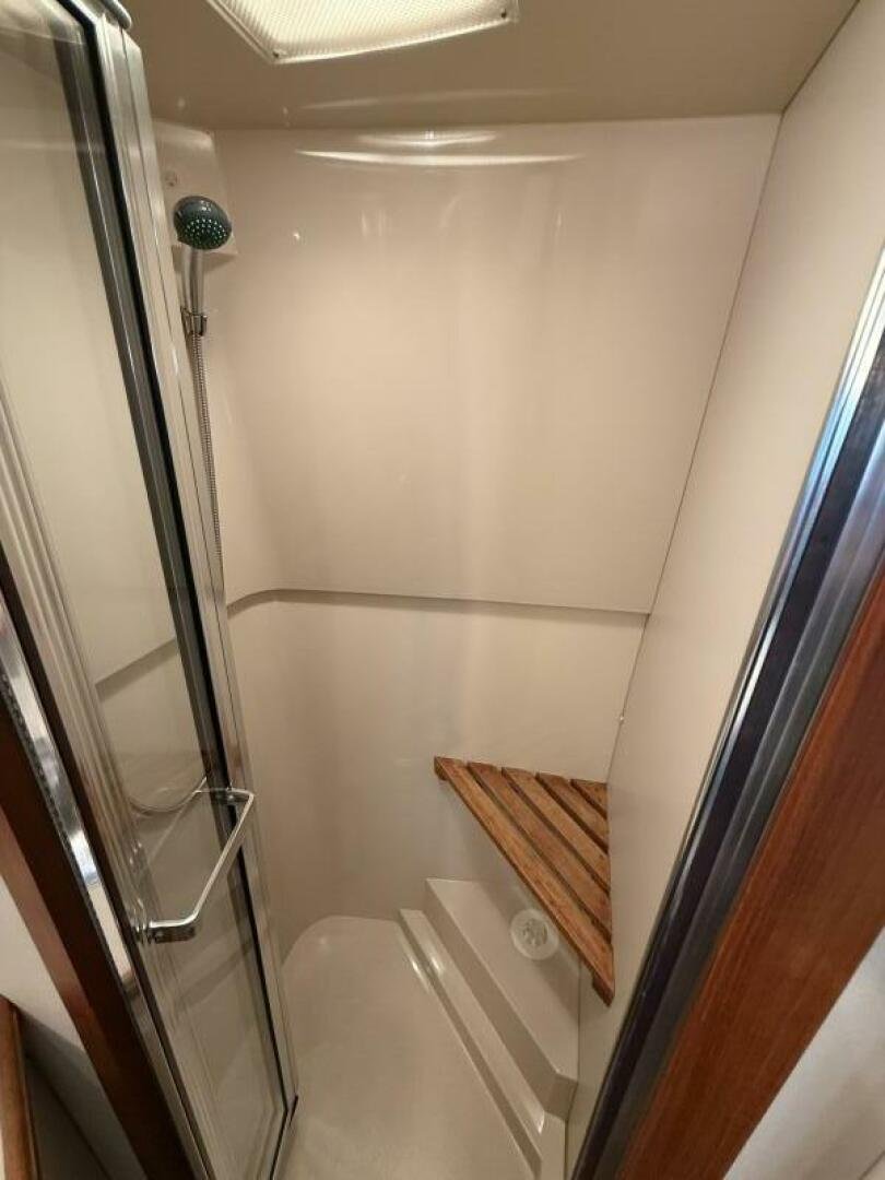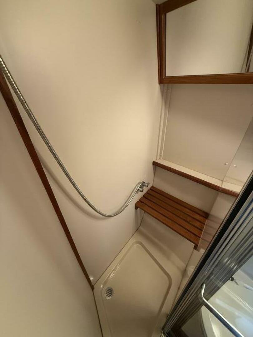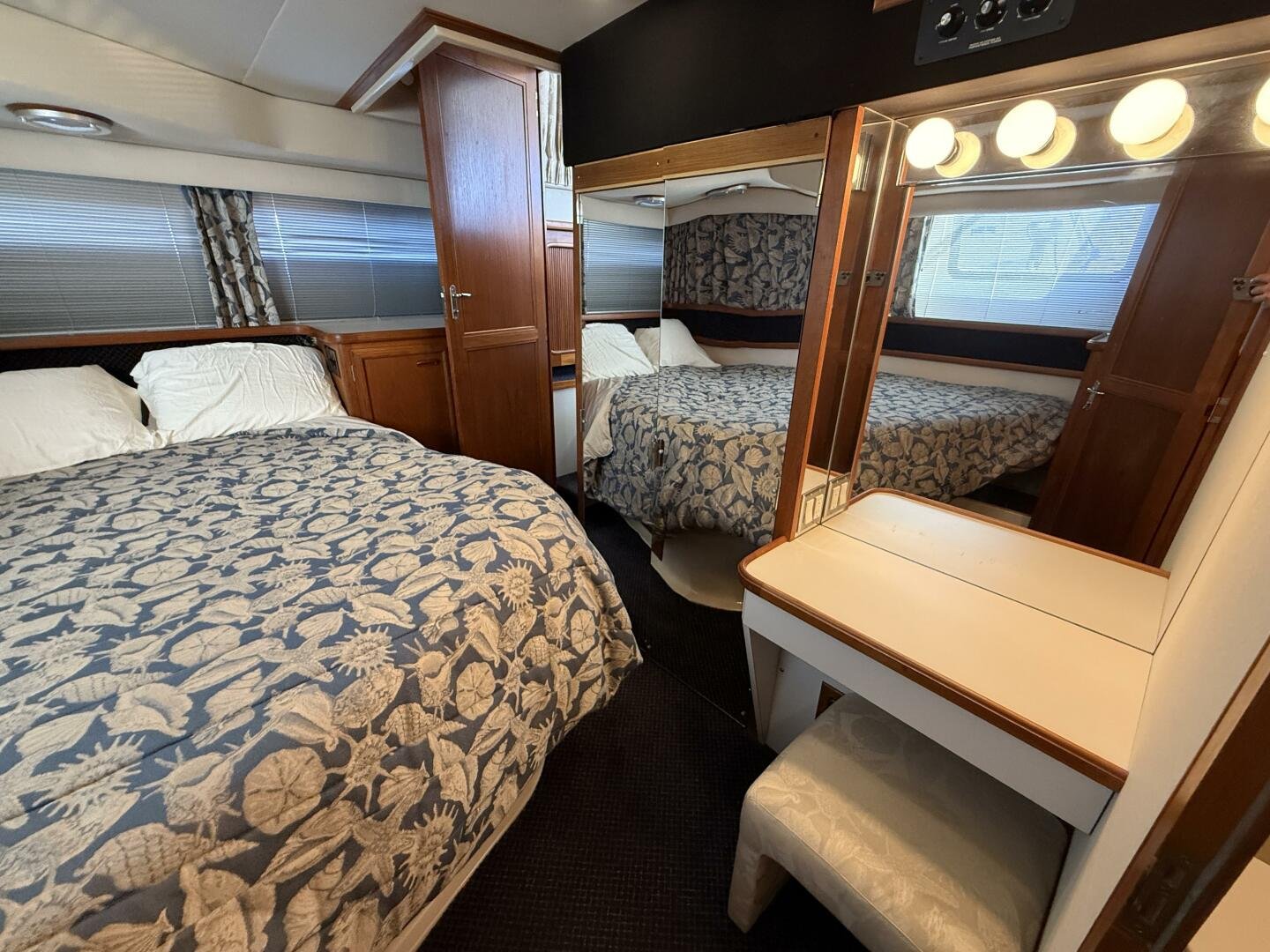 Aft-Cabin: Spacious master suite with a private head and shower. The angled berth provides easy walkaround access for making the bed, and there are ample storage lockers and drawers for extended stays onboard.
