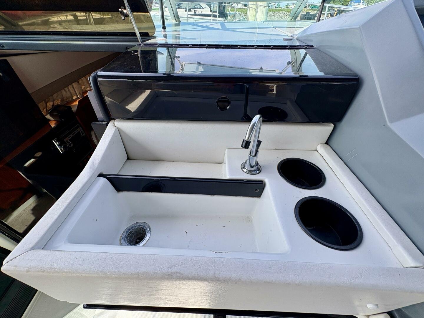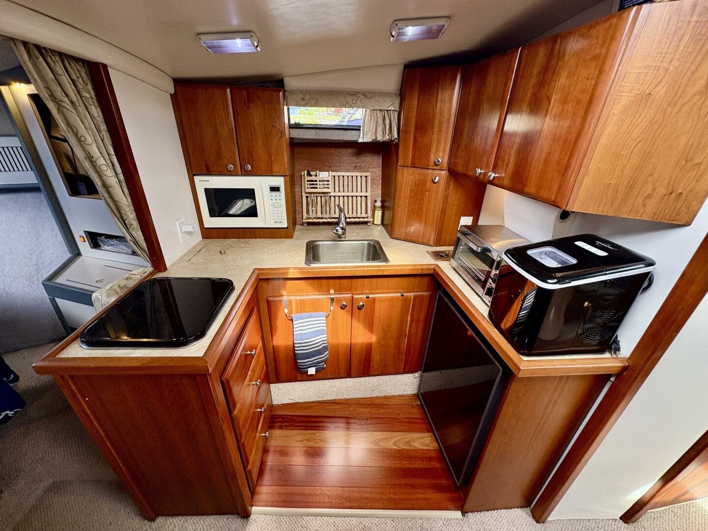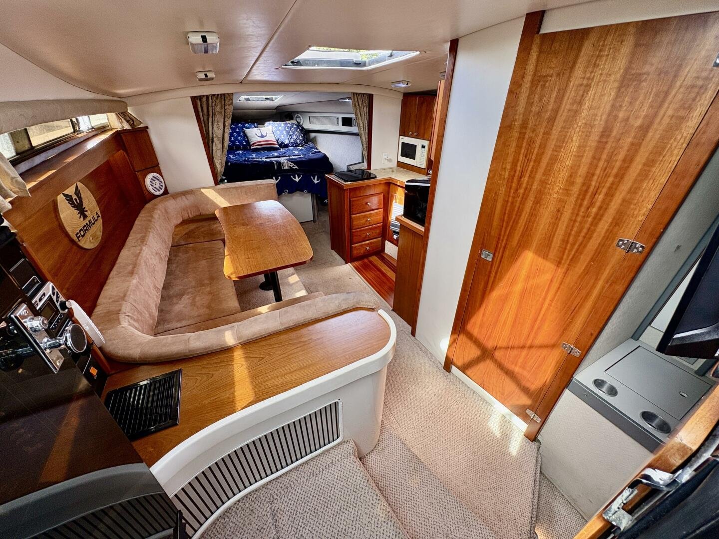 The Largest of the Formula PC (Performance Cruiser) fleet in the late 1980s, the 35 PC is a roomy family express cruiser. The PC's wide-open floorplan includes a superb U-shaped galley area-still among the best found in any express boat this size-and a step-down mid-cabin with facing settees that convert into a big double bed at night. There's a centerline island berth in the forward stateroom (with a draw curtain for night time privacy). The cockpit is arranged with a big L-shaped lounge opposite the helm and foldaway bench seating at the transom. Additional features include side-dumping exhausts, a transom door, bow pulpit, radar arch, and swim platform. Construction is solid fiberglass, and her deep-V hull is designed with prop pockets to reduce the draft. Accessed via a motorized hatch lift, twin 340hp MerCruiser 7.4L Bluewater engines (with V-drives) will cruise the Formula 35 PC at 21-22 knots and reach a top speed of around 30 knots.