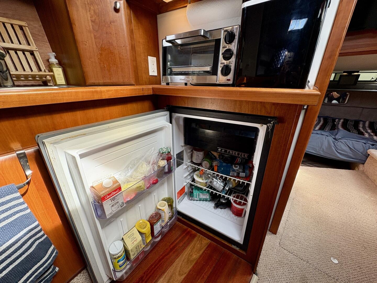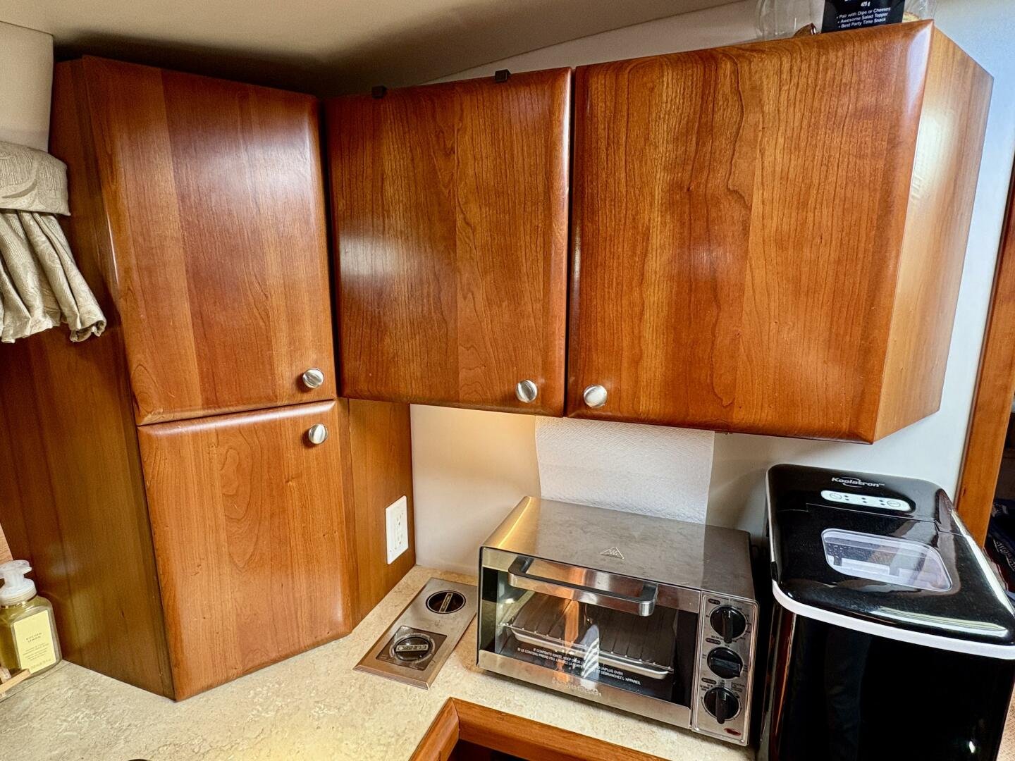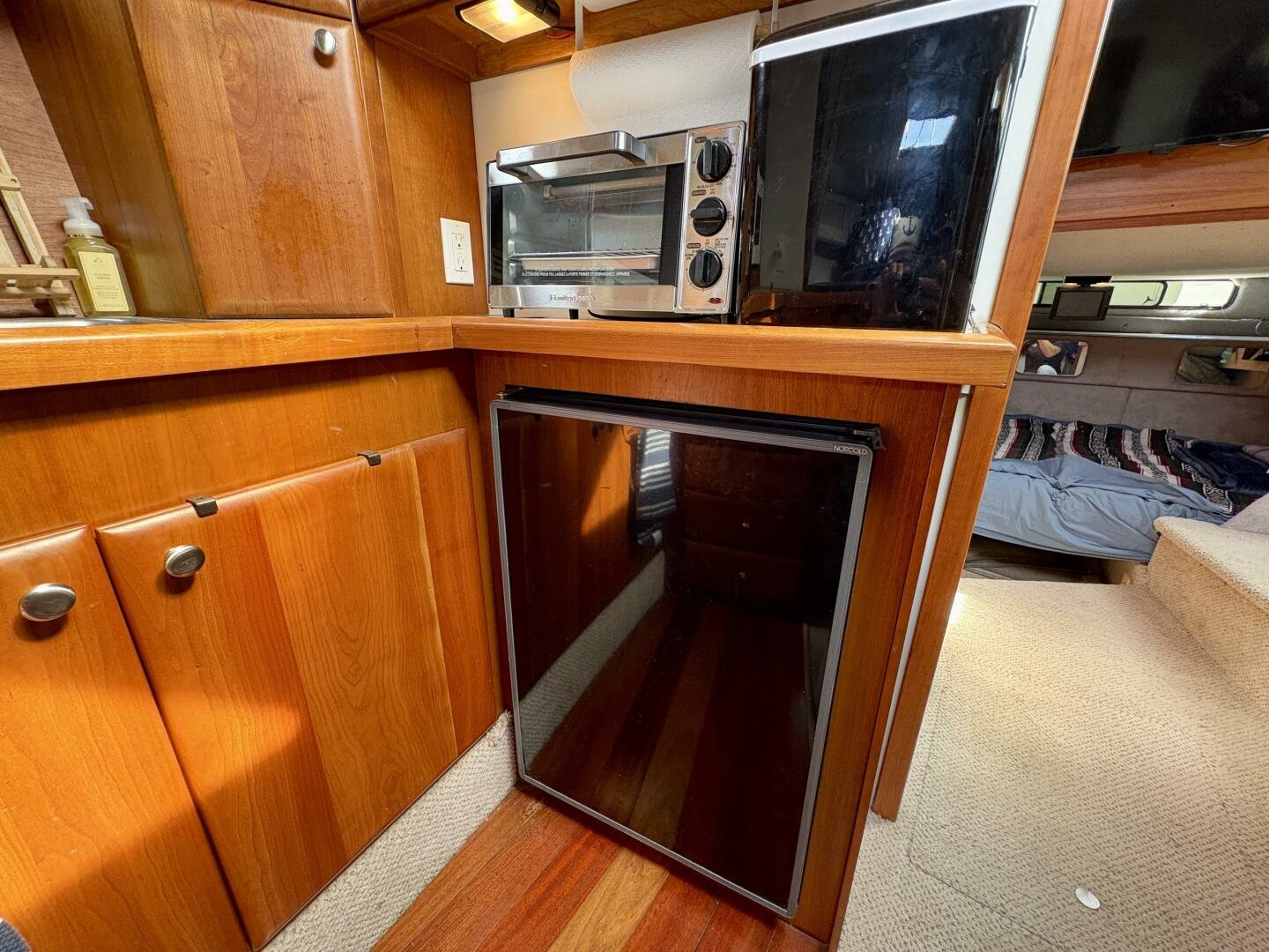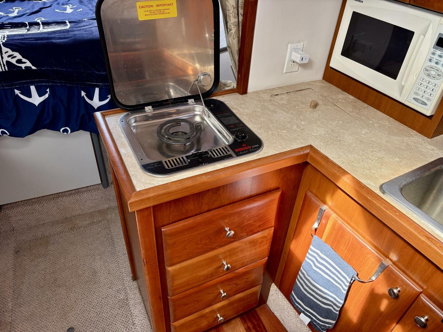 The Largest of the Formula PC (Performance Cruiser) fleet in the late 1980s, the 35 PC is a roomy family express cruiser. The PC's wide-open floorplan includes a superb U-shaped galley area-still among the best found in any express boat this size-and a step-down mid-cabin with facing settees that convert into a big double bed at night. There's a centerline island berth in the forward stateroom (with a draw curtain for night time privacy). The cockpit is arranged with a big L-shaped lounge opposite the helm and foldaway bench seating at the transom. Additional features include side-dumping exhausts, a transom door, bow pulpit, radar arch, and swim platform. Construction is solid fiberglass, and her deep-V hull is designed with prop pockets to reduce the draft. Accessed via a motorized hatch lift, twin 340hp MerCruiser 7.4L Bluewater engines (with V-drives) will cruise the Formula 35 PC at 21-22 knots and reach a top speed of around 30 knots.