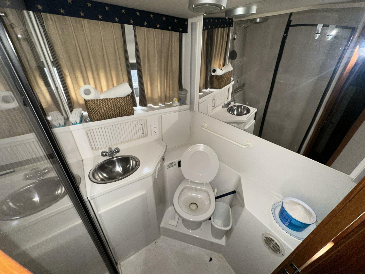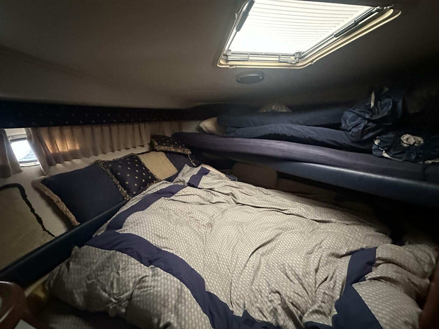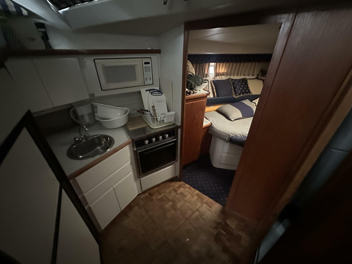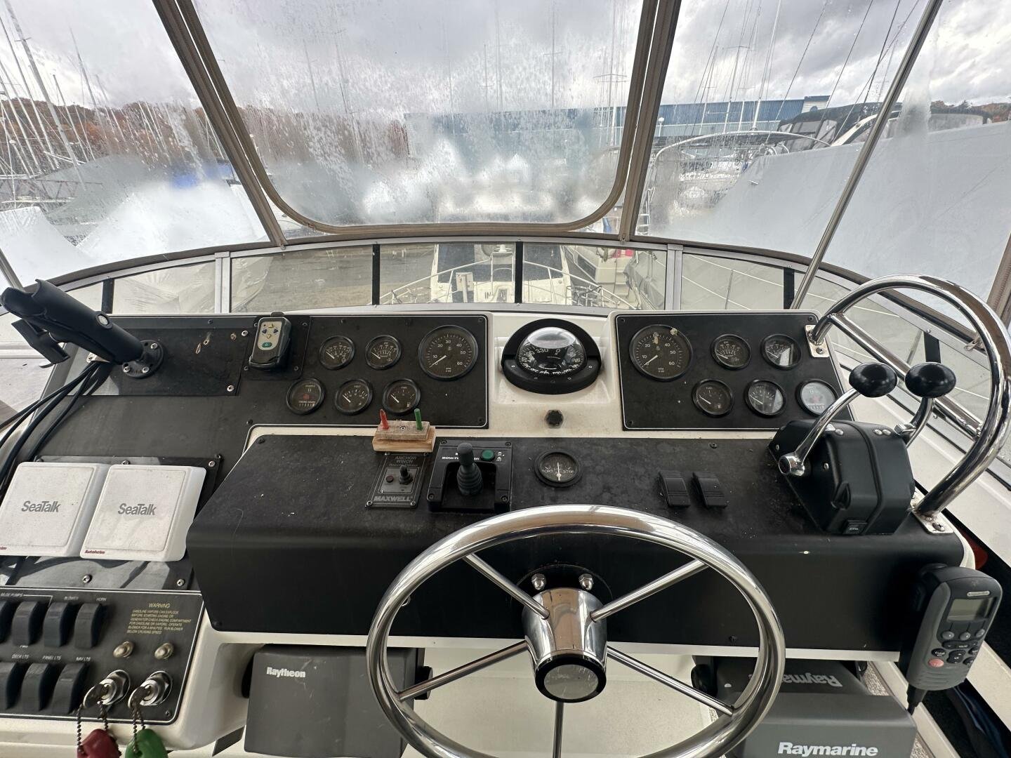 At the helm there you have a Raymarine chart plotter, VHF, autopilot, and through hull bow thruster controls. Down below you have an expansive salon with access to the generator and engines. There is also a large entertainment center. Stepping down you have a well-appointed galley with oven, three burner stove, sink, coffee maker, and 3/4 fridge/freezer. At the bow you have the secondary stateroom and day head. The master is in the aft, with a large bed and separate head/shower.