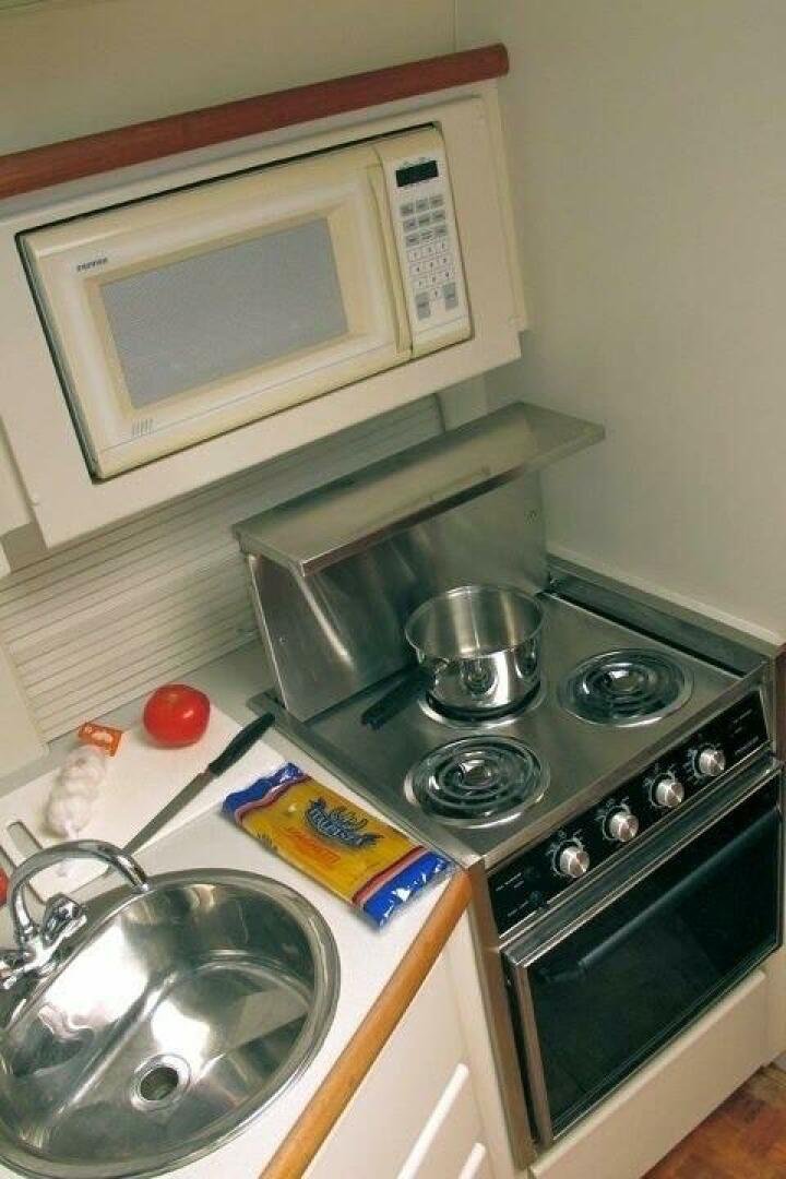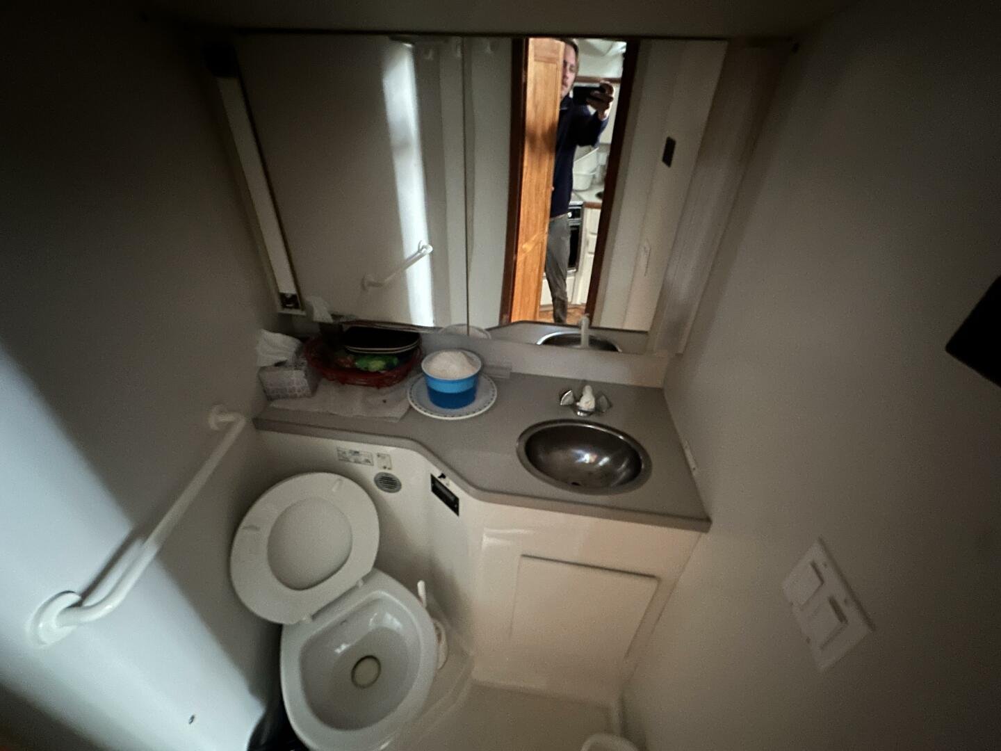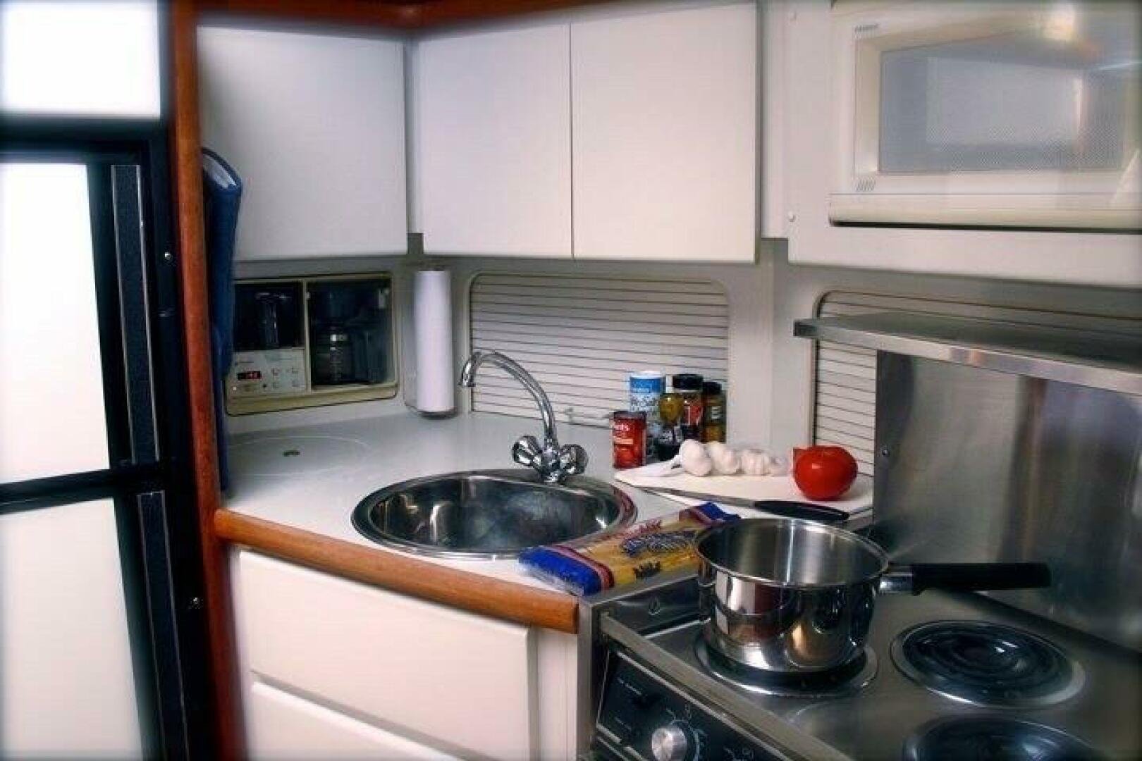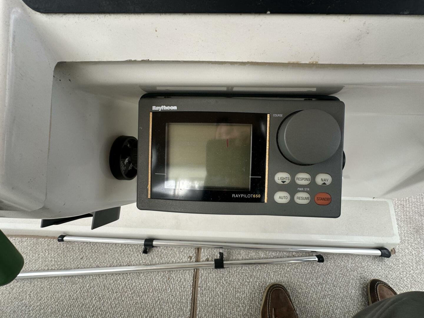 At the helm there you have a Raymarine chart plotter, VHF, autopilot, and through hull bow thruster controls. Down below you have an expansive salon with access to the generator and engines. There is also a large entertainment center. Stepping down you have a well-appointed galley with oven, three burner stove, sink, coffee maker, and 3/4 fridge/freezer. At the bow you have the secondary stateroom and day head. The master is in the aft, with a large bed and separate head/shower.