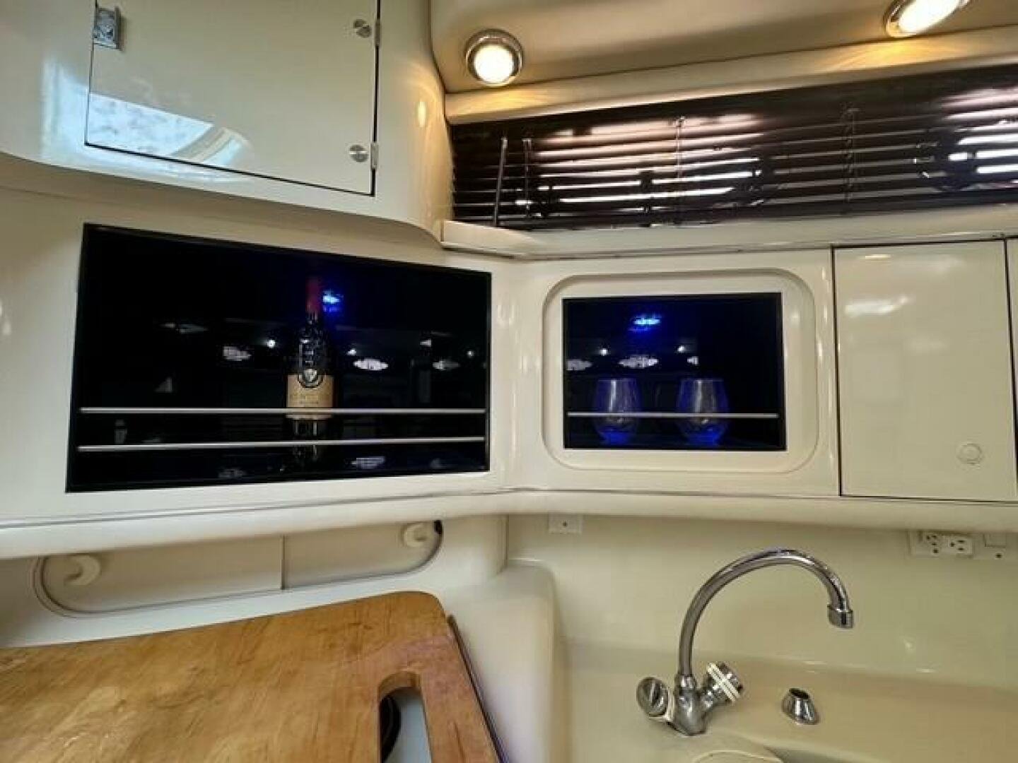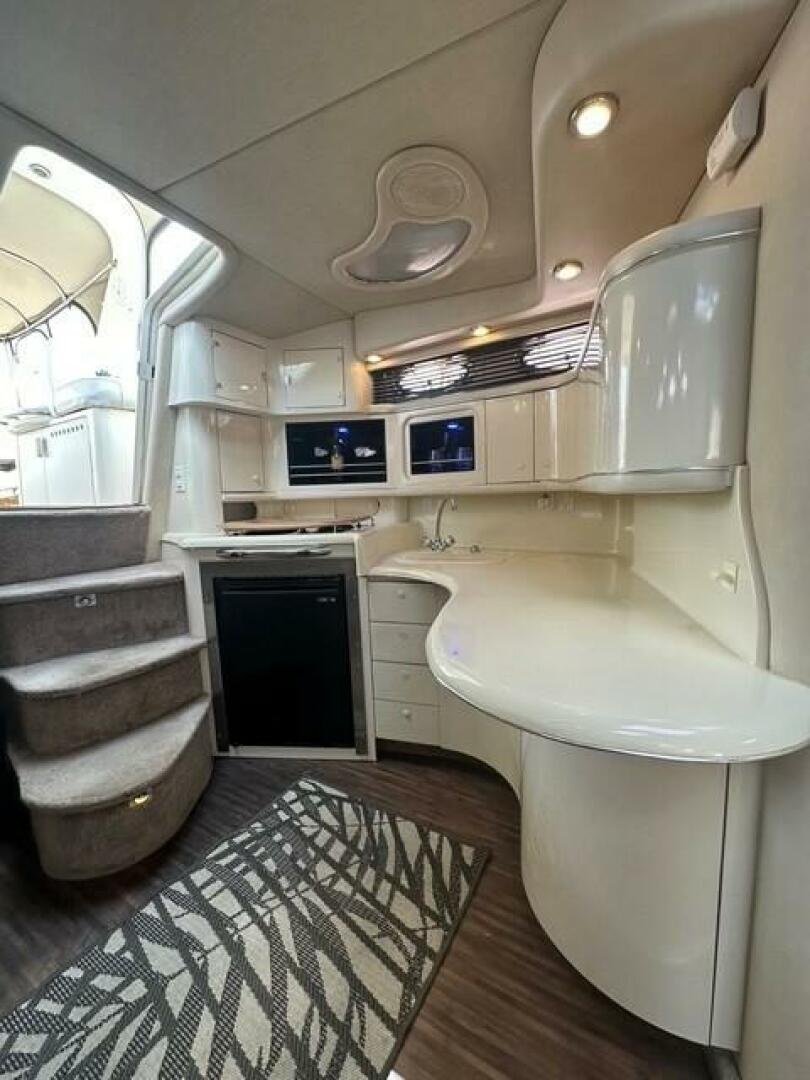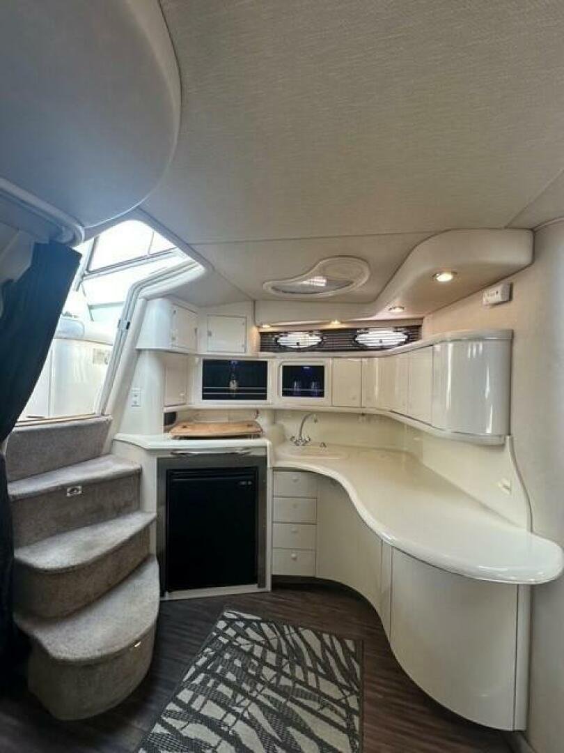 • Fully equipped galley with a 3-burner electric stove, refrigerator, microwave, and ample storage.