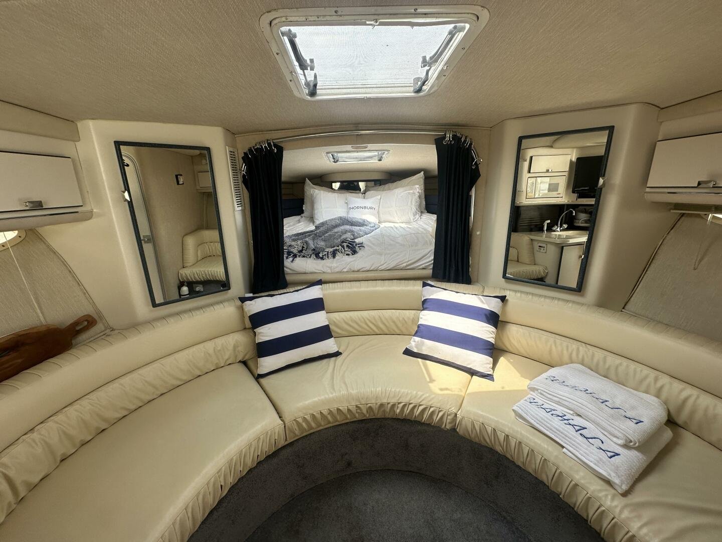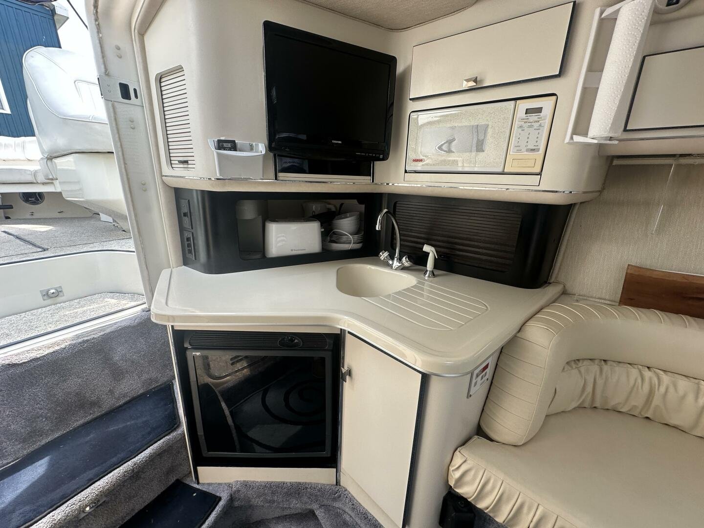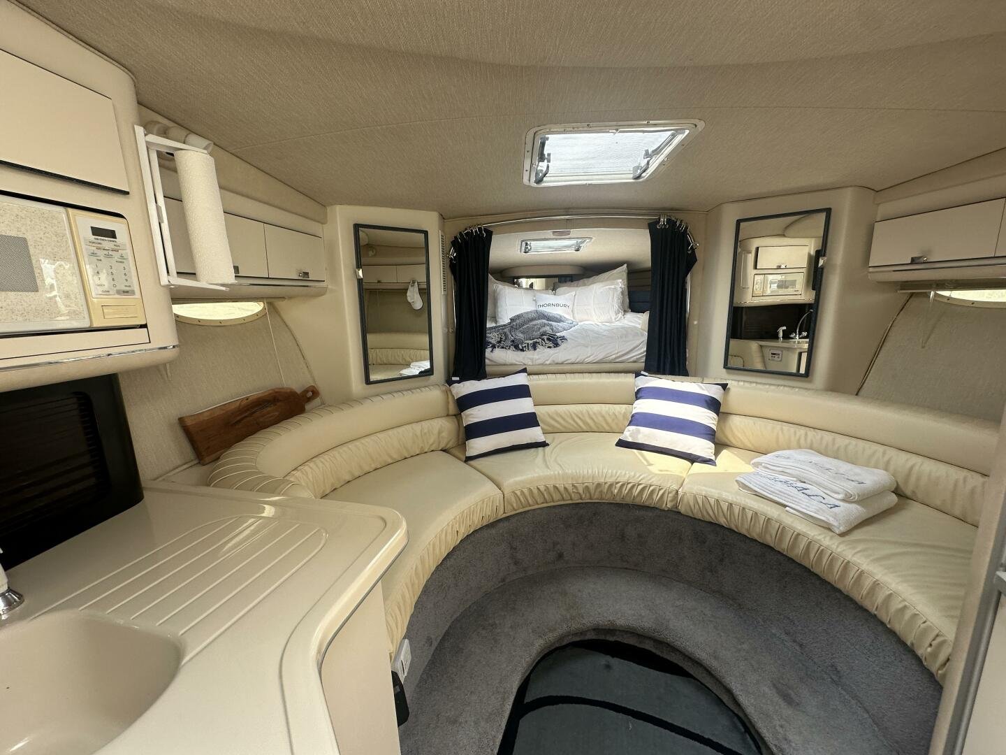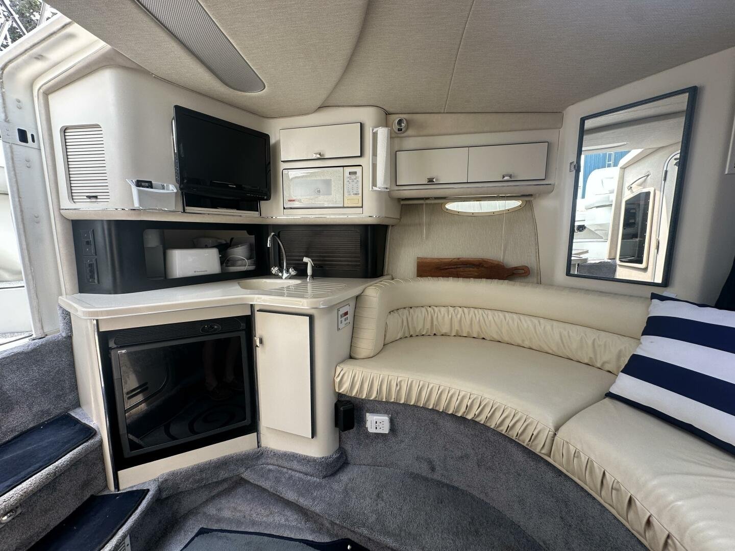Down below there is a large seating area and ample storage. The galley has a sink, fridge, microwave, and coffee maker. On the starboard side there is a wet head and vaccu flush toilet system. In the bow area, you will find a large centerline bed.