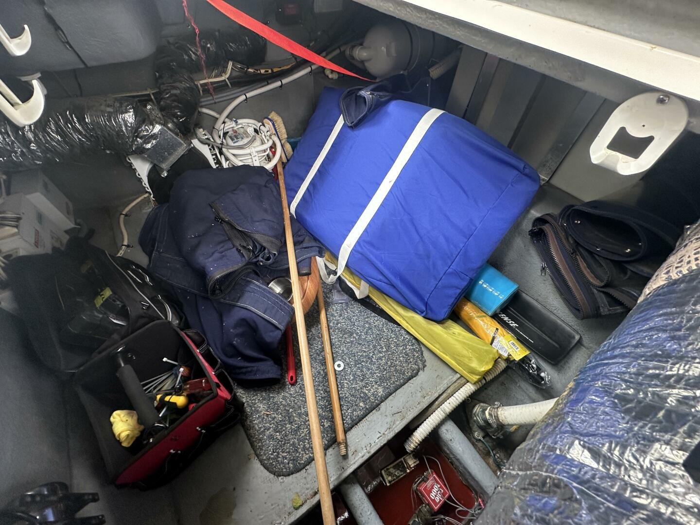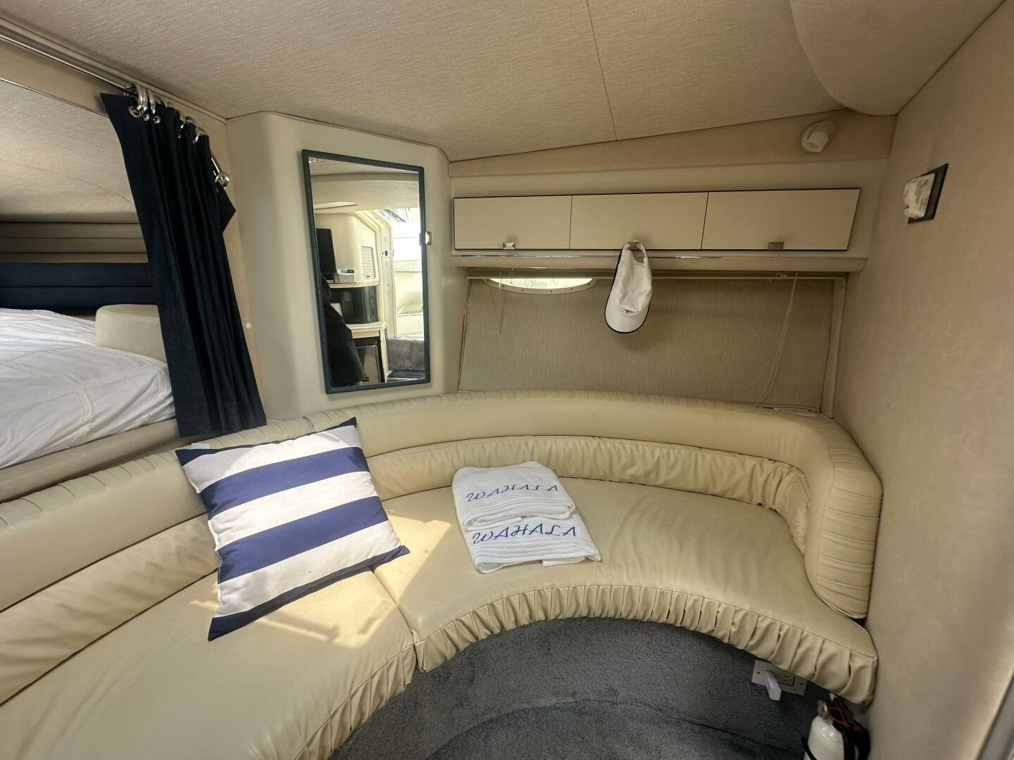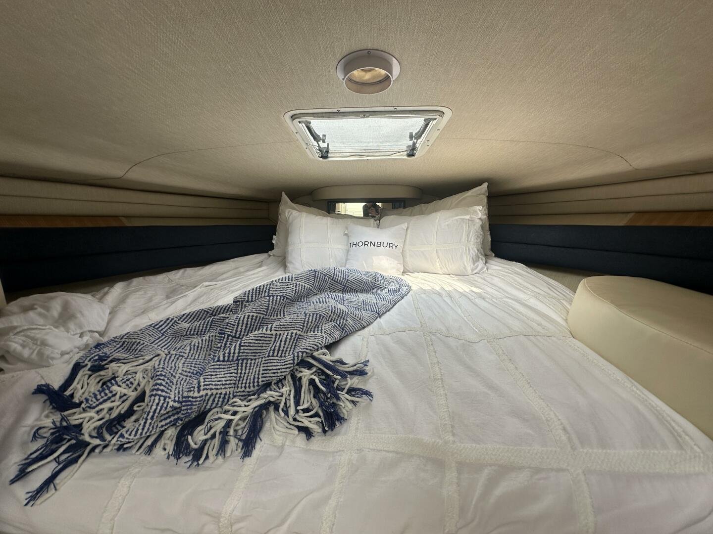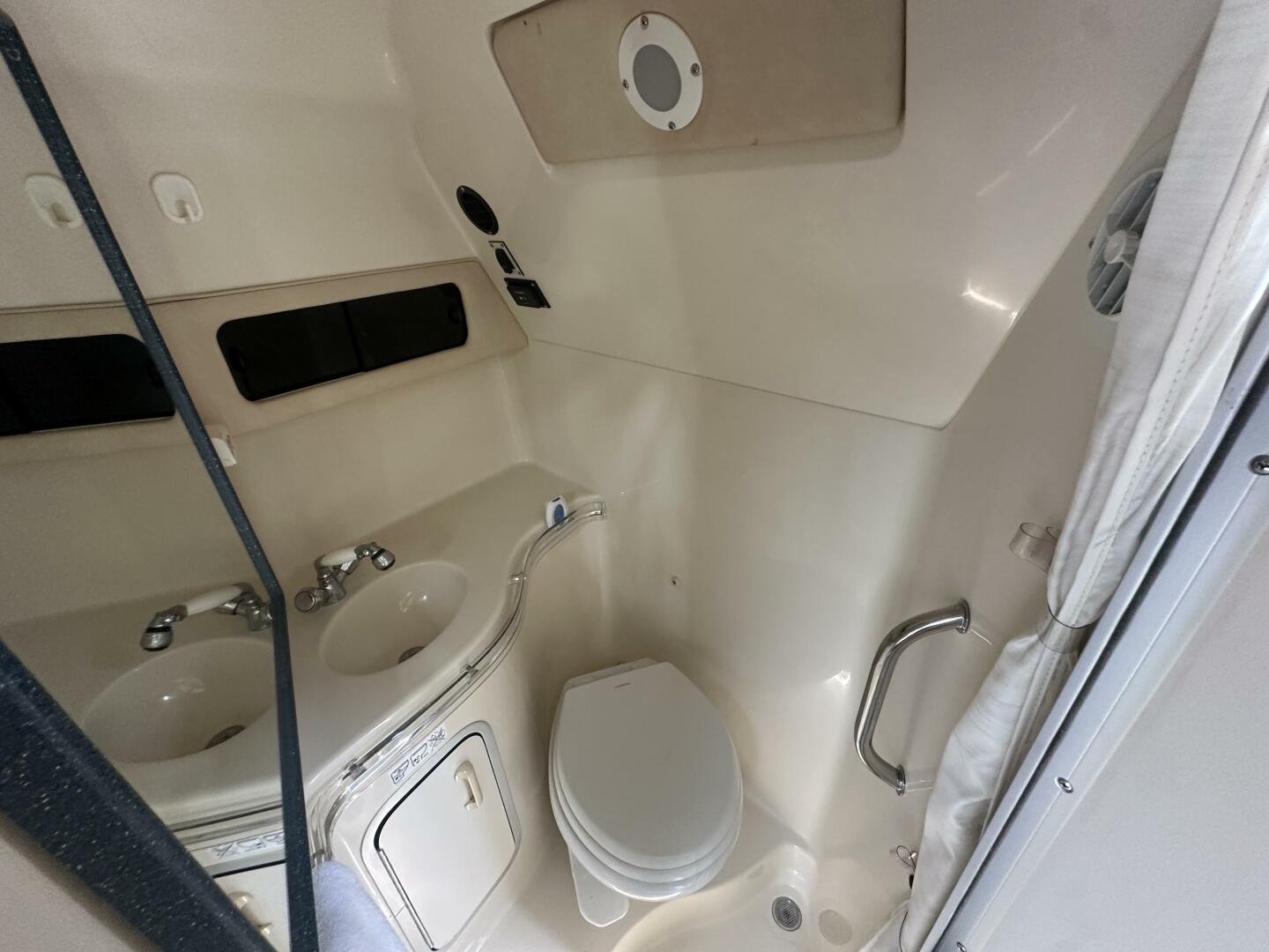 Down below there is a large seating area and ample storage. The galley has a sink, fridge, microwave, and coffee maker. On the starboard side there is a wet head and vaccu flush toilet system. In the bow area, you will find a large centerline bed.