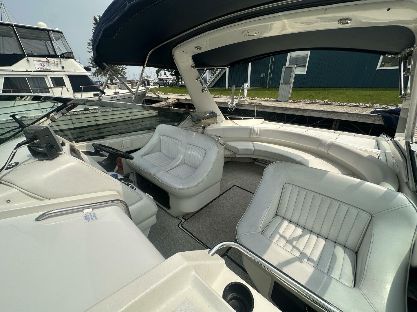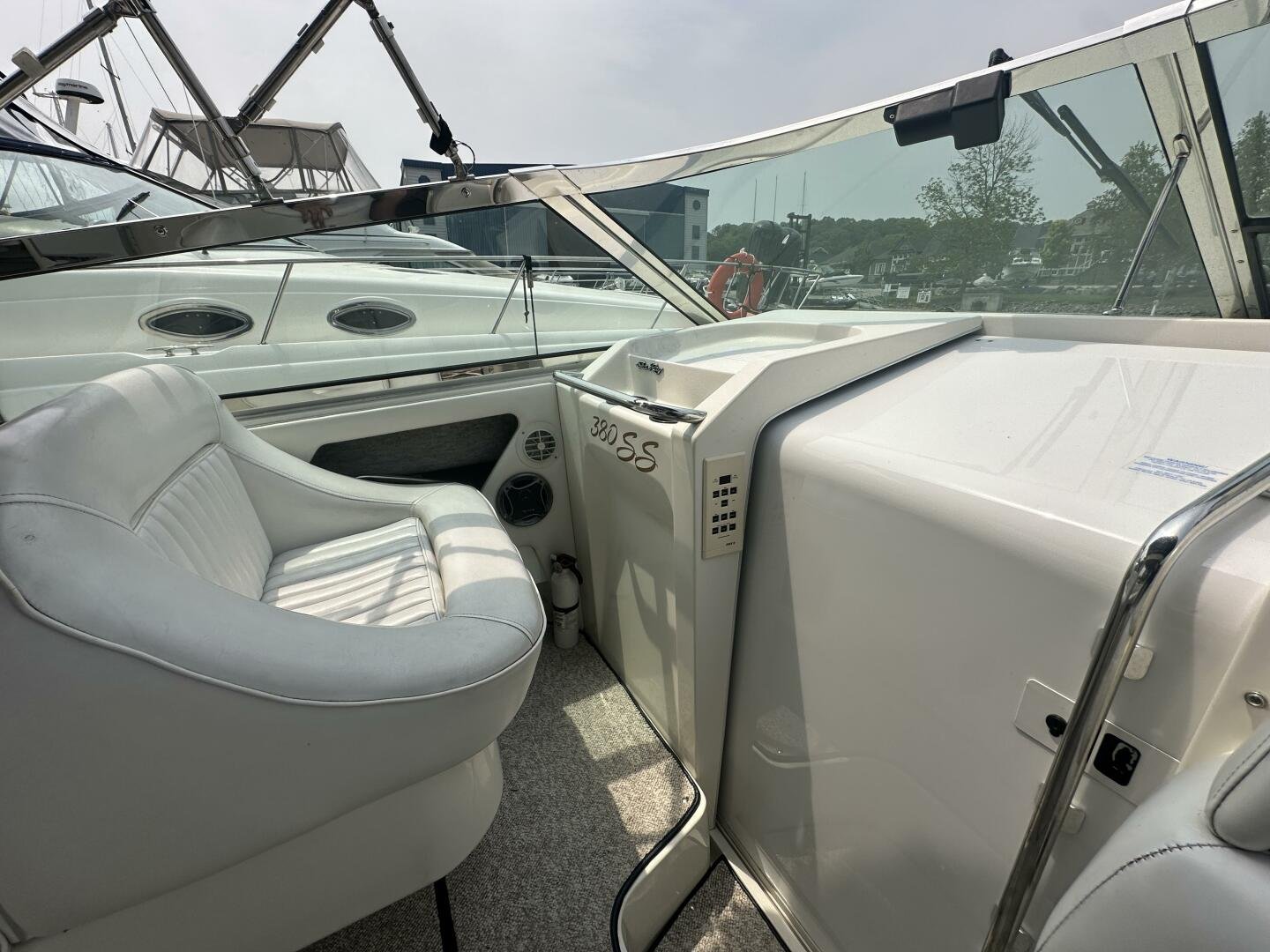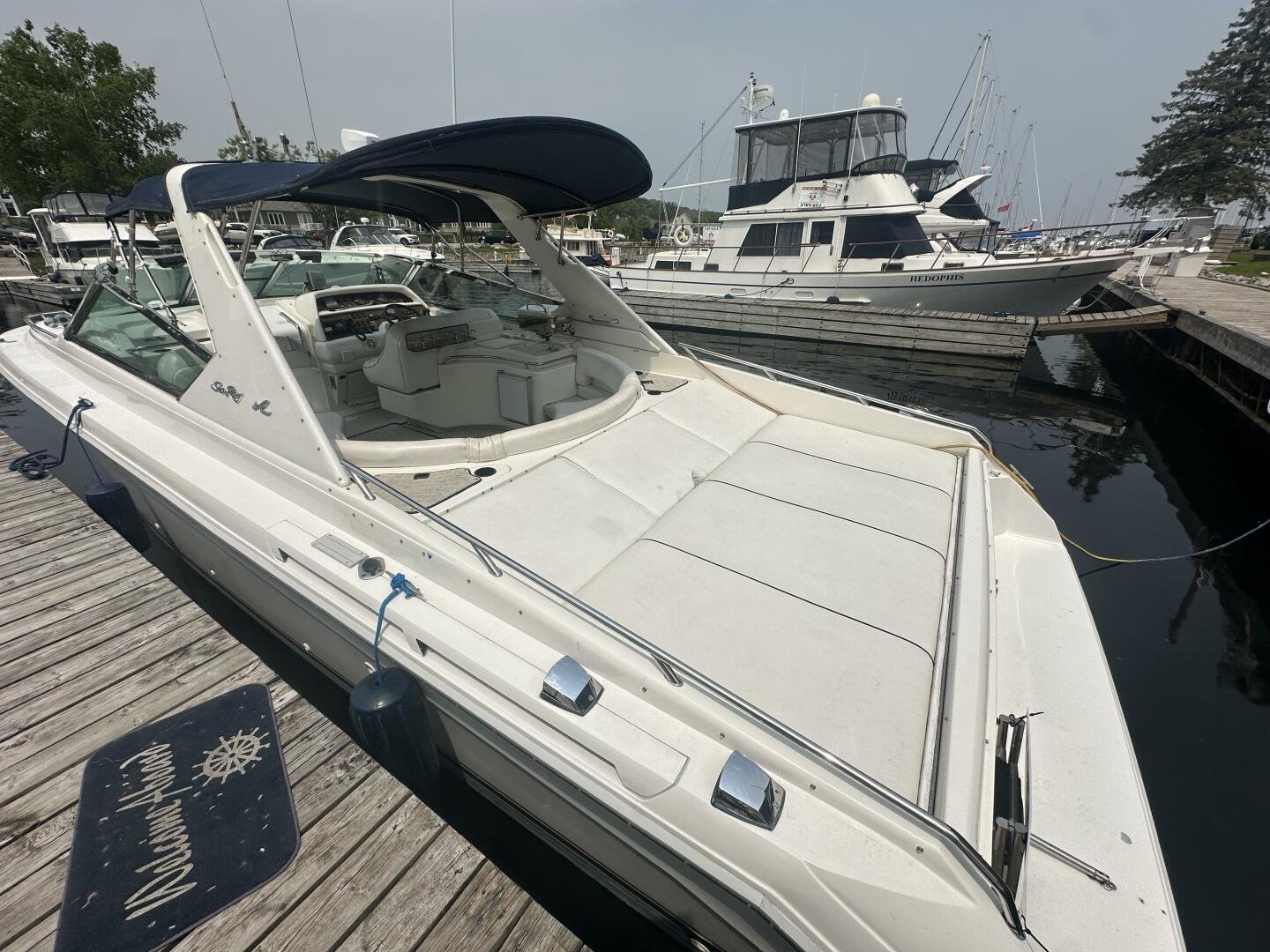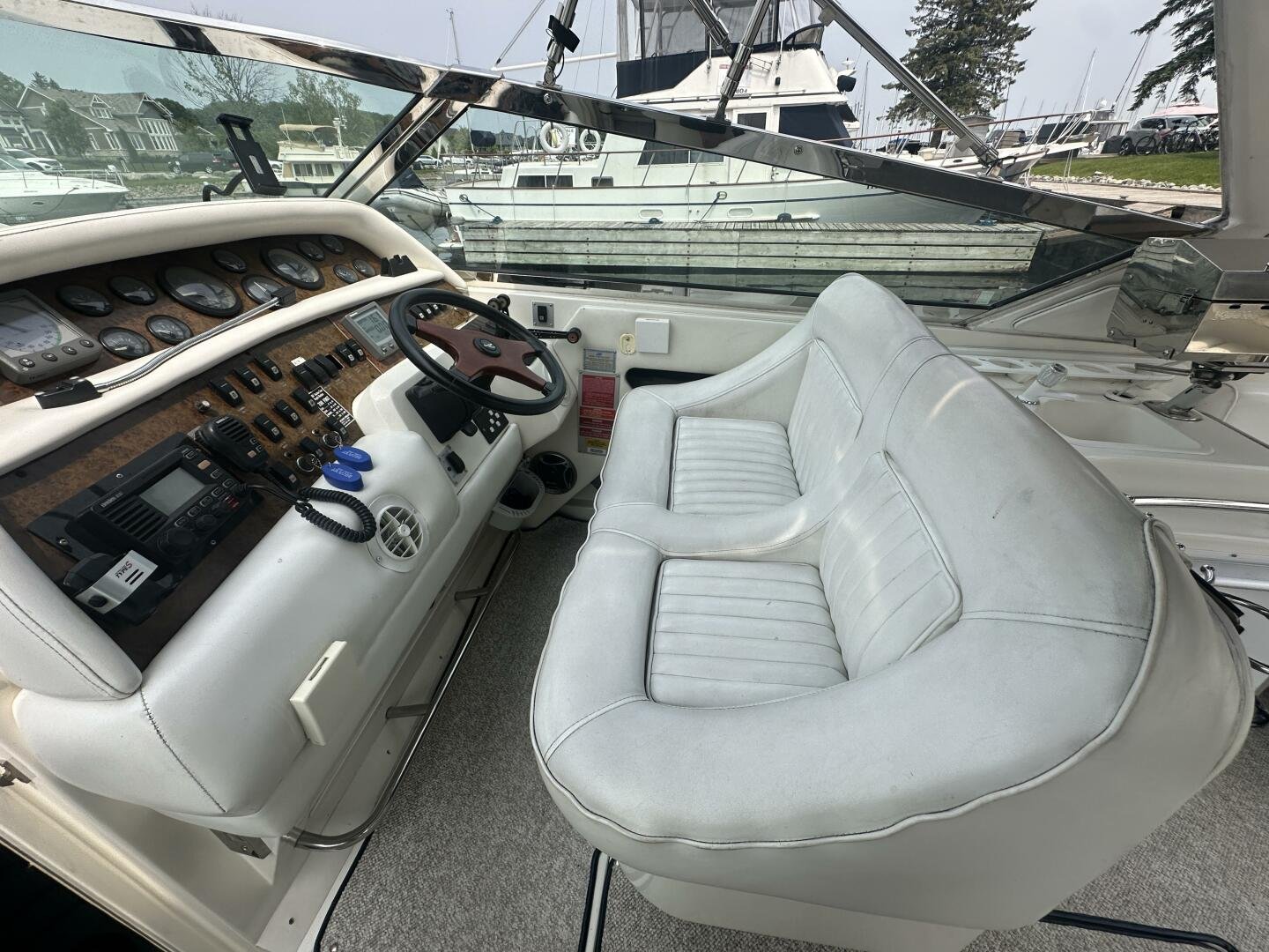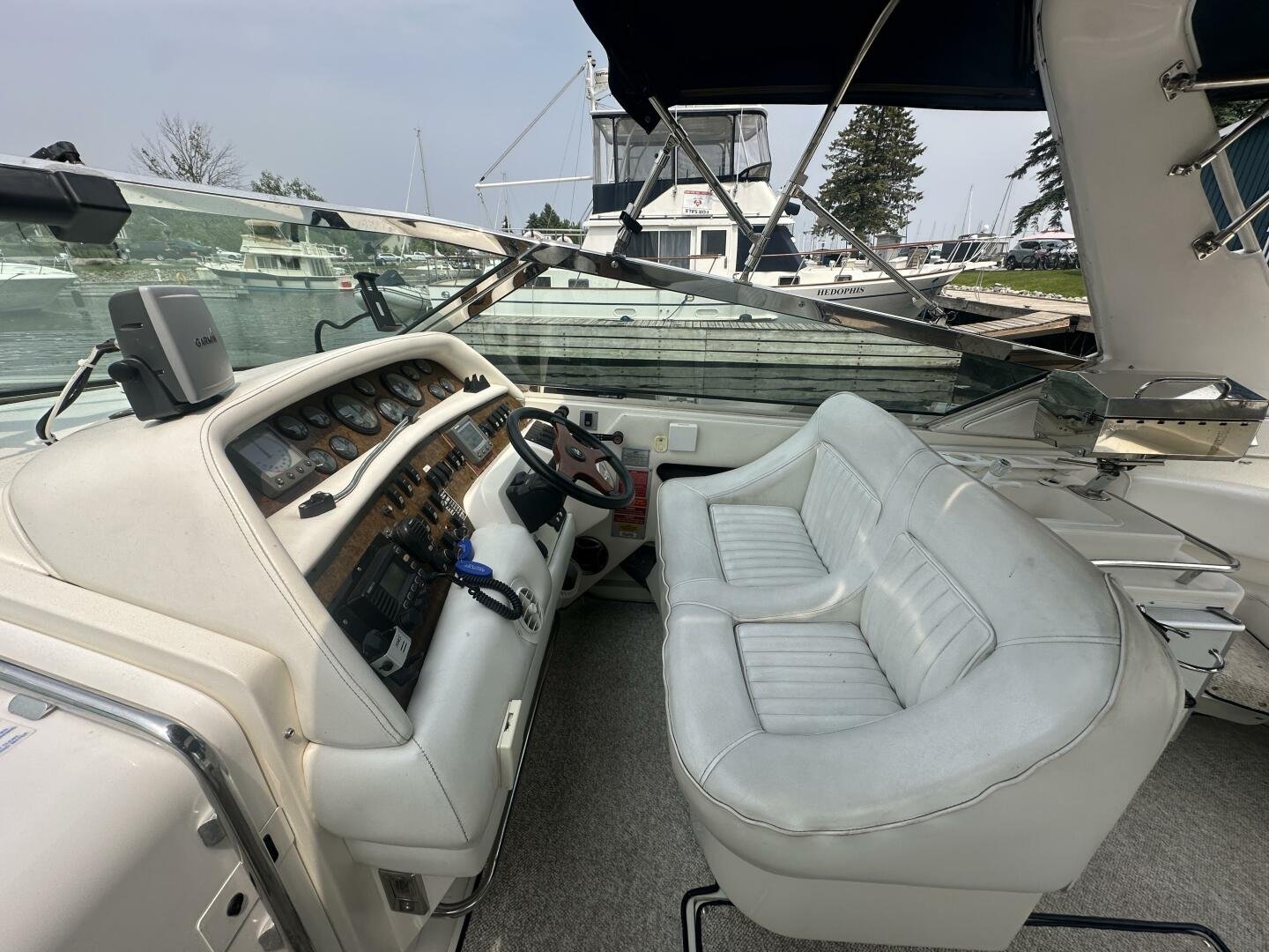 A rare and unique Sea Ray, with a large cockpit, massive sun deck, and a pair of MerCruiser 502s with 990 hours. An ideal vessel for big water cruising, day boating, and weekending. The aft cockpit features large wrap-around seating, a wet bar, and an ice maker. At the helm, you have large bench seating, autopilot, VHF, Garmin GPS, and all other controls. You will also find the controls for the cockpit AC.