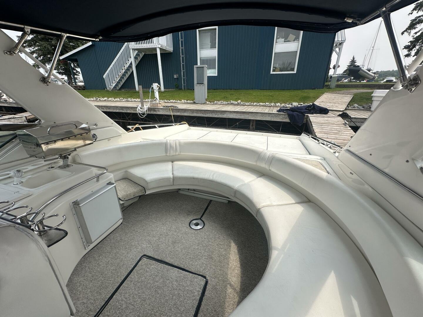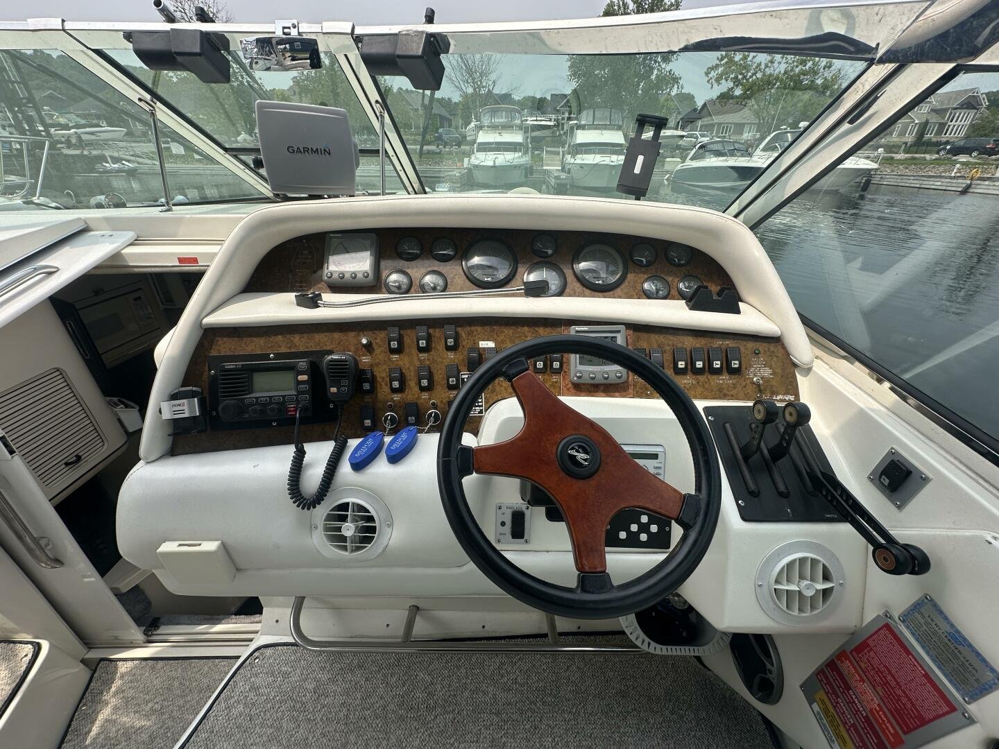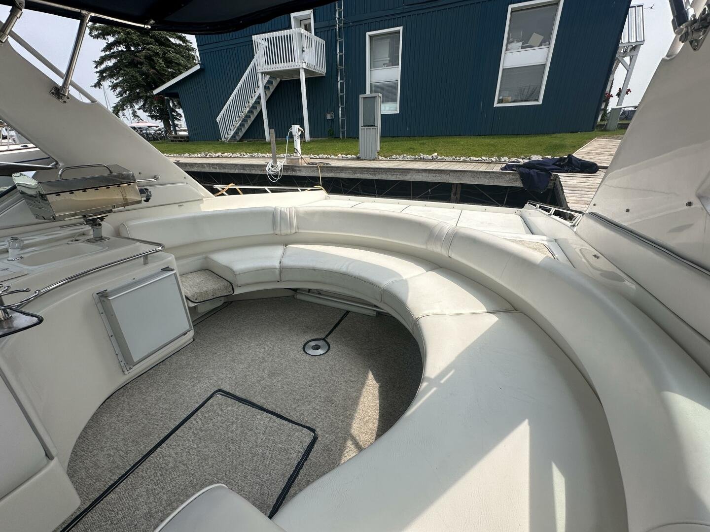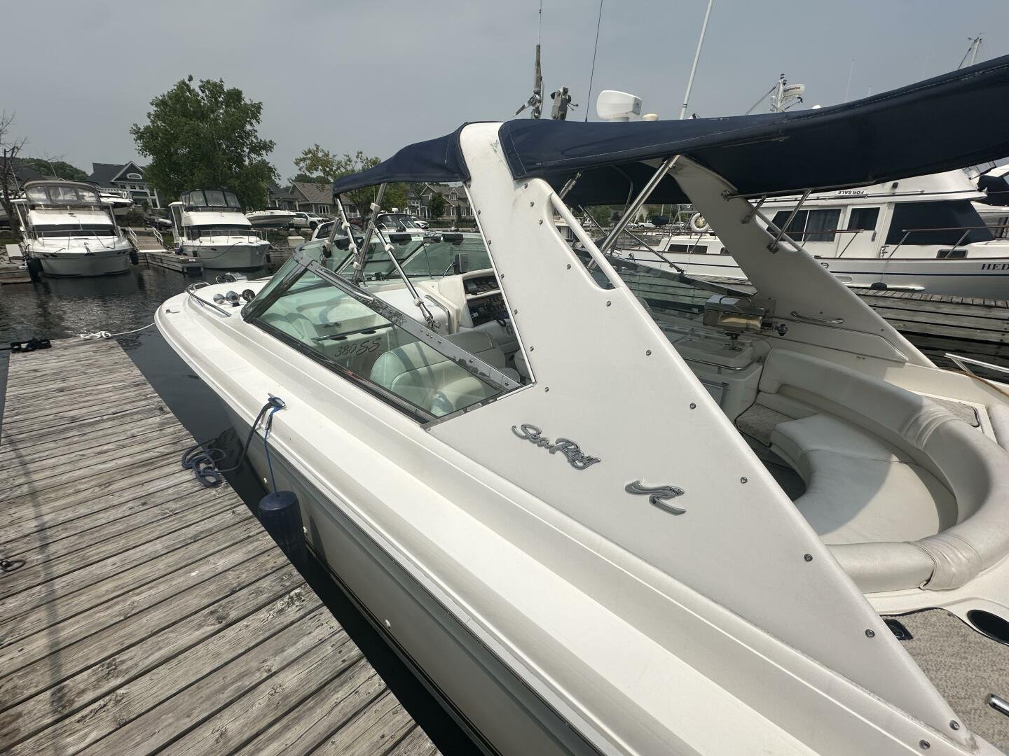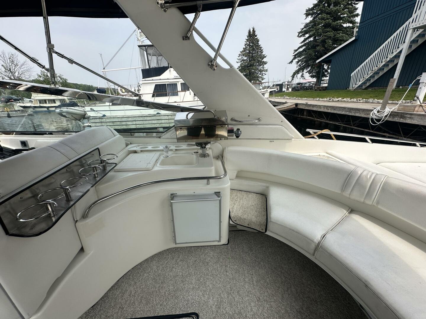 A rare and unique Sea Ray, with a large cockpit, massive sun deck, and a pair of MerCruiser 502s with 990 hours. An ideal vessel for big water cruising, day boating, and weekending. The aft cockpit features large wrap-around seating, a wet bar, and an ice maker. At the helm, you have large bench seating, autopilot, VHF, Garmin GPS, and all other controls. You will also find the controls for the cockpit AC.