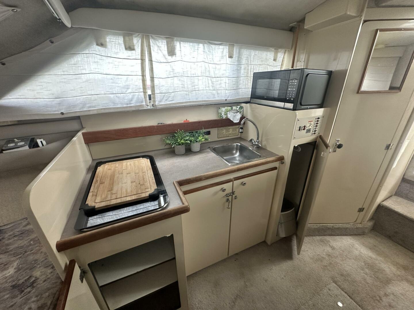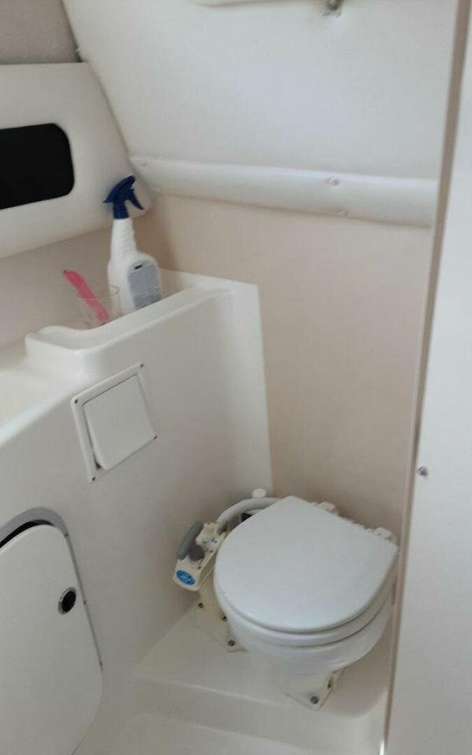 The layout of this boat is similar to most hardtop models her size with the helm and sofa on the bridge deck, and the dinette, galley, and V-berth on the lower level. What sets the 2859 apart from the norm is her amidships berth beneath the bridge deck—a layout that brings the sleeping capacity to six. A privacy curtain separates the forward berth from the salon, and there’s a handheld shower in the stand-up head compartment. While the cockpit of the 2859 Express is fairly small, it’s still large enough for a couple of light-tackle anglers or folding deck chairs. Additional features include a well-equipped galley with plenty of storage, a swim platform and boarding ladder, and a transom door.