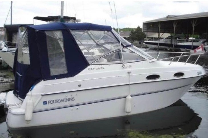Weekend-ready Four Winns 238 Vista with a 2024 Excalibur tandem-axle trailer. Comfortable overnight cruiser with V-berth, mid-cabin, galley and enclosed head. Easy to tow, launch and enjoy; perfect entry-level express cruiser for day trips or overnight getaways.