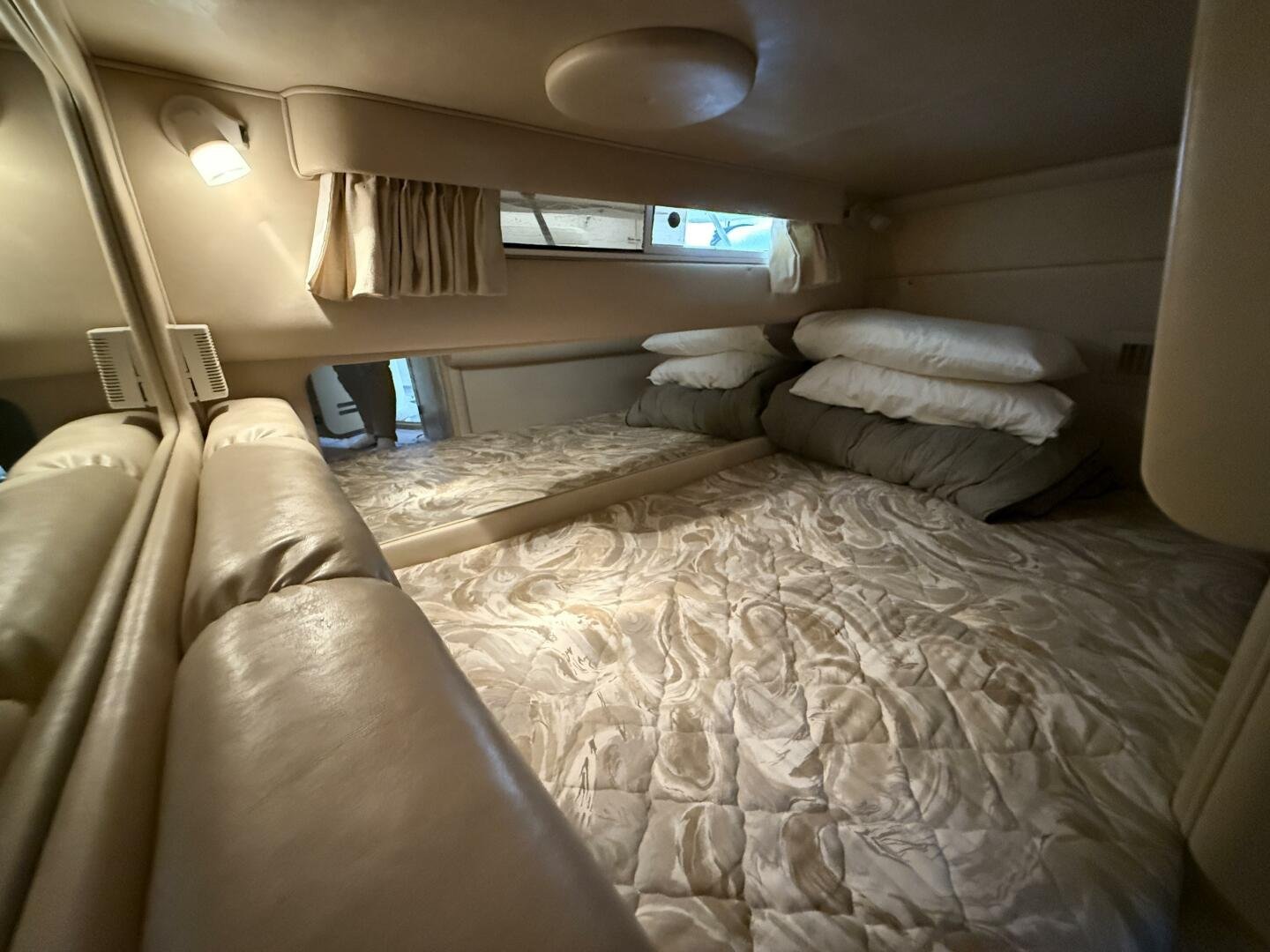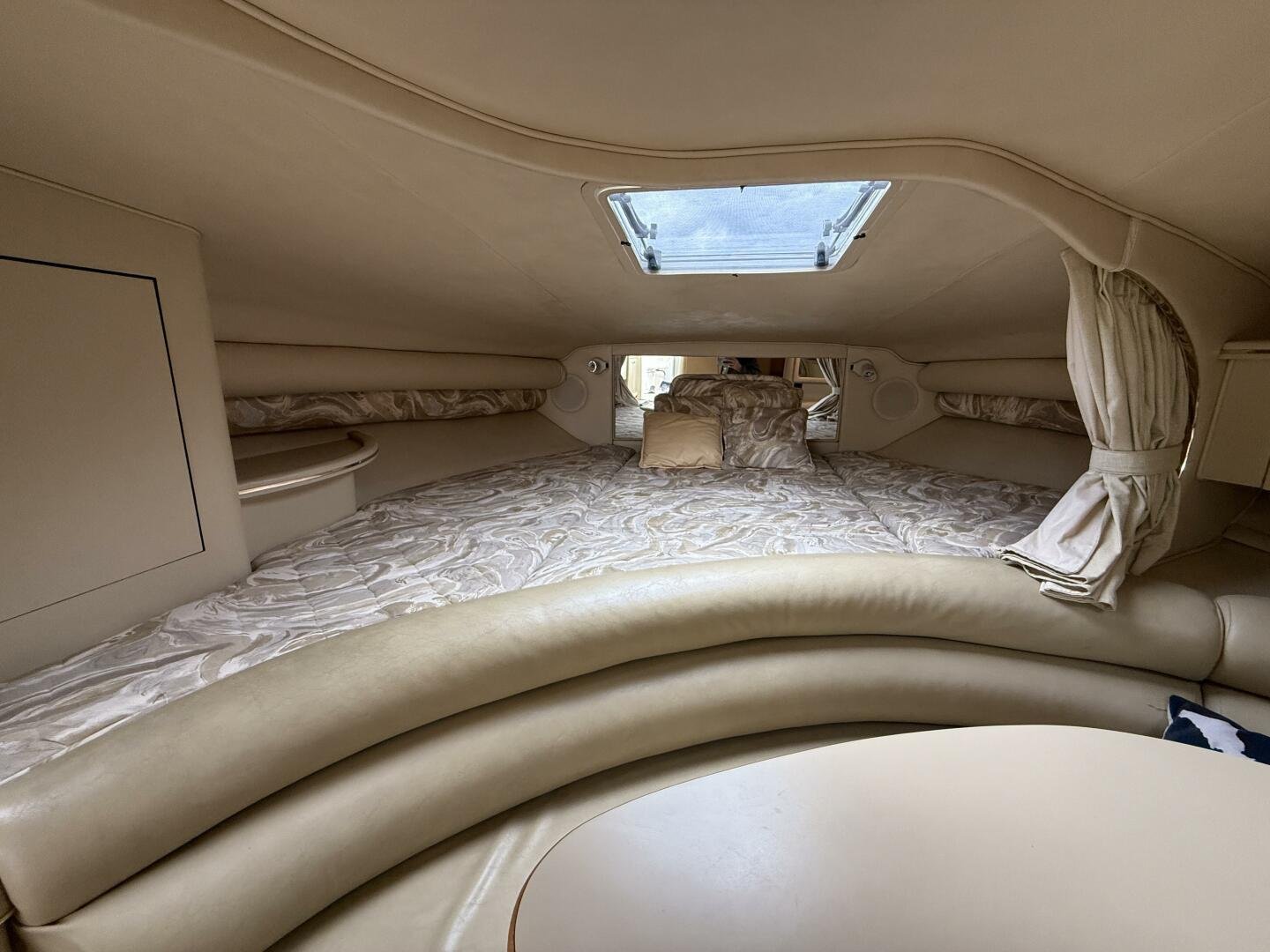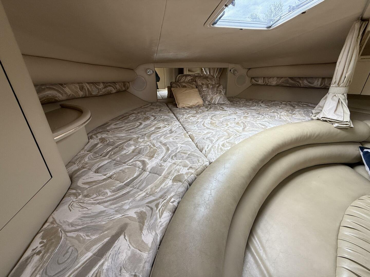 Forward Cabin: Raised double berth with overhead hatch. Large amount of storage below berth.