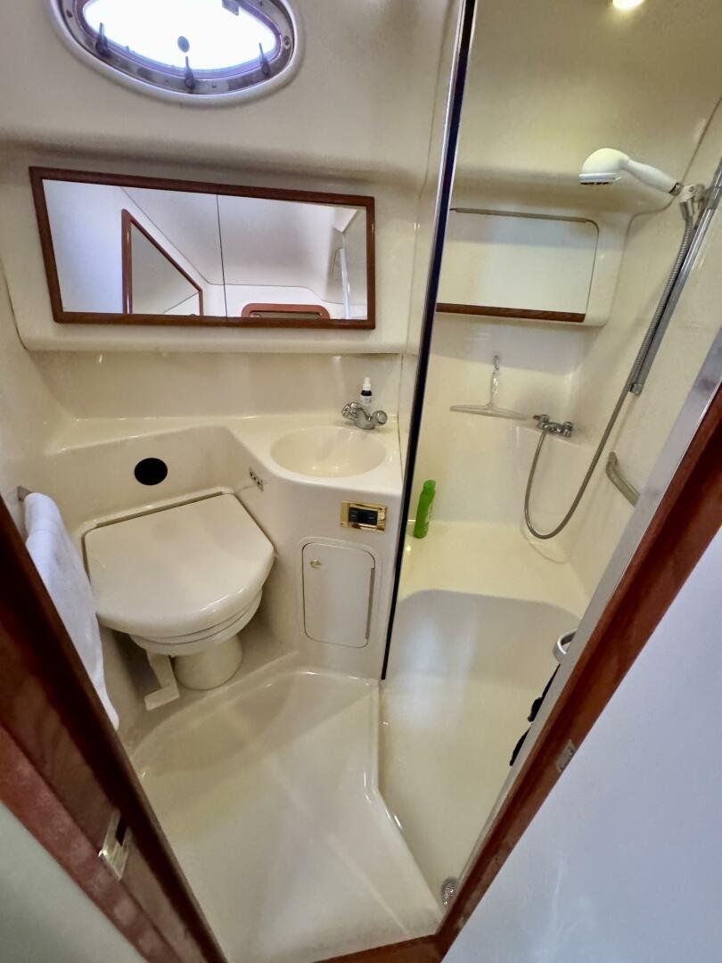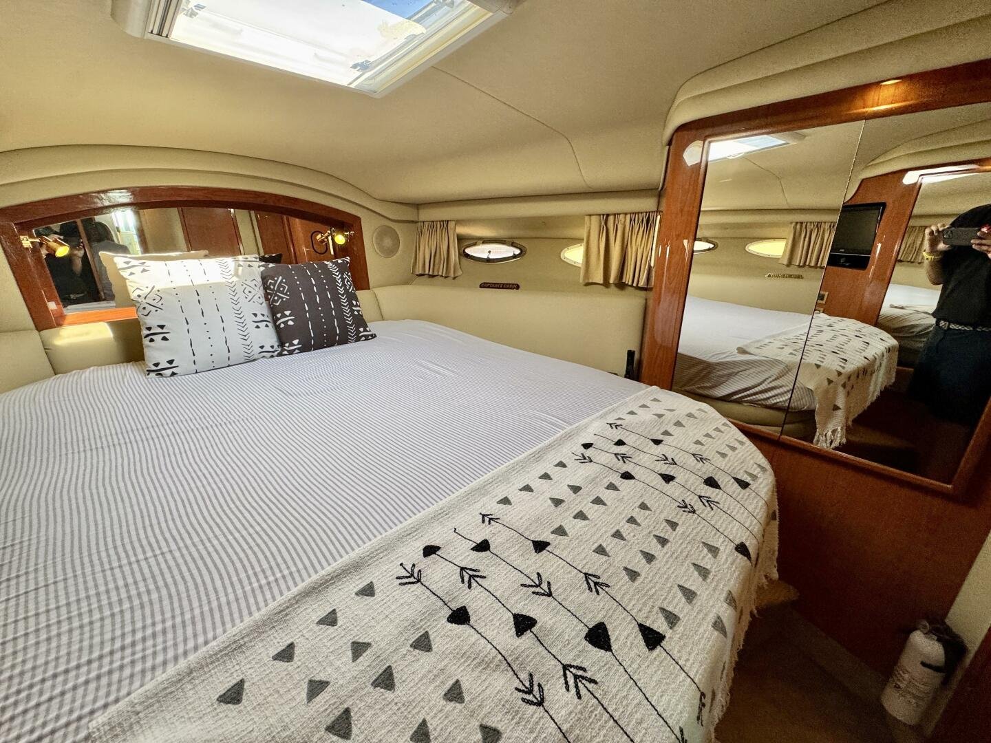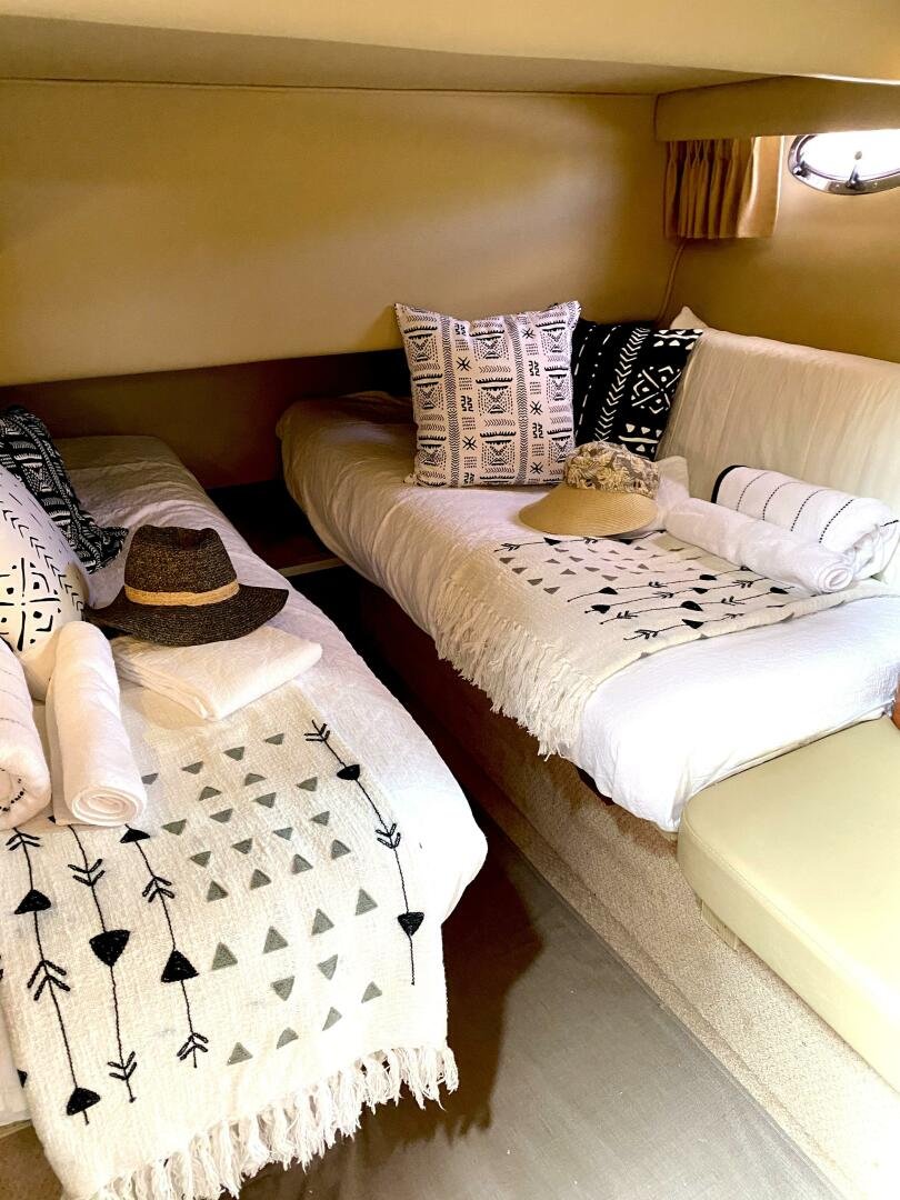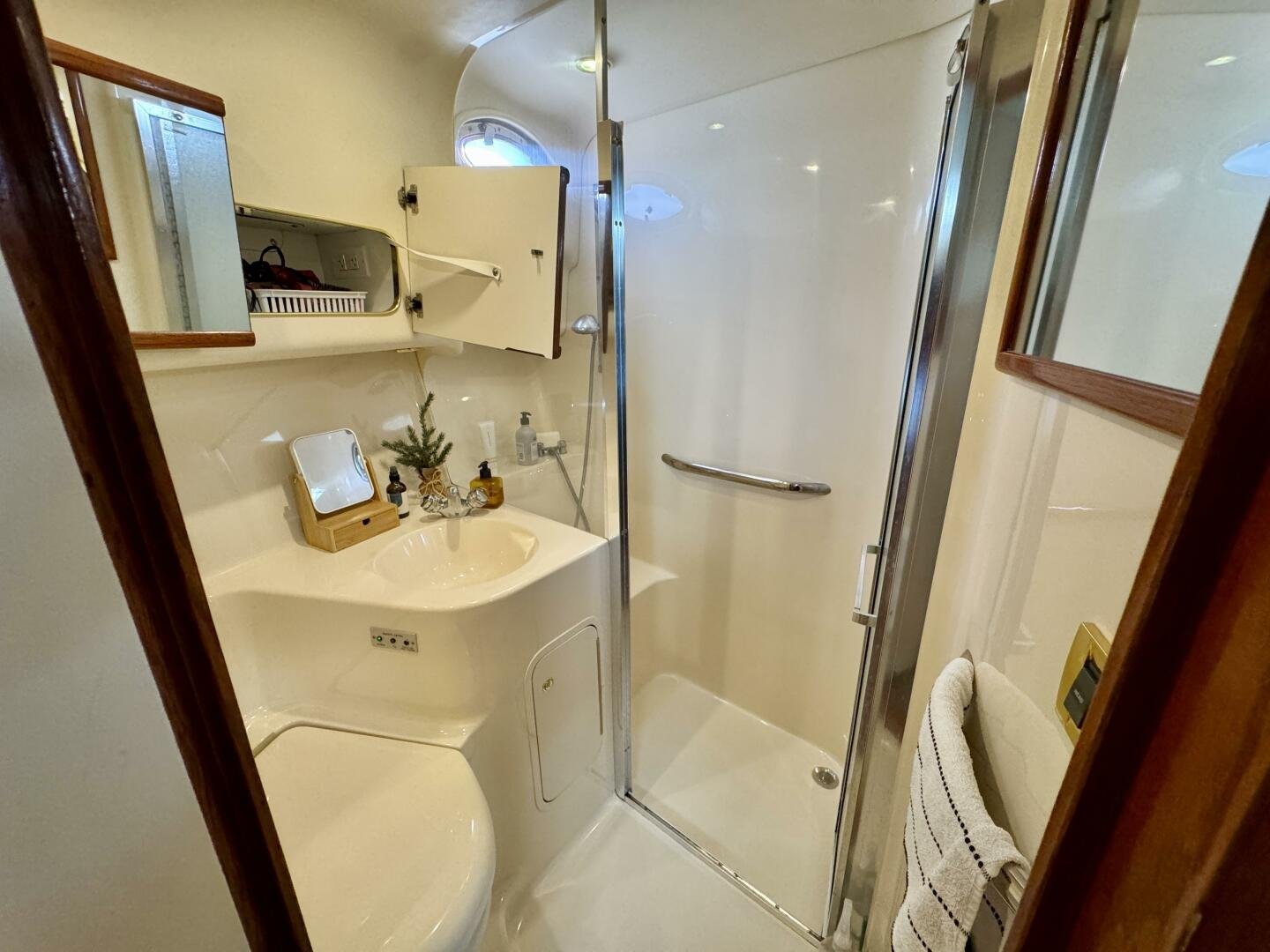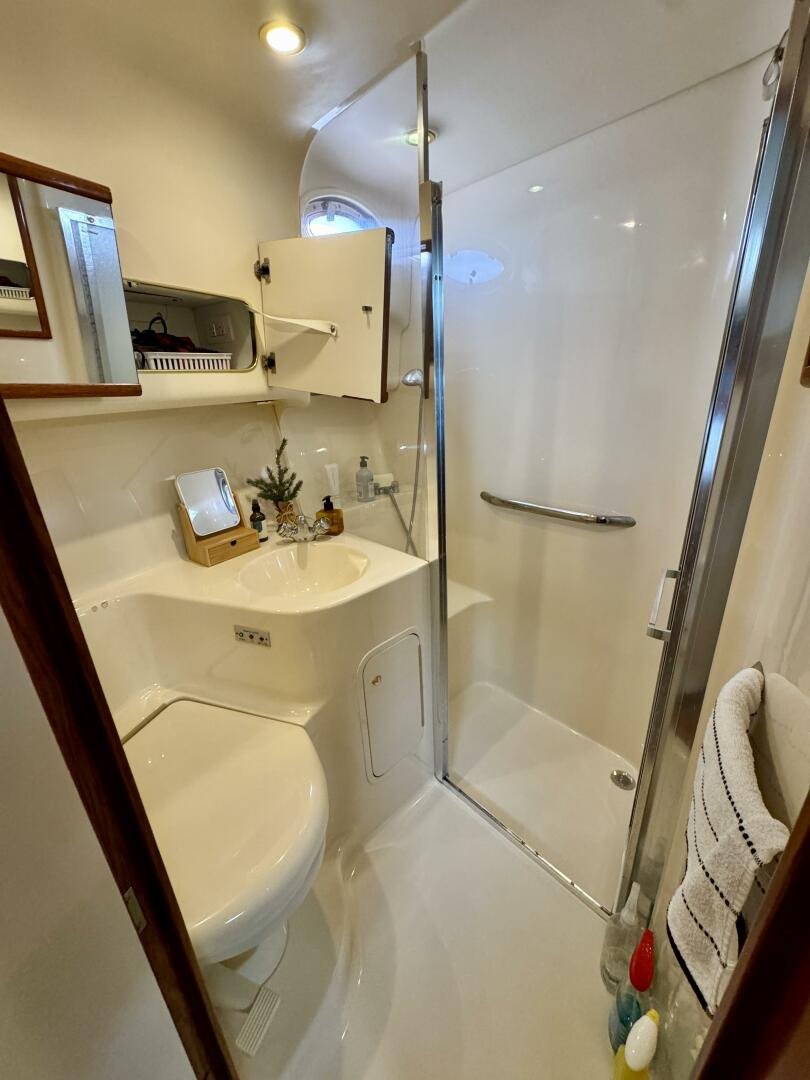 This model features two large staterooms, two heads with separate showers, and a spacious mid-level galley with a salon-level breakfast bar. The forward stateroom features a full-size bed, a cedar-lined hanging locker, floor storage, a private head and shower, and a flat-screen TV/DVD combo. The two twin beds in the port stateroom easily convert to a king-size bed. There’s plenty of room for stowing personal articles in the hanging cedar lined locker, built in drawers, and floor storage. The guest head with shower is right next door.
