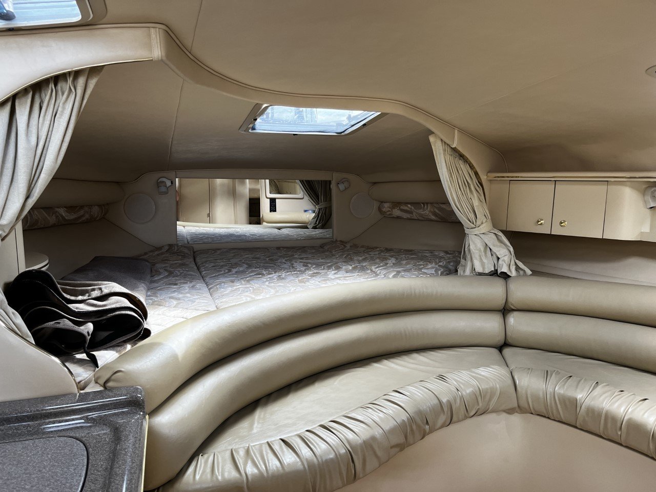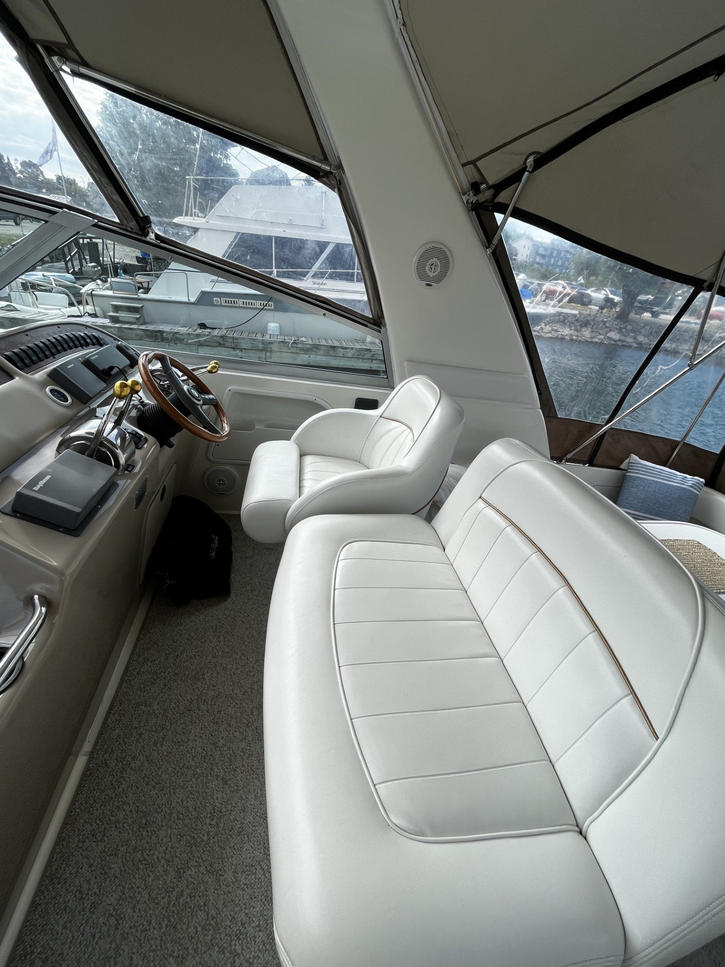 The cockpit and swim platform are finished with full Seafoam decking, showing no rips or tears anywhere. Every inch of this boat has been meticulously cared for, making it exceptionally clean and ready for the water.