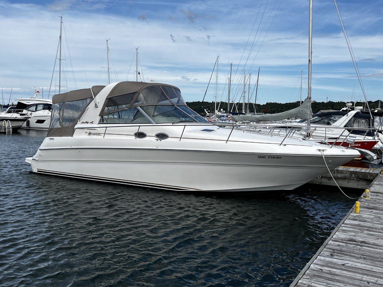 This 1998 Sea Ray 310 Sundancer is a beautifully maintained mid-size cruiser with less than 200 hours on both engines and the generator. The boat features a brand-new camper top, sides, and windows (beige, installed 2023), providing comfort and protection in all weather.