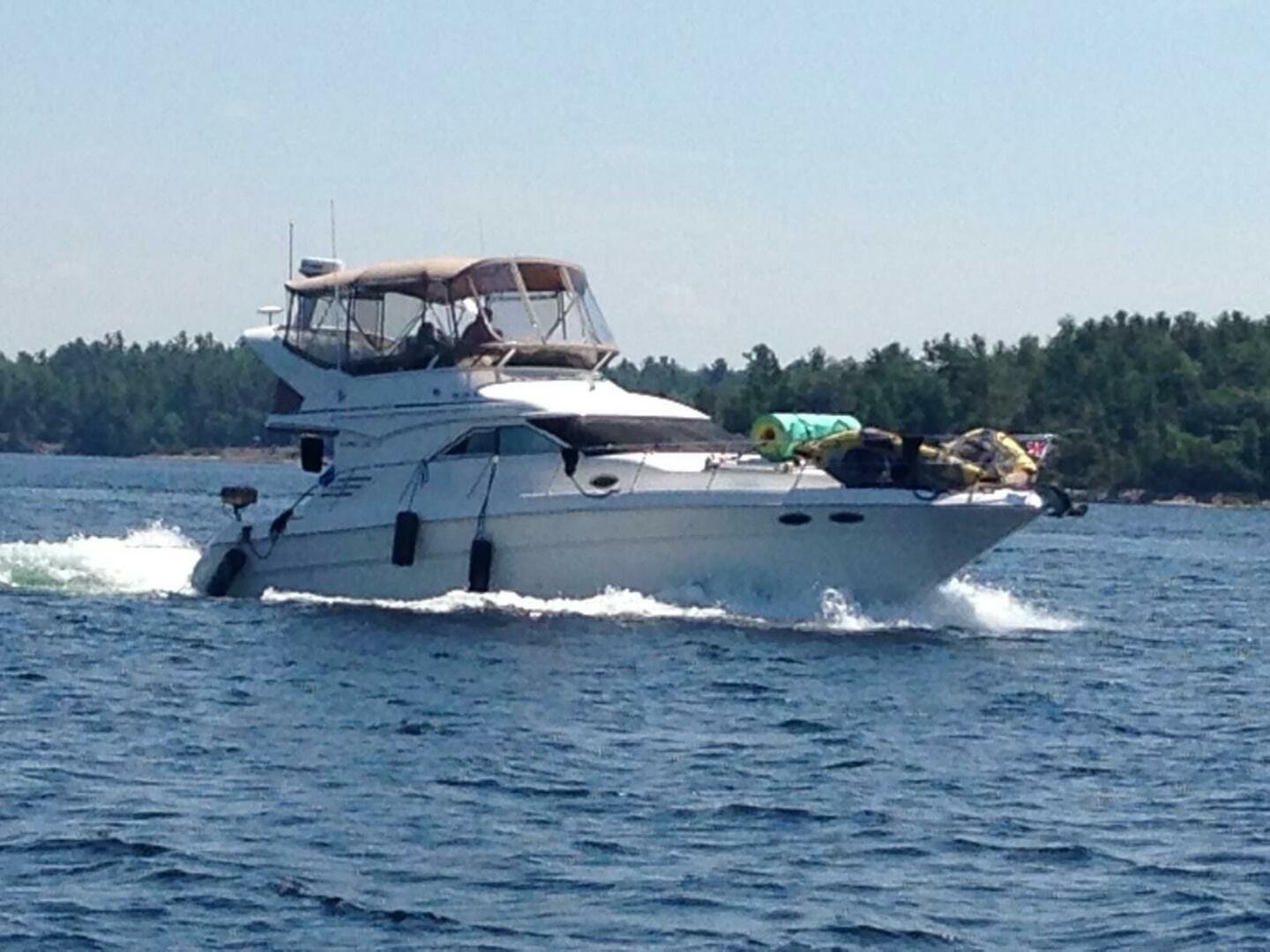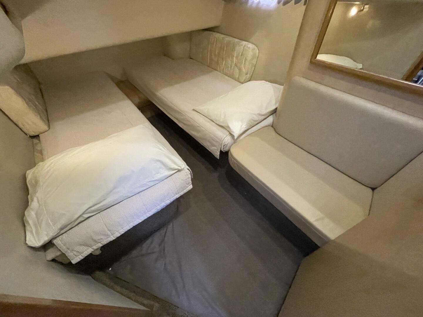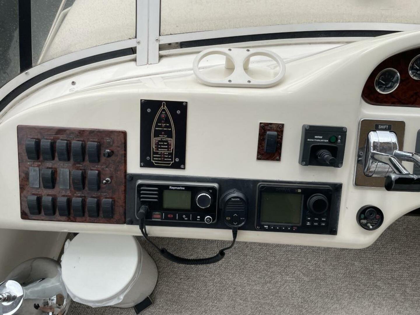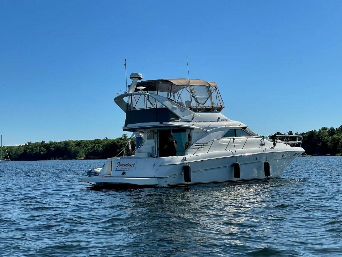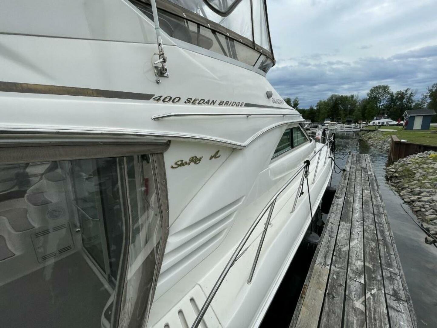 The Sea Ray 400 Sedan Bridge continues to be a highly sought after model in the used boat market. Her combination of design and performance ensures her continuing popularity and value. The floorplan has two staterooms, a mid-level galley, and an open salon. The cockpit is well shaded by a flybridge overhang and comes with a built-in transom seat, molded-in flybridge steps, and transom door. A hatch in the cockpit sole provides access to the engine compartment. Built on a fully cored hull with a relatively wide beam, prop pockets (to reduce draft) and underwater exhausts, and a pair of 340-hp Cat diesels cruise at 22 knots (about 27 knots top speed.)