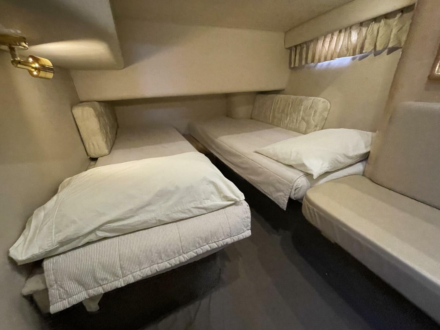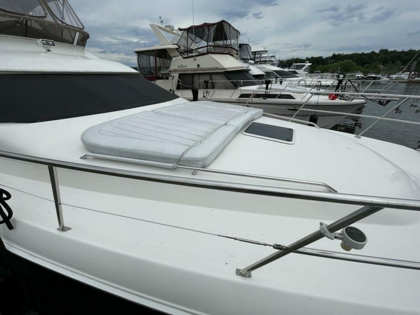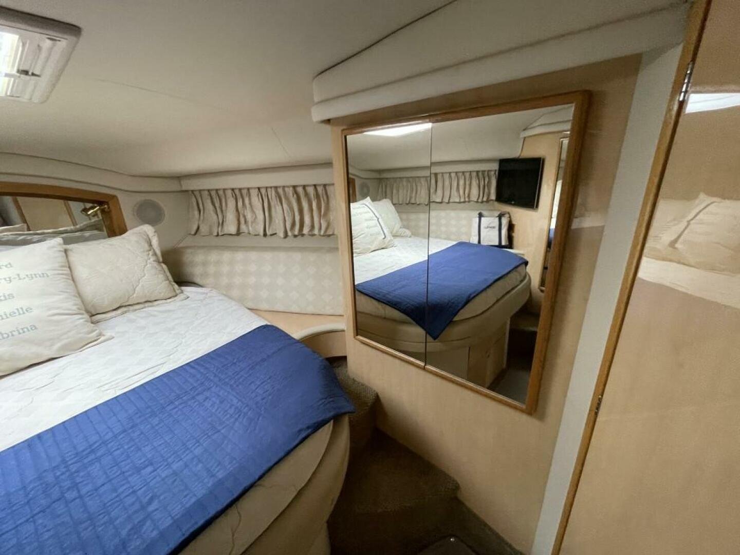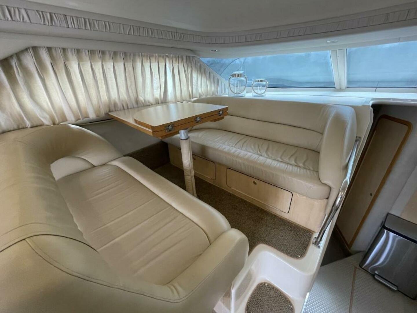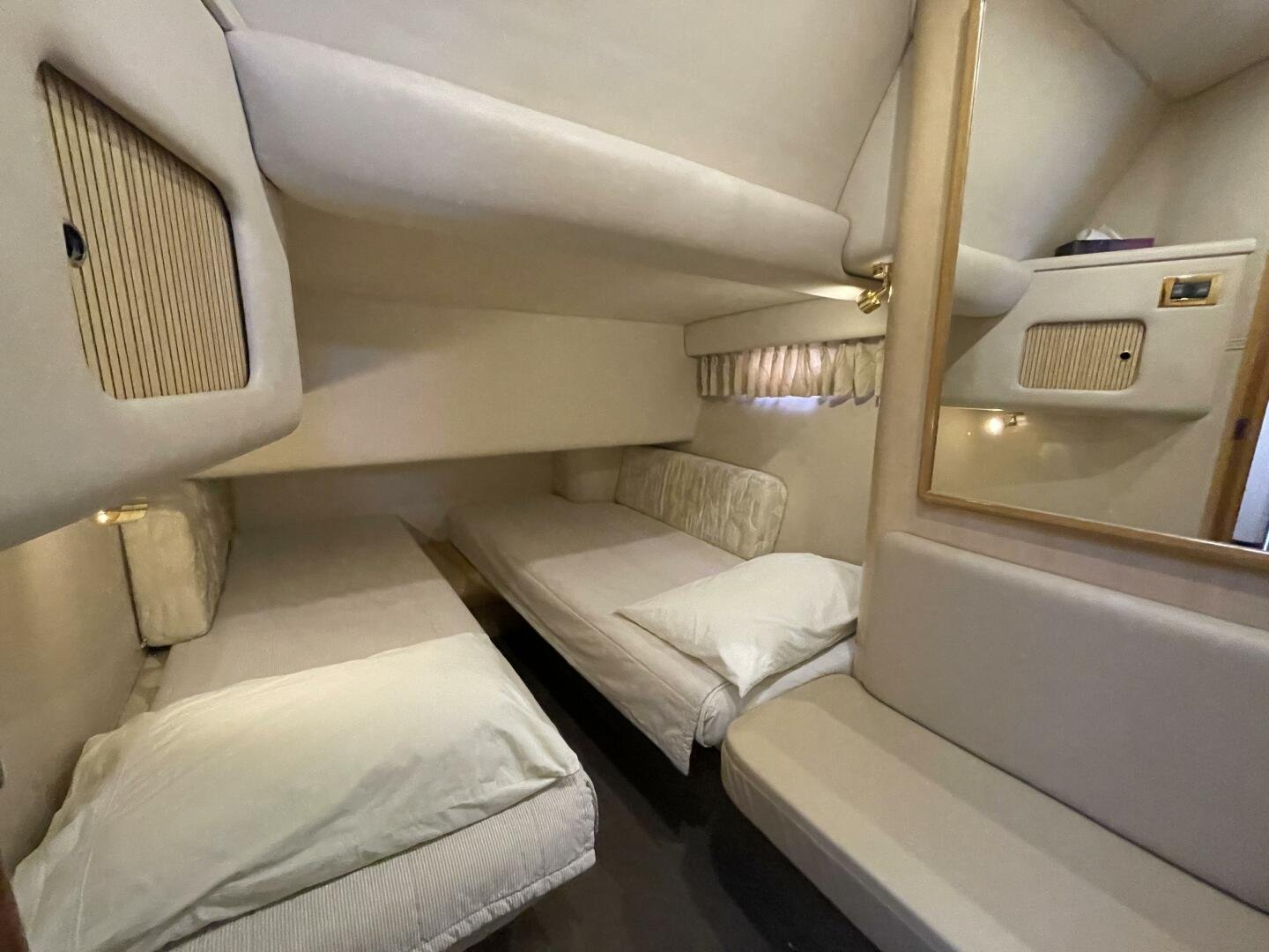 The Sea Ray 400 Sedan Bridge continues to be a highly sought after model in the used boat market. Her combination of design and performance ensures her continuing popularity and value. The floorplan has two staterooms, a mid-level galley, and an open salon. The cockpit is well shaded by a flybridge overhang and comes with a built-in transom seat, molded-in flybridge steps, and transom door. A hatch in the cockpit sole provides access to the engine compartment. Built on a fully cored hull with a relatively wide beam, prop pockets (to reduce draft) and underwater exhausts, and a pair of 340-hp Cat diesels cruise at 22 knots (about 27 knots top speed.)