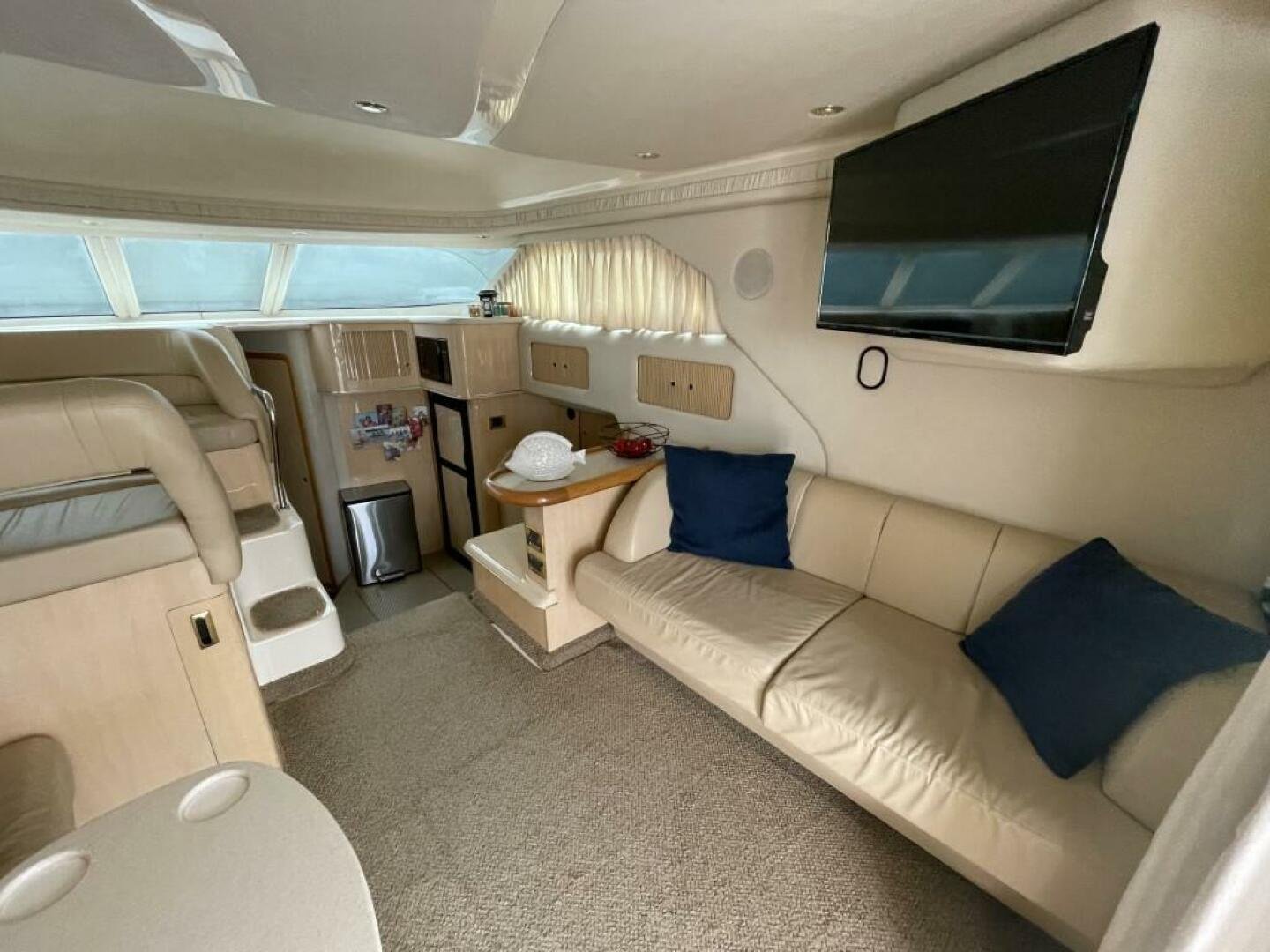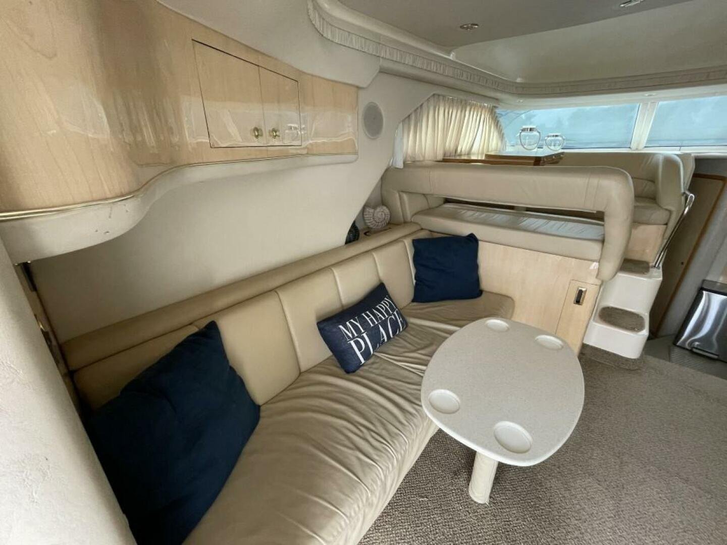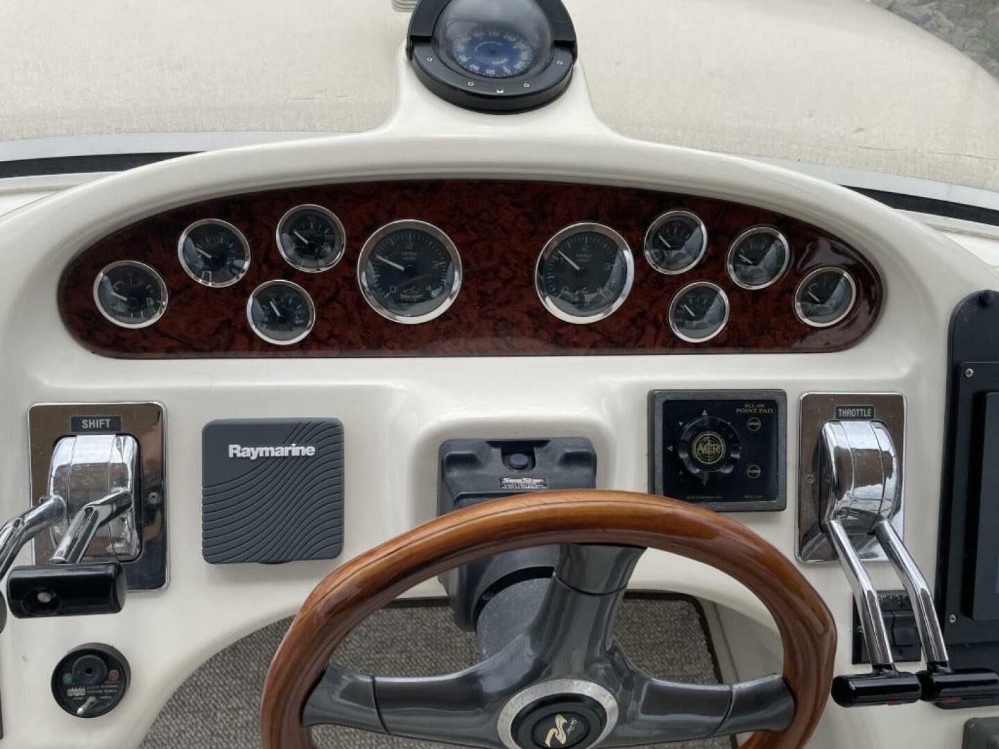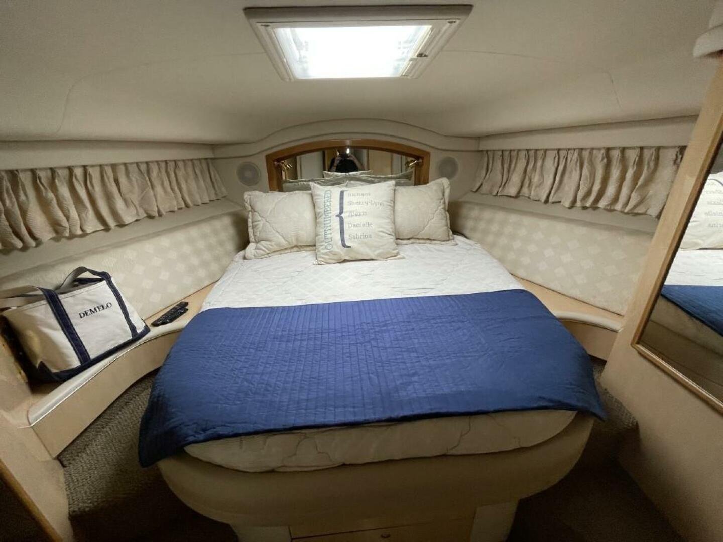 The Sea Ray 400 Sedan Bridge continues to be a highly sought after model in the used boat market. Her combination of design and performance ensures her continuing popularity and value. The floorplan has two staterooms, a mid-level galley, and an open salon. The cockpit is well shaded by a flybridge overhang and comes with a built-in transom seat, molded-in flybridge steps, and transom door. A hatch in the cockpit sole provides access to the engine compartment. Built on a fully cored hull with a relatively wide beam, prop pockets (to reduce draft) and underwater exhausts, and a pair of 340-hp Cat diesels cruise at 22 knots (about 27 knots top speed.)