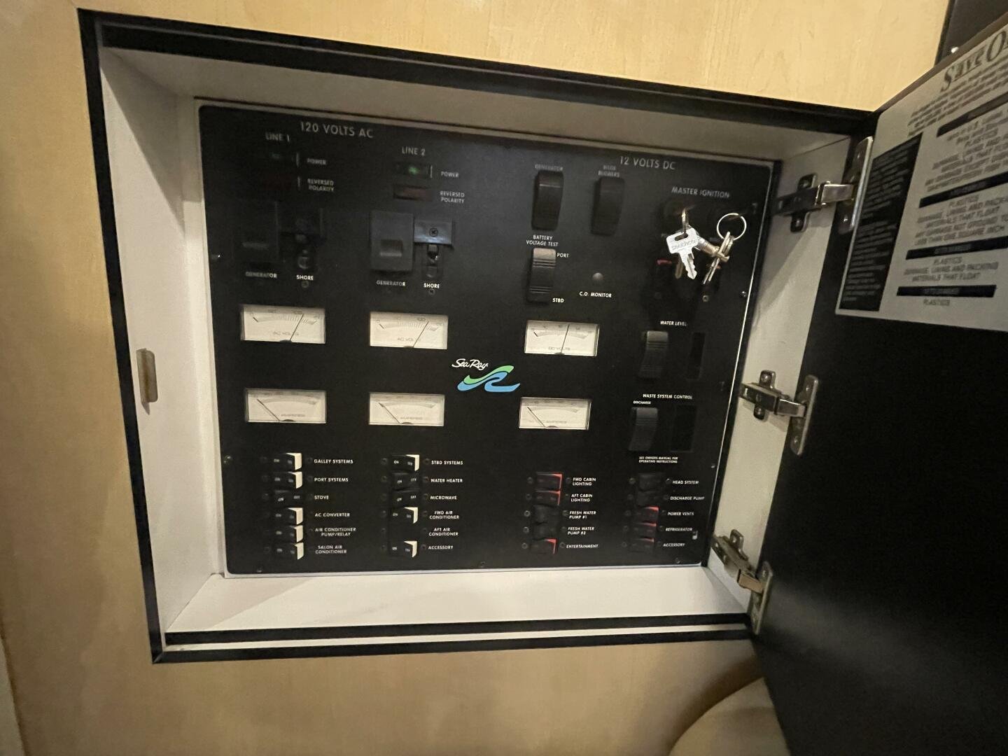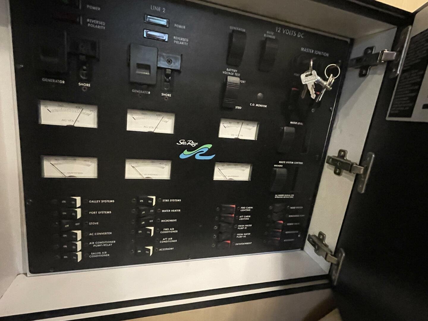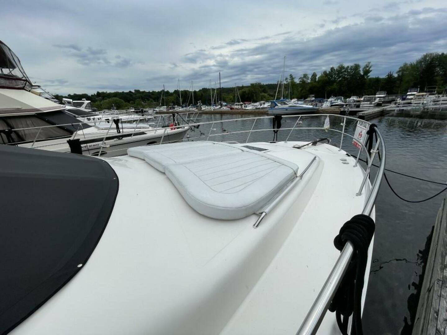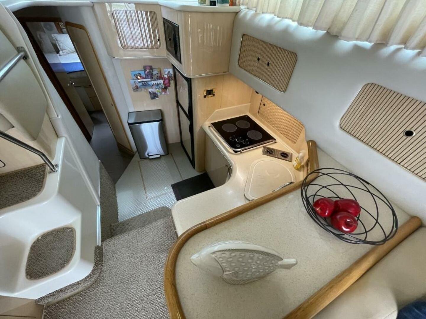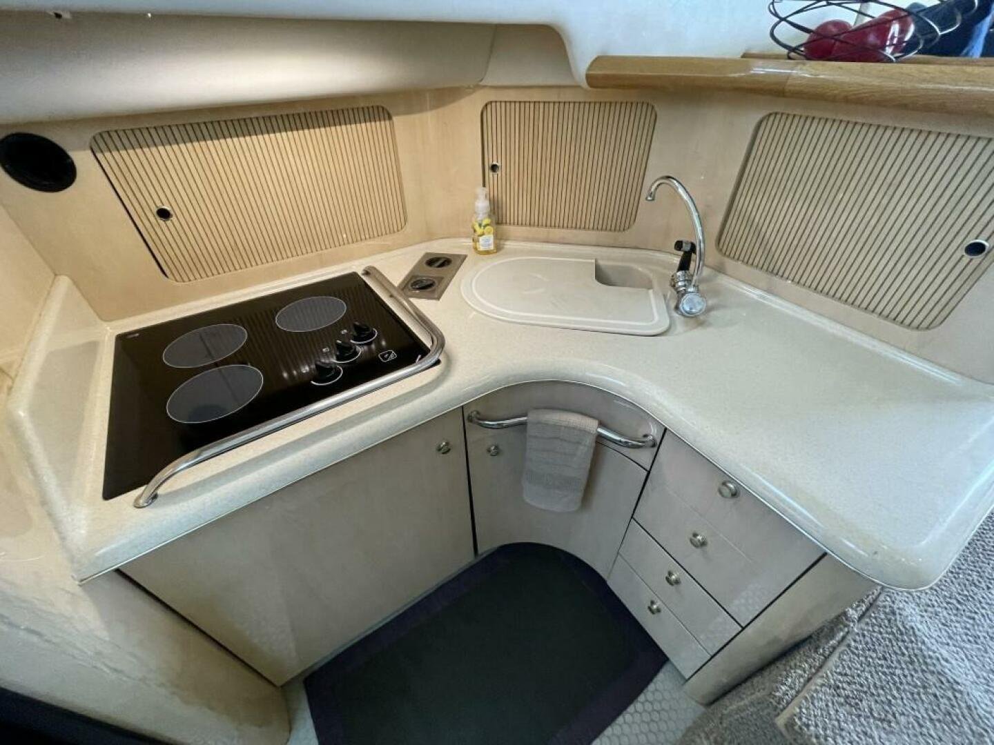 The Sea Ray 400 Sedan Bridge continues to be a highly sought after model in the used boat market. Her combination of design and performance ensures her continuing popularity and value. The floorplan has two staterooms, a mid-level galley, and an open salon. The cockpit is well shaded by a flybridge overhang and comes with a built-in transom seat, molded-in flybridge steps, and transom door. A hatch in the cockpit sole provides access to the engine compartment. Built on a fully cored hull with a relatively wide beam, prop pockets (to reduce draft) and underwater exhausts, and a pair of 340-hp Cat diesels cruise at 22 knots (about 27 knots top speed.)