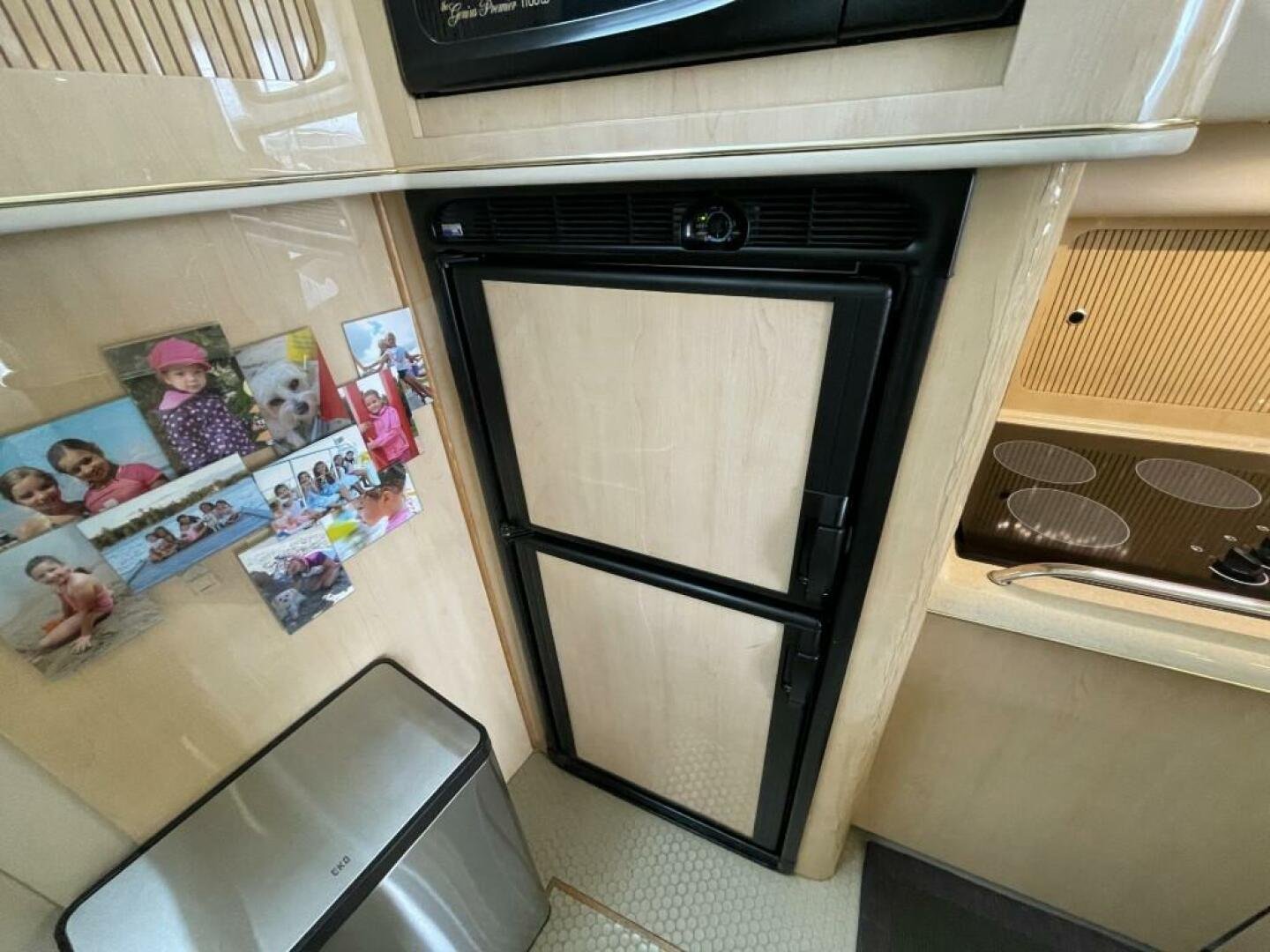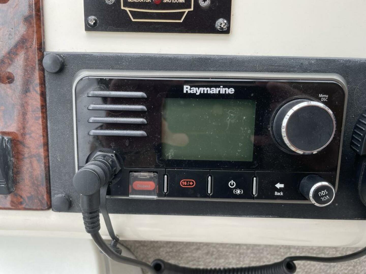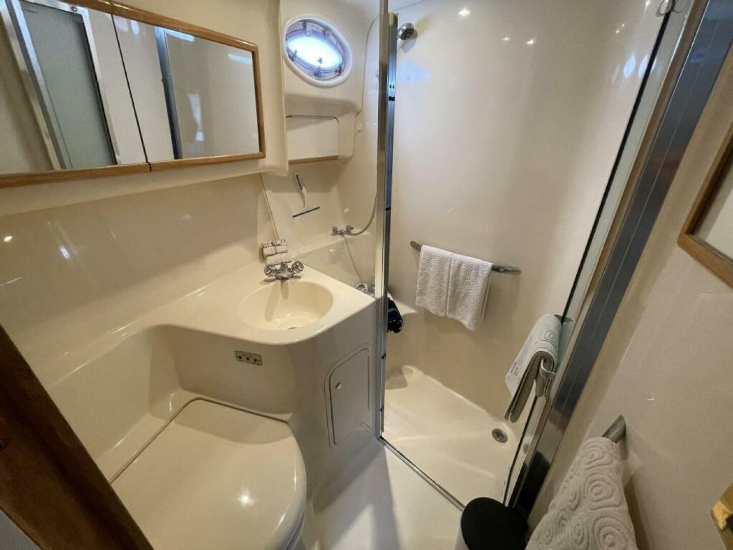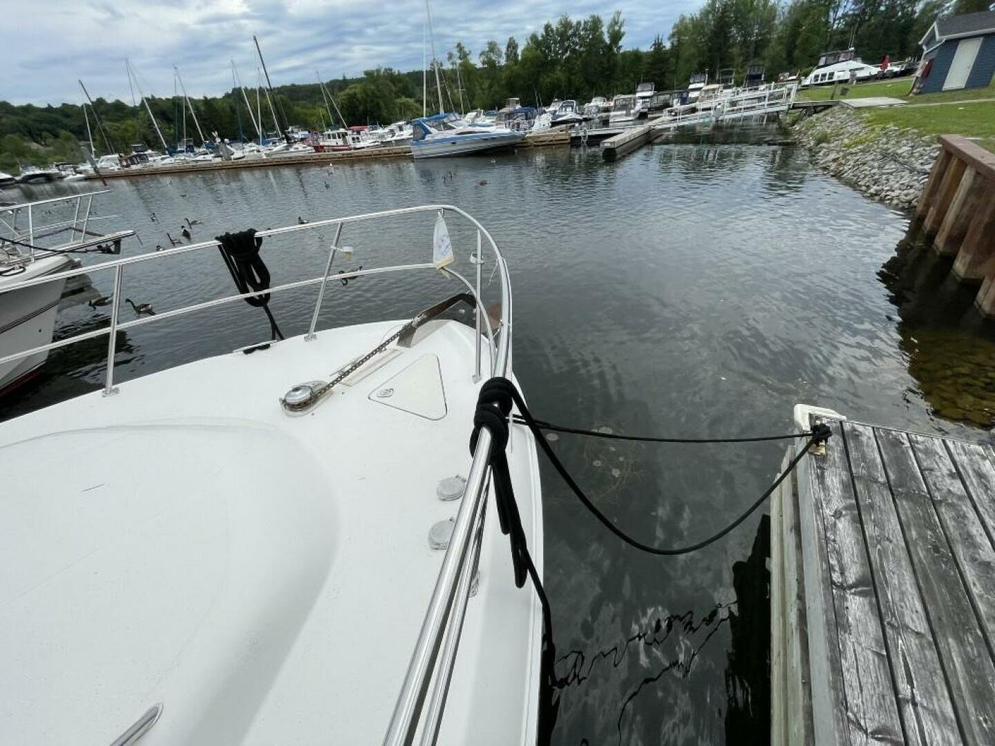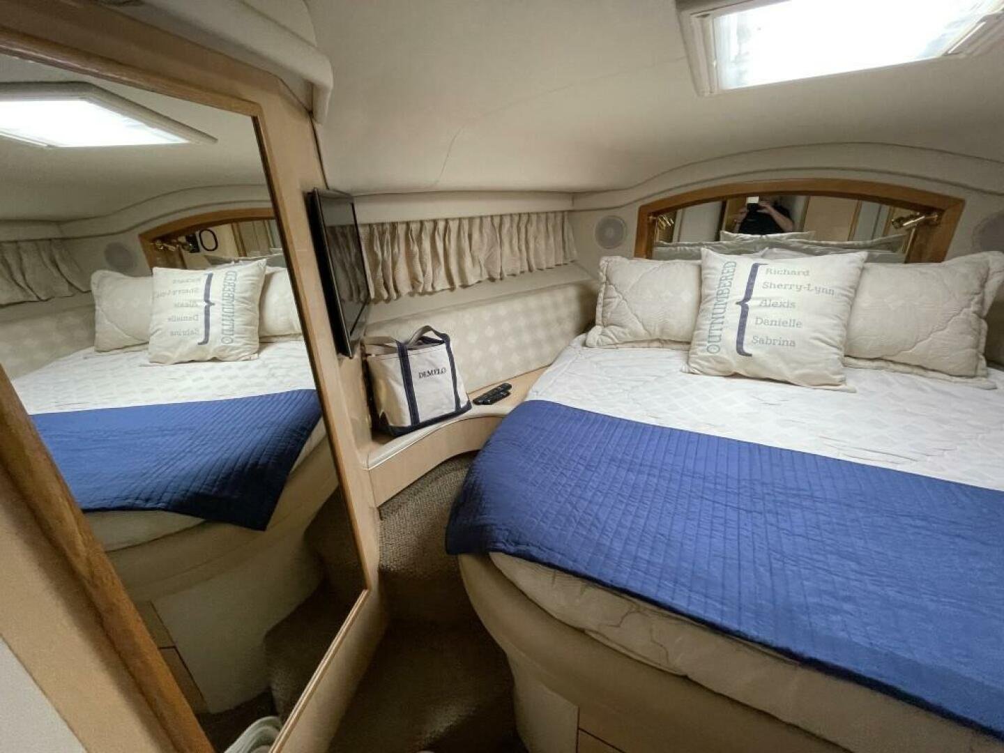 The Sea Ray 400 Sedan Bridge continues to be a highly sought after model in the used boat market. Her combination of design and performance ensures her continuing popularity and value. The floorplan has two staterooms, a mid-level galley, and an open salon. The cockpit is well shaded by a flybridge overhang and comes with a built-in transom seat, molded-in flybridge steps, and transom door. A hatch in the cockpit sole provides access to the engine compartment. Built on a fully cored hull with a relatively wide beam, prop pockets (to reduce draft) and underwater exhausts, and a pair of 340-hp Cat diesels cruise at 22 knots (about 27 knots top speed.)