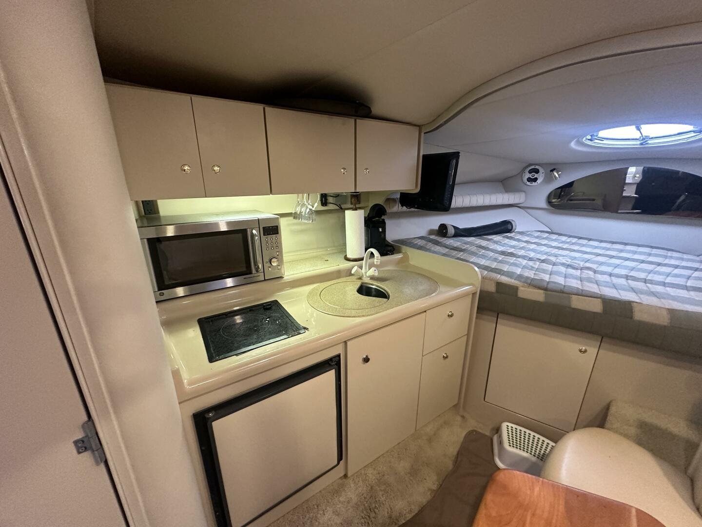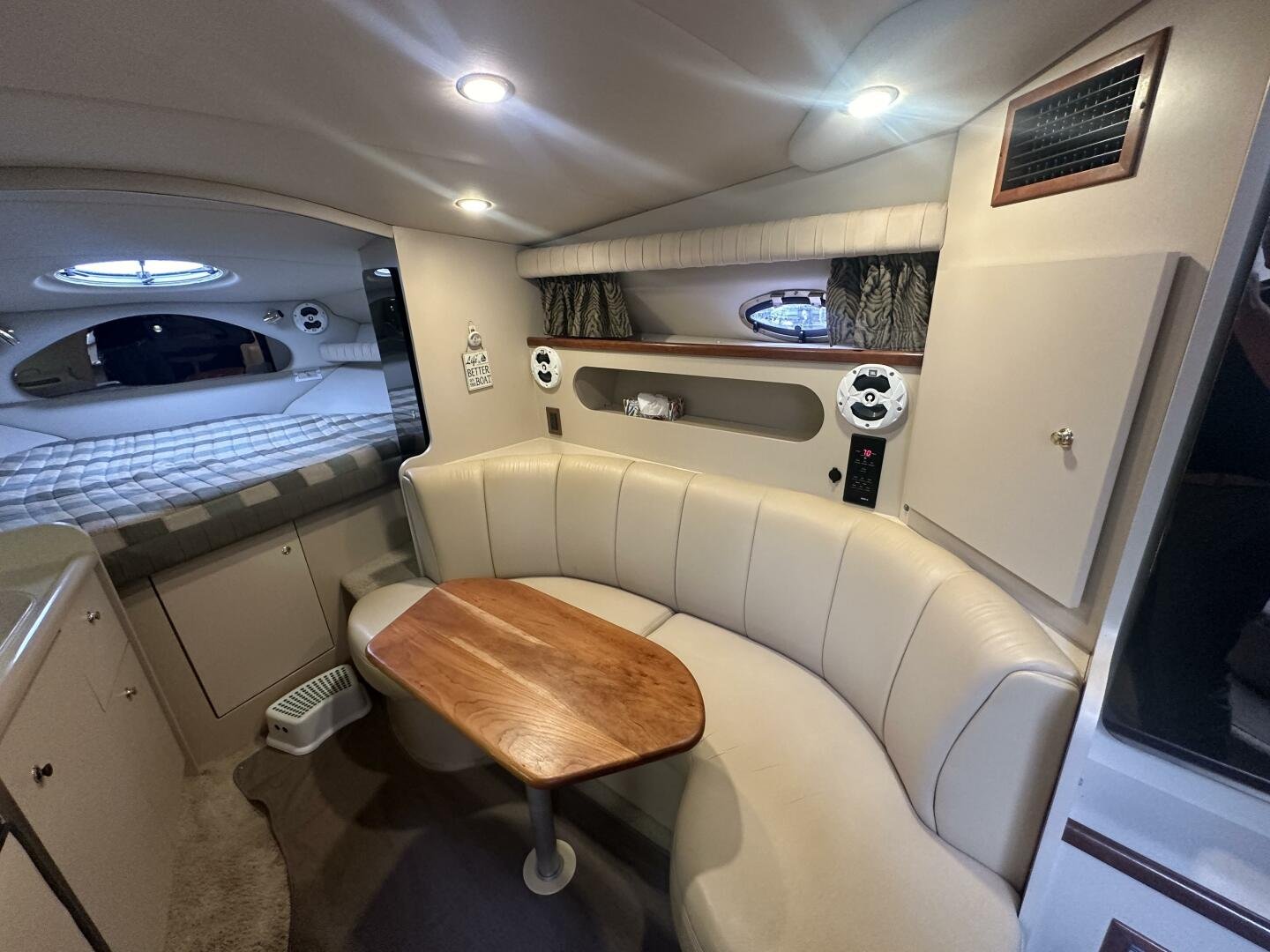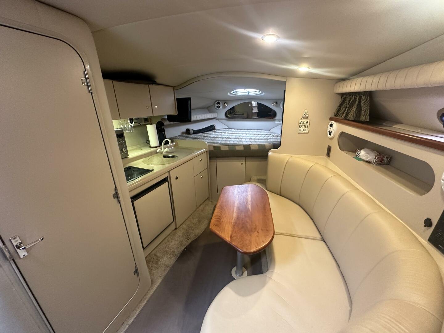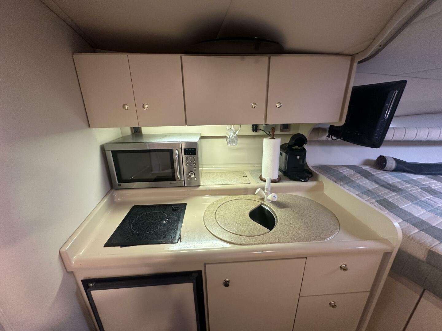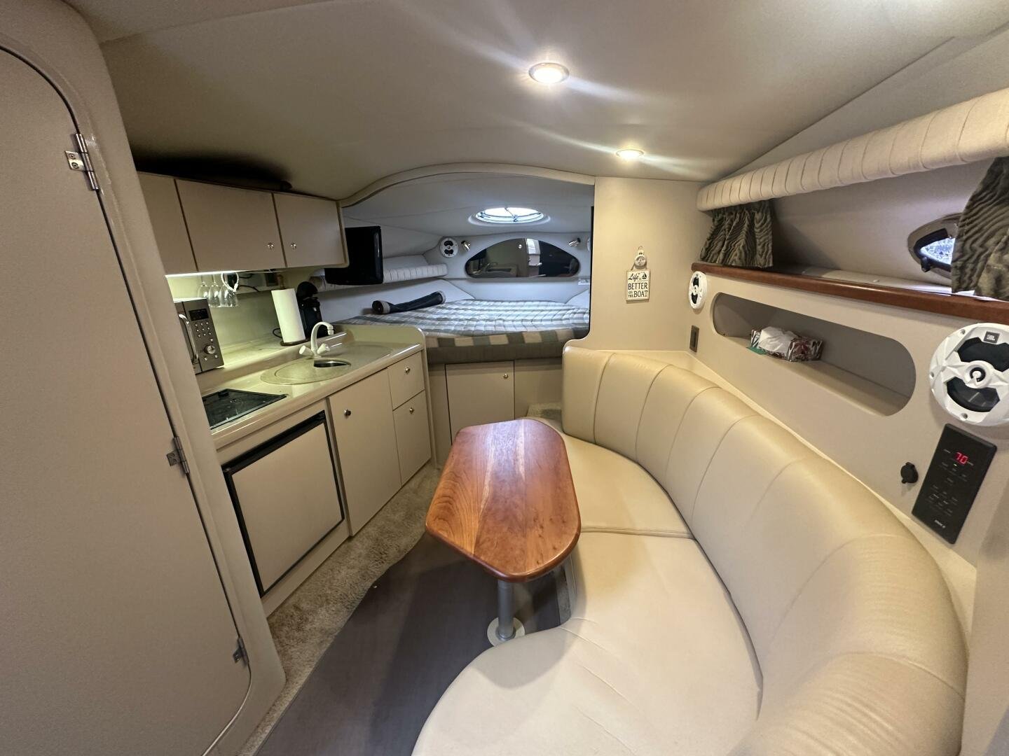 Down below there is a spacious aft seating area that converts to sleeping quarters. To port you have a large seating area and table that converts to additional sleeping accommodations. On the starboard side, there is a wet-head, galley area with a single burner, fridge, sink, and microwave. The v-birth has a large sleeping area, and ample closet storage.