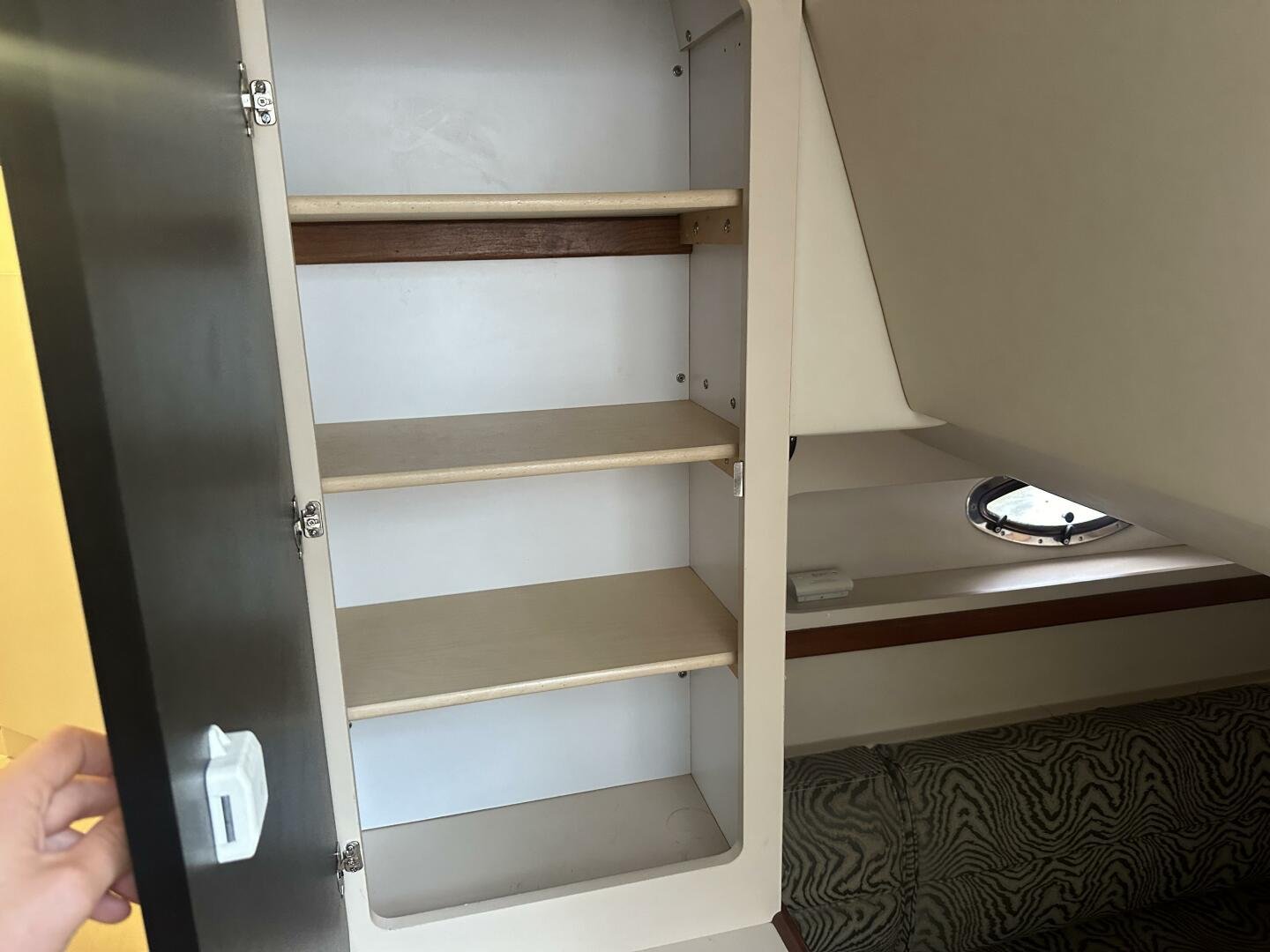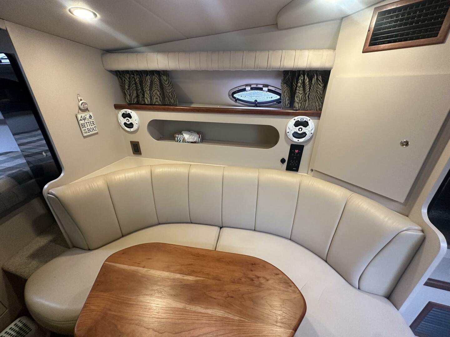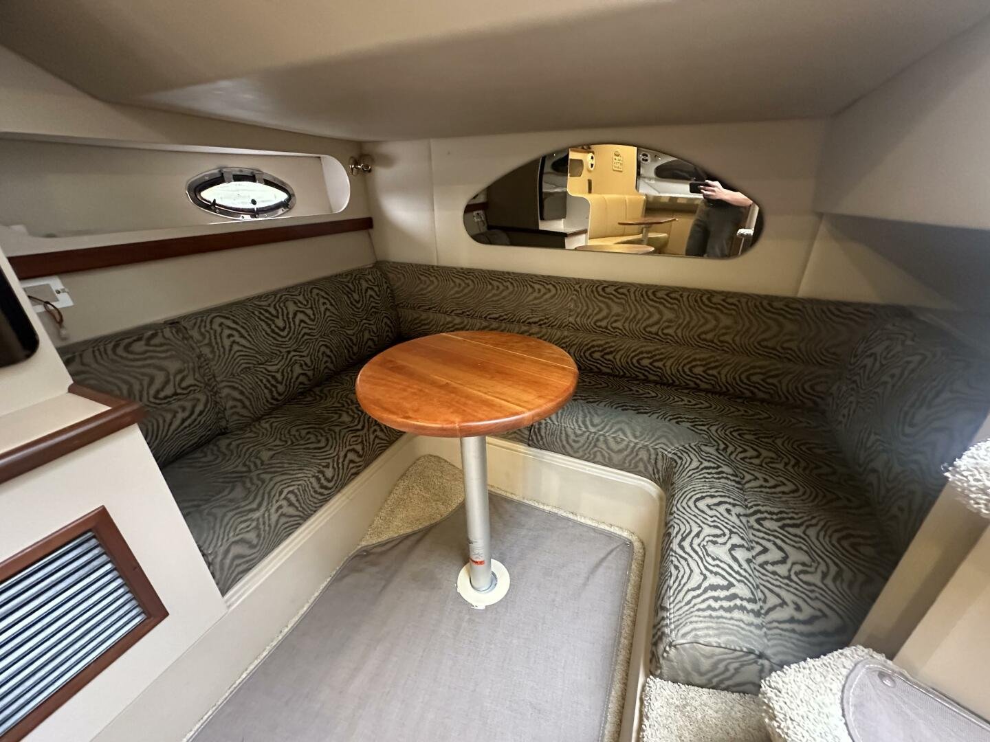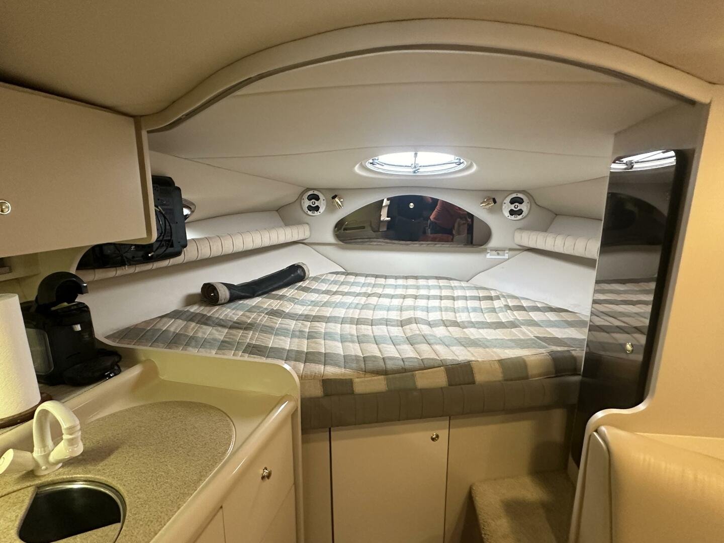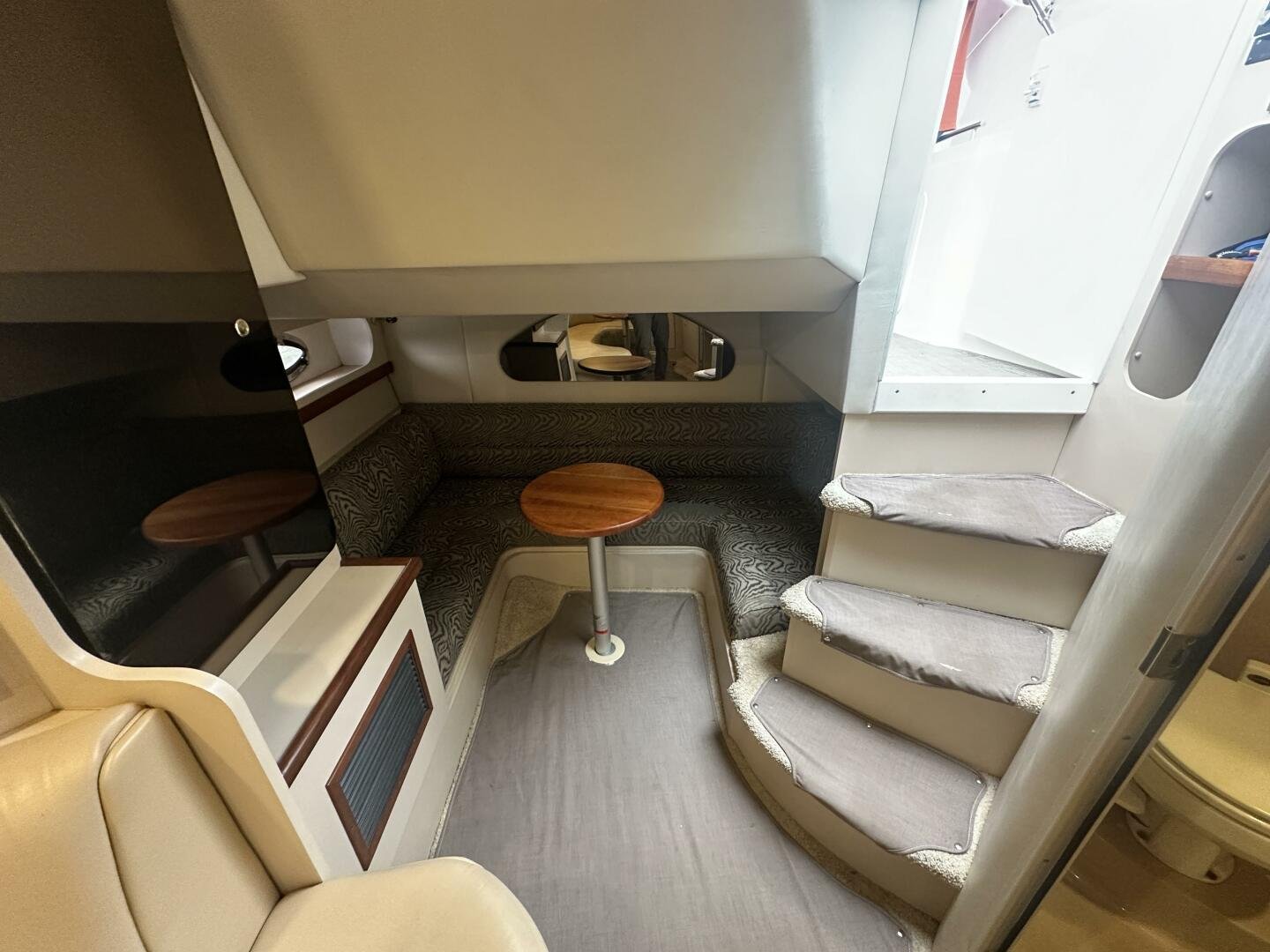 Down below there is a spacious aft seating area that converts to sleeping quarters. To port you have a large seating area and table that converts to additional sleeping accommodations. On the starboard side, there is a wet-head, galley area with a single burner, fridge, sink, and microwave. The v-birth has a large sleeping area, and ample closet storage.