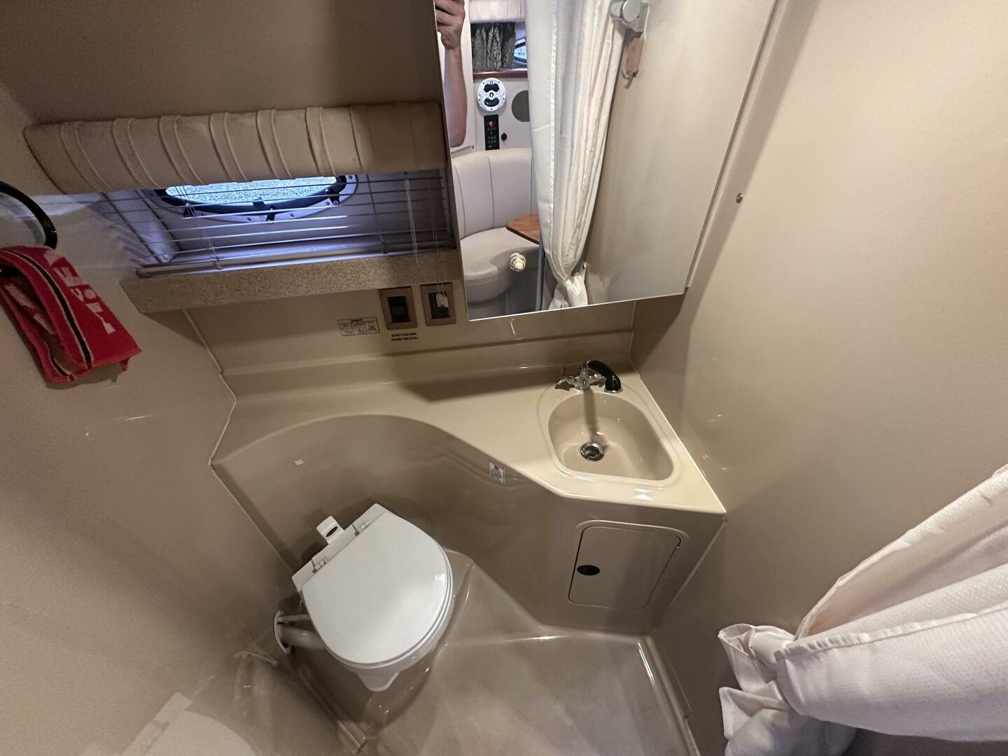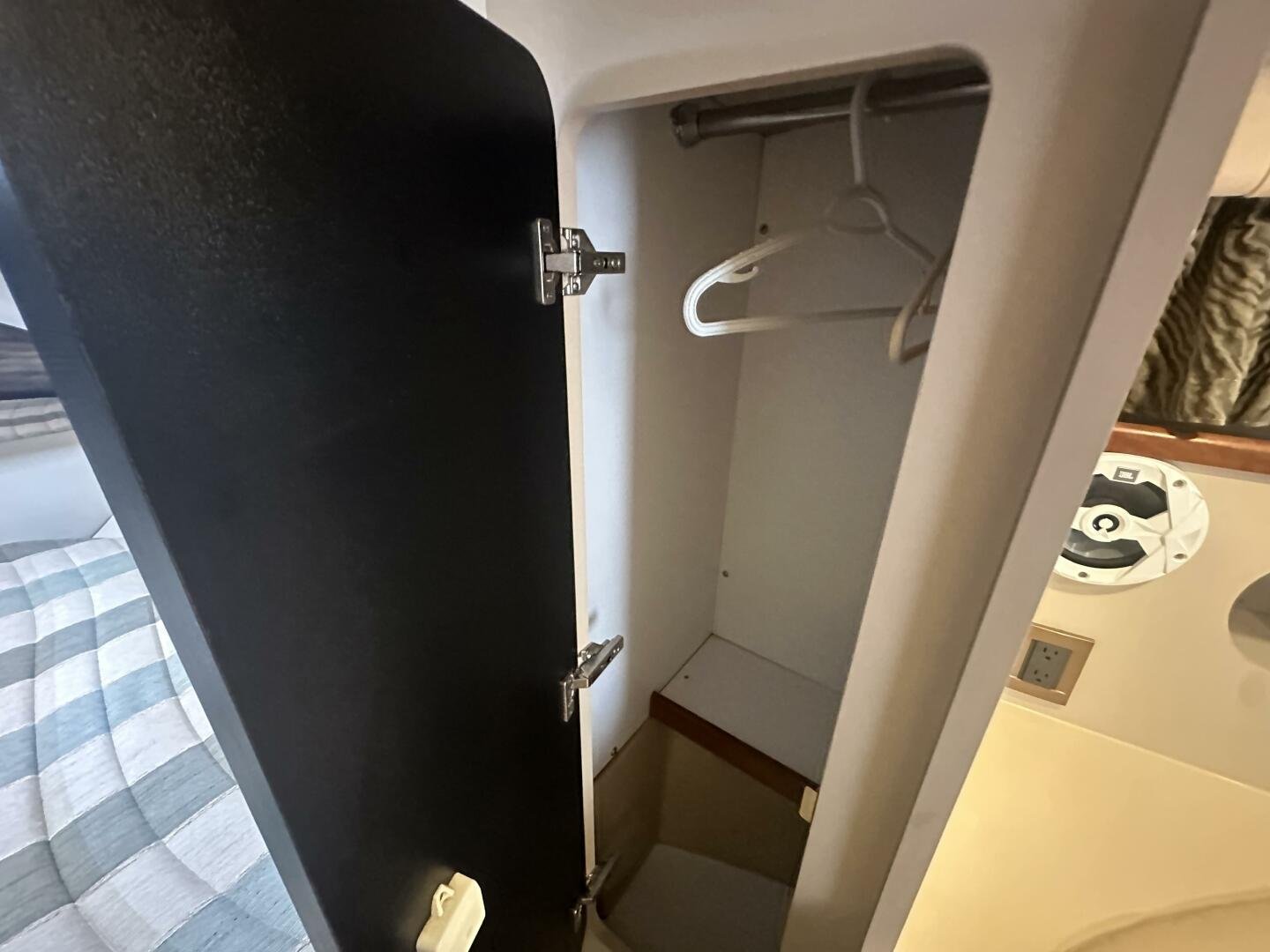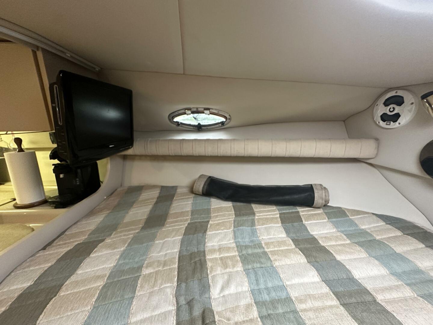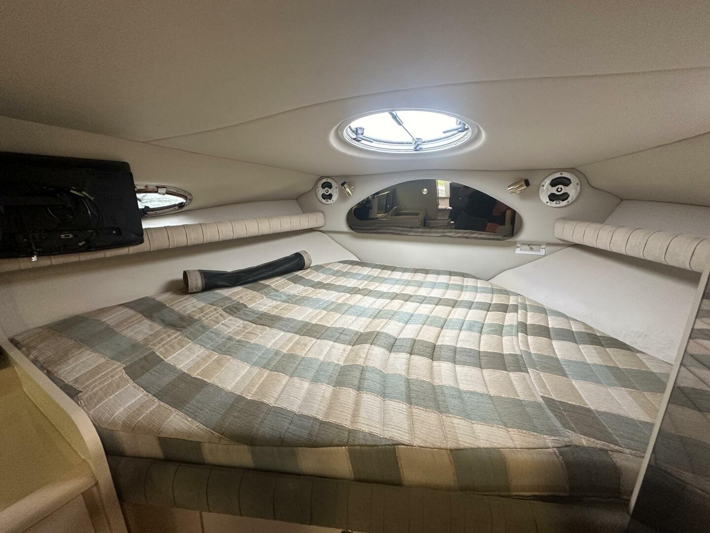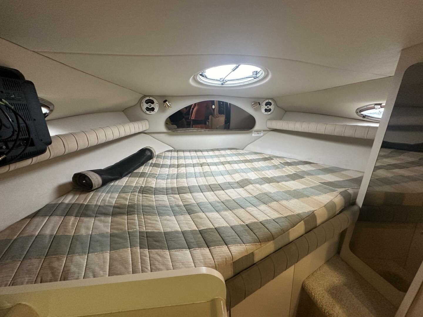 Down below there is a spacious aft seating area that converts to sleeping quarters. To port you have a large seating area and table that converts to additional sleeping accommodations. On the starboard side, there is a wet-head, galley area with a single burner, fridge, sink, and microwave. The v-birth has a large sleeping area, and ample closet storage.
