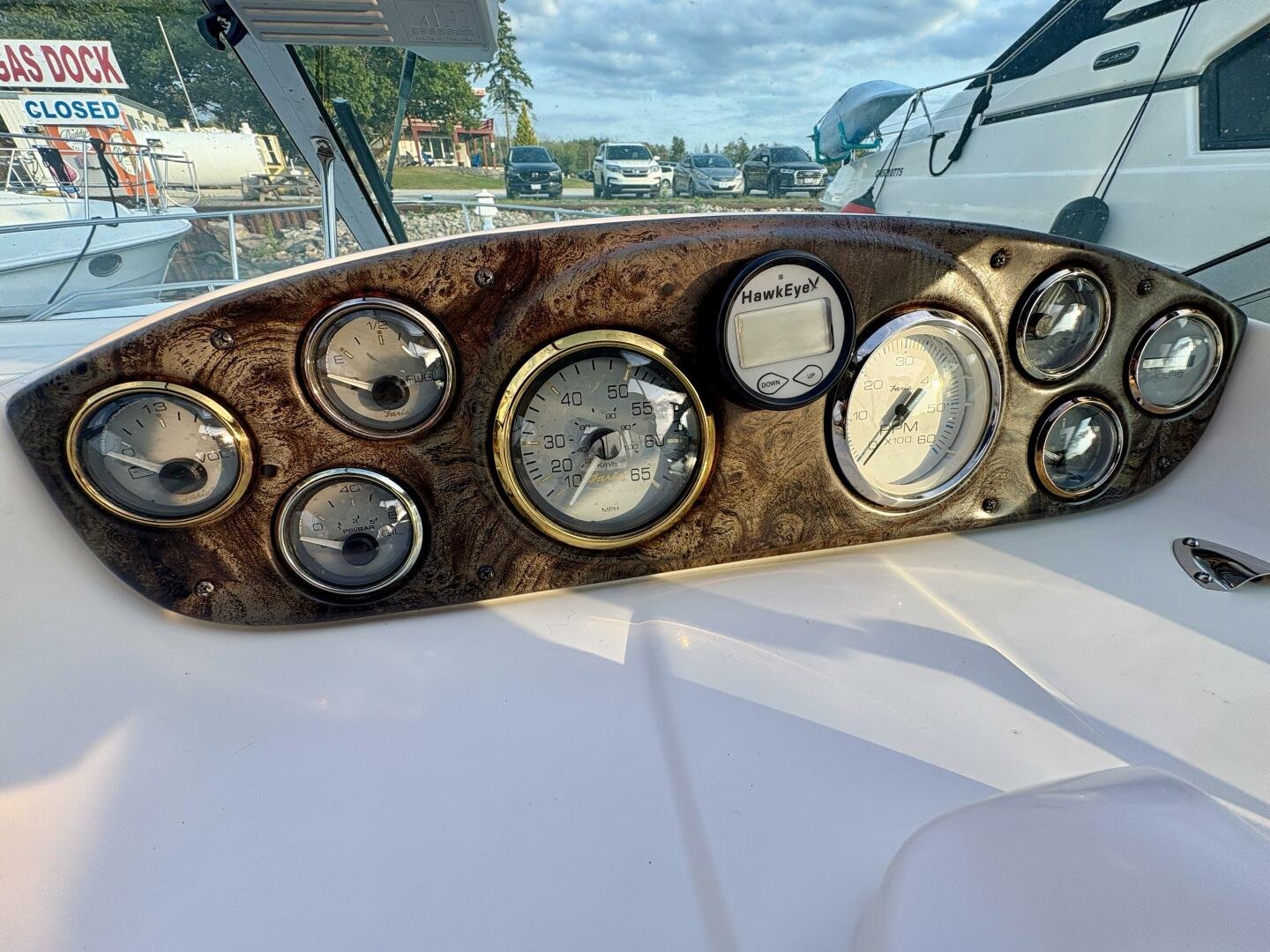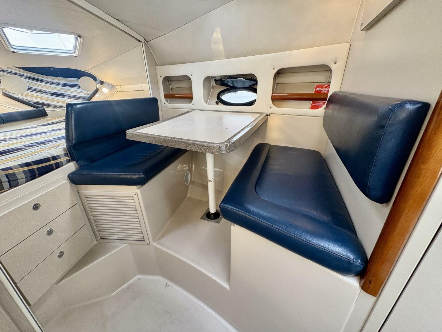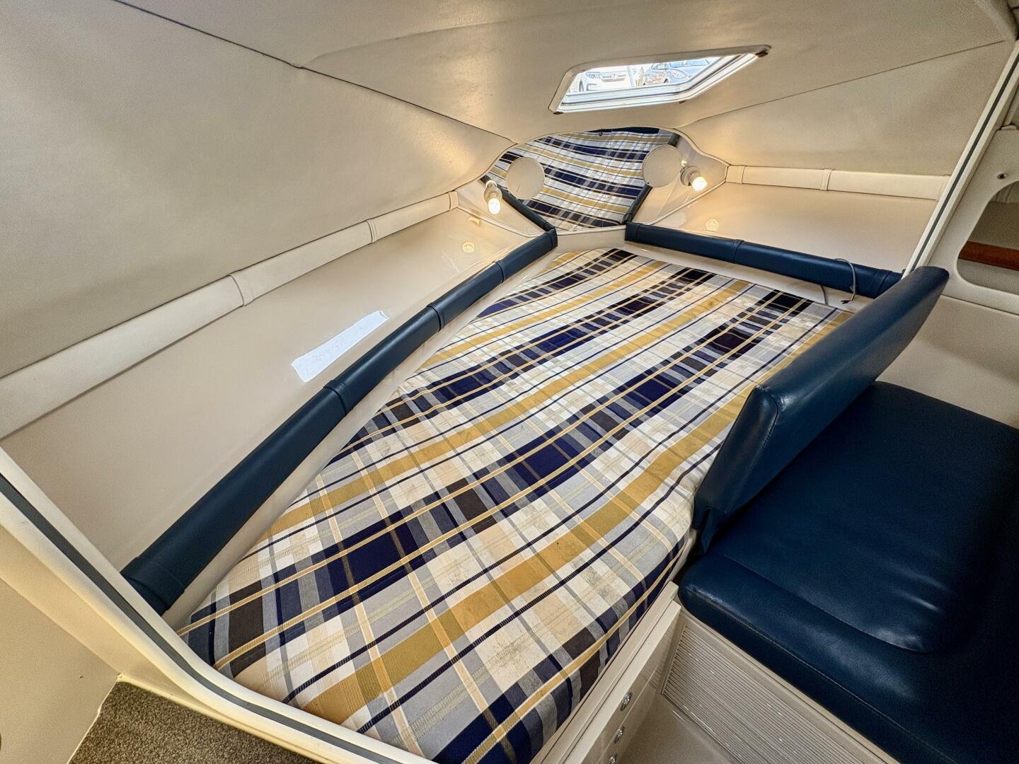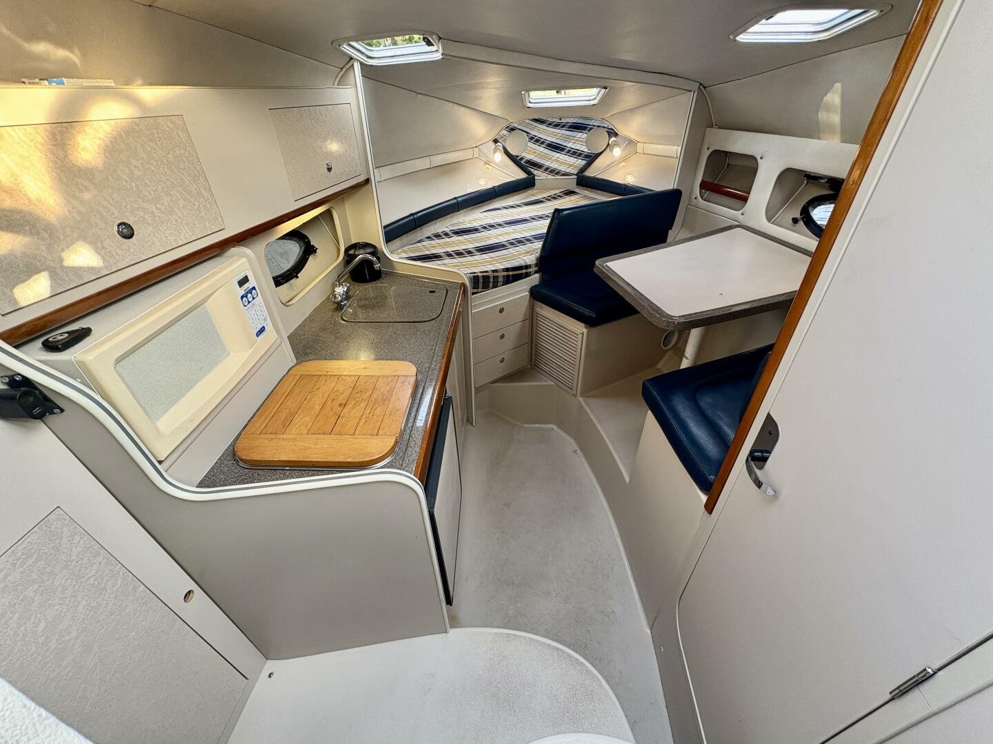 The spacious cockpit features plenty of seating, transom shower with hot water, a wet bar, fridge, and a custom made wooden table. Below deck, you’ll find a well-appointed cabin with a full galley, generous sleeping accommodations, with a large convertible dinette, queen mid-cabin berth, and enclosed head with shower. Three overhead hatches with screens provide excellent natural light and ventilation. Recent upgrades include a Raymarine charplotter, extended swimplatform, BBQ, 5000W inverter, and a 2023 gala dingy with 15hp engine with caddy included. This boat really offers great value for a 30ft express cruiser.