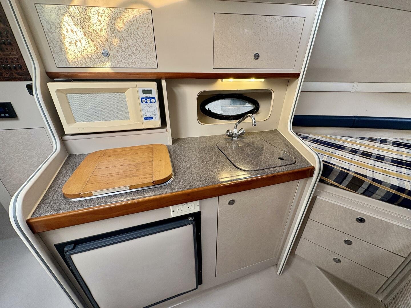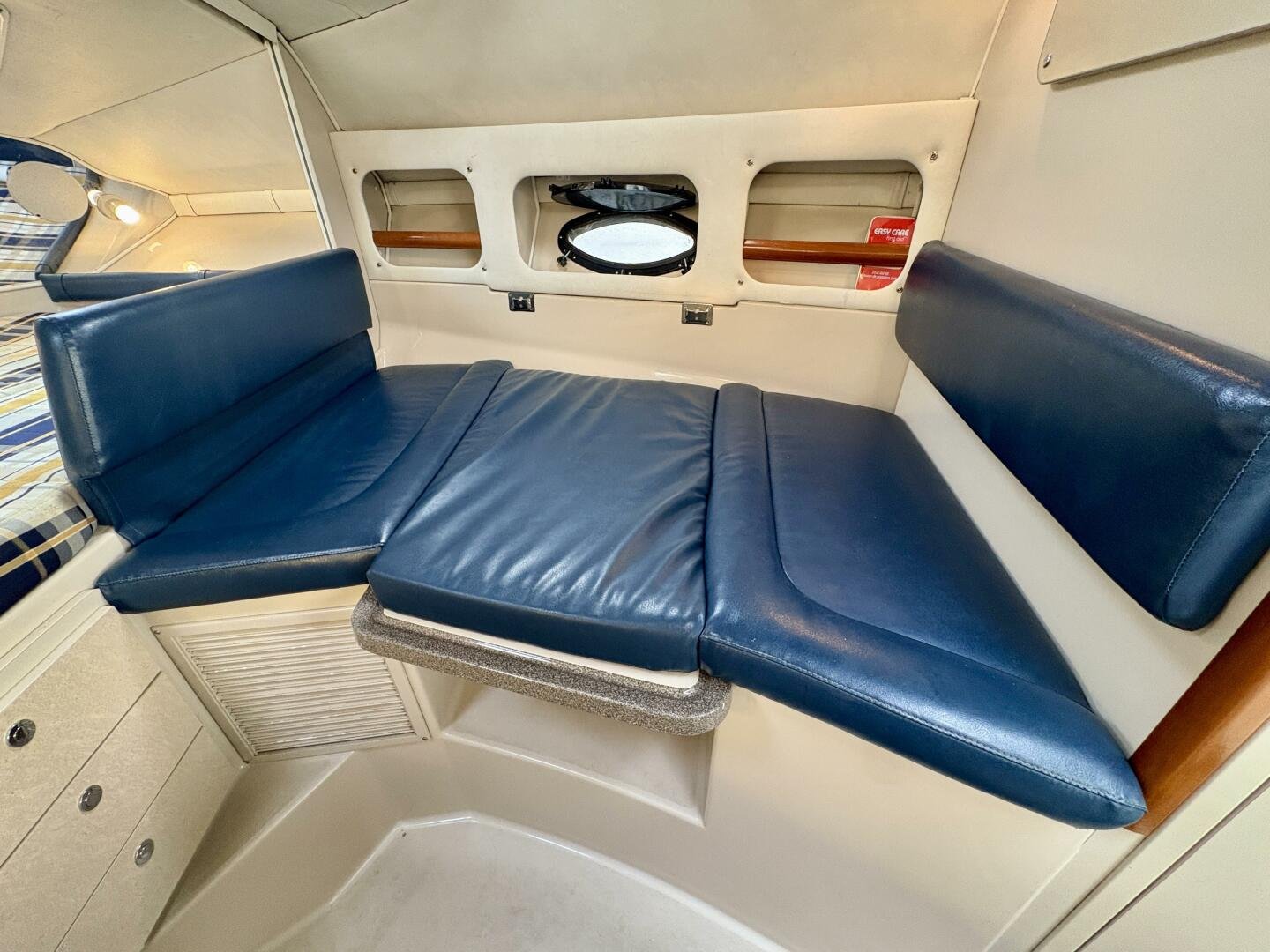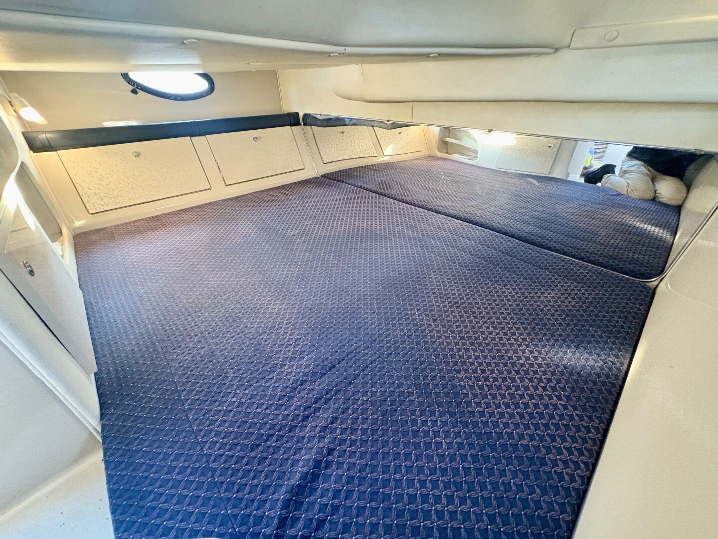 The spacious cockpit features plenty of seating, transom shower with hot water, a wet bar, fridge, and a custom made wooden table. Below deck, you’ll find a well-appointed cabin with a full galley, generous sleeping accommodations, with a large convertible dinette, queen mid-cabin berth, and enclosed head with shower. Three overhead hatches with screens provide excellent natural light and ventilation. Recent upgrades include a Raymarine charplotter, extended swimplatform, BBQ, 5000W inverter, and a 2023 gala dingy with 15hp engine with caddy included. This boat really offers great value for a 30ft express cruiser.