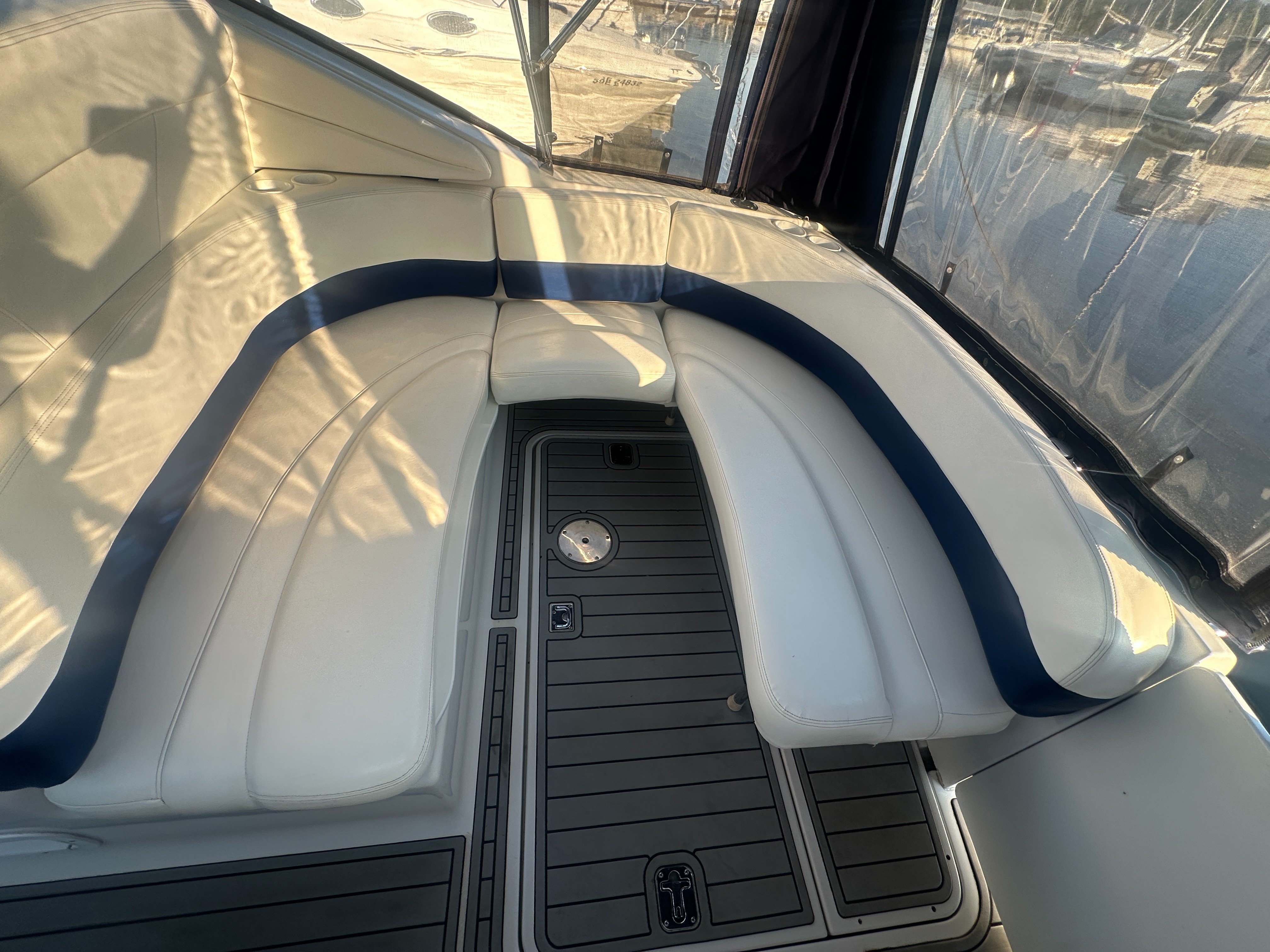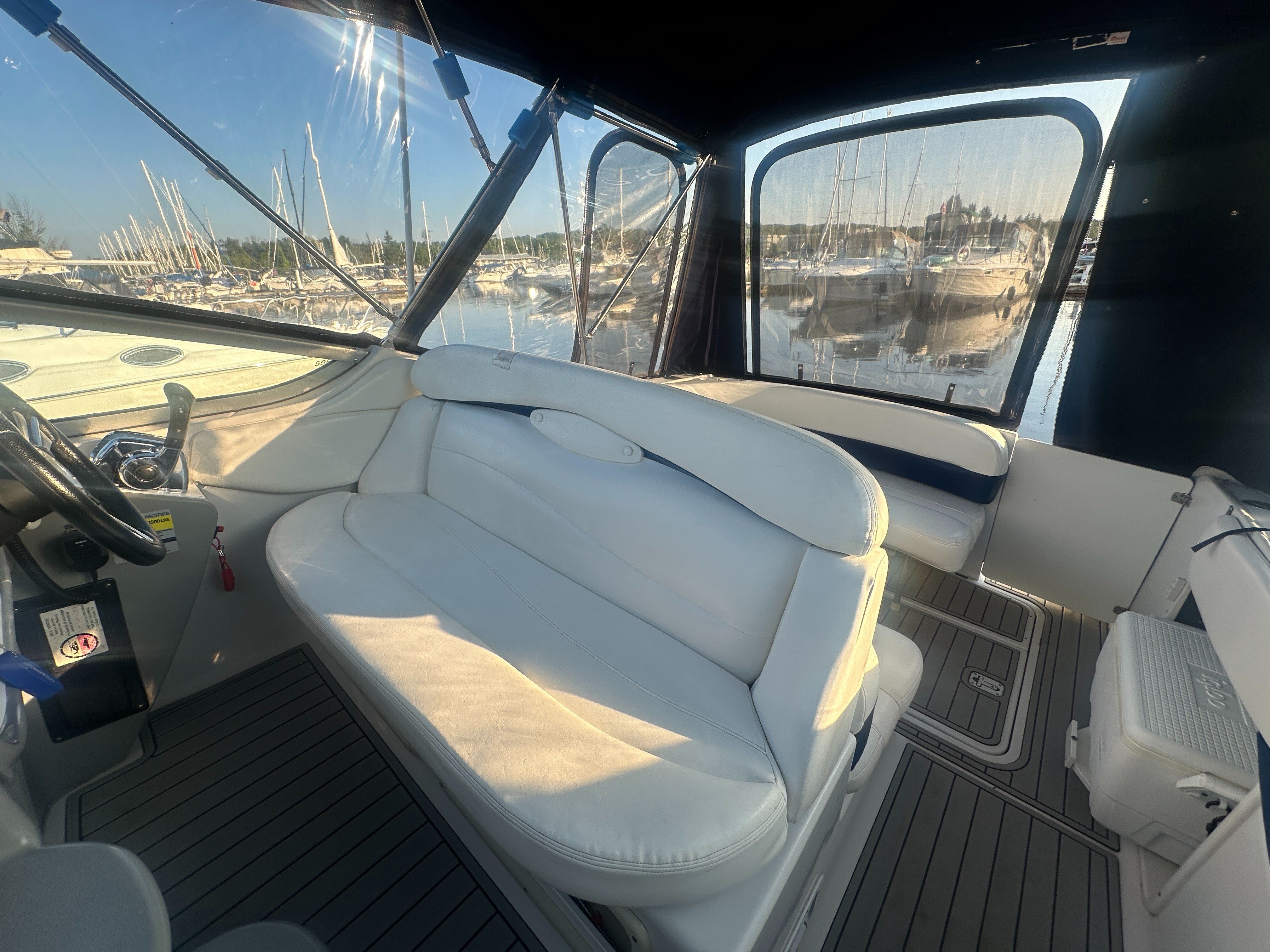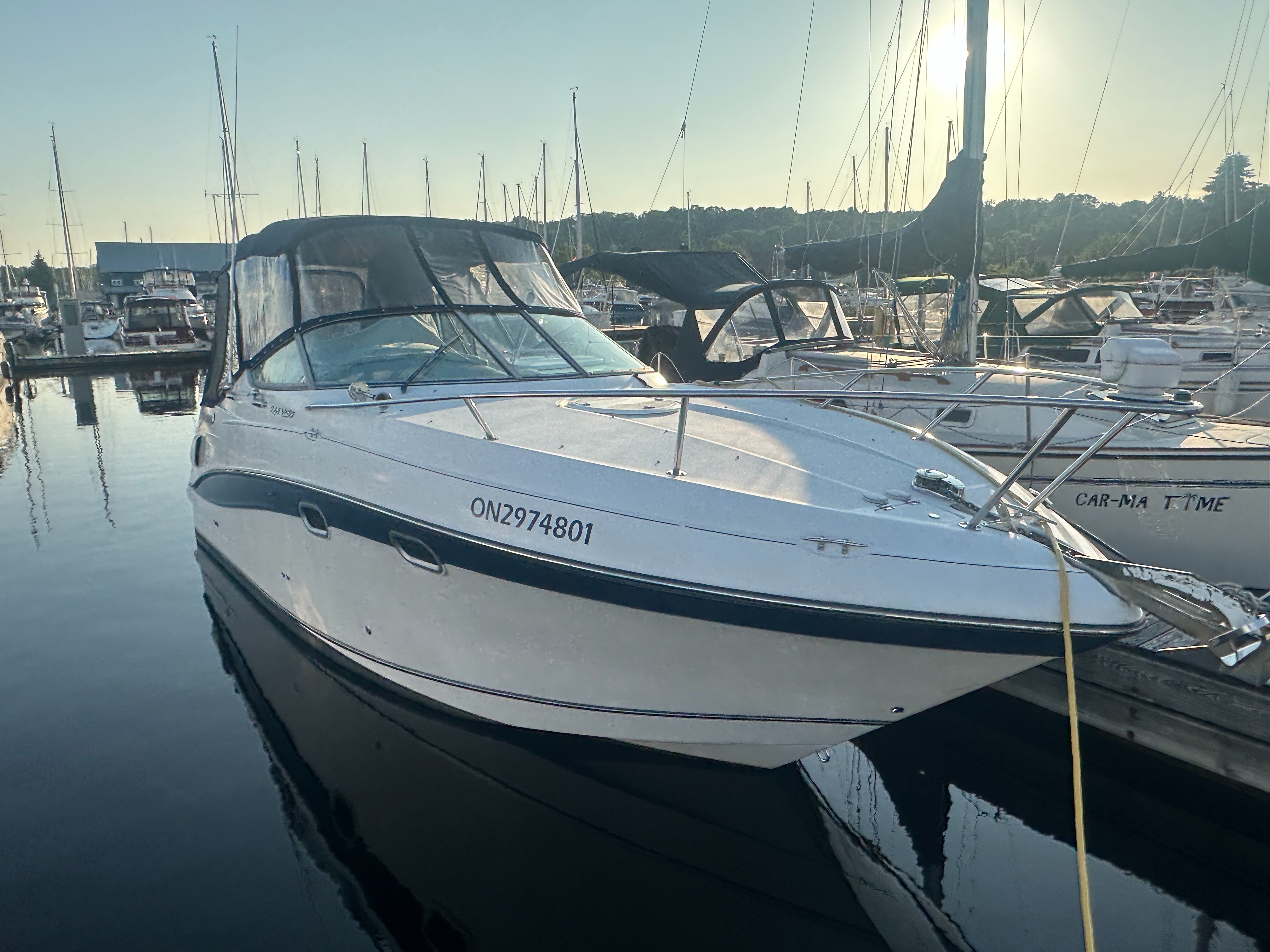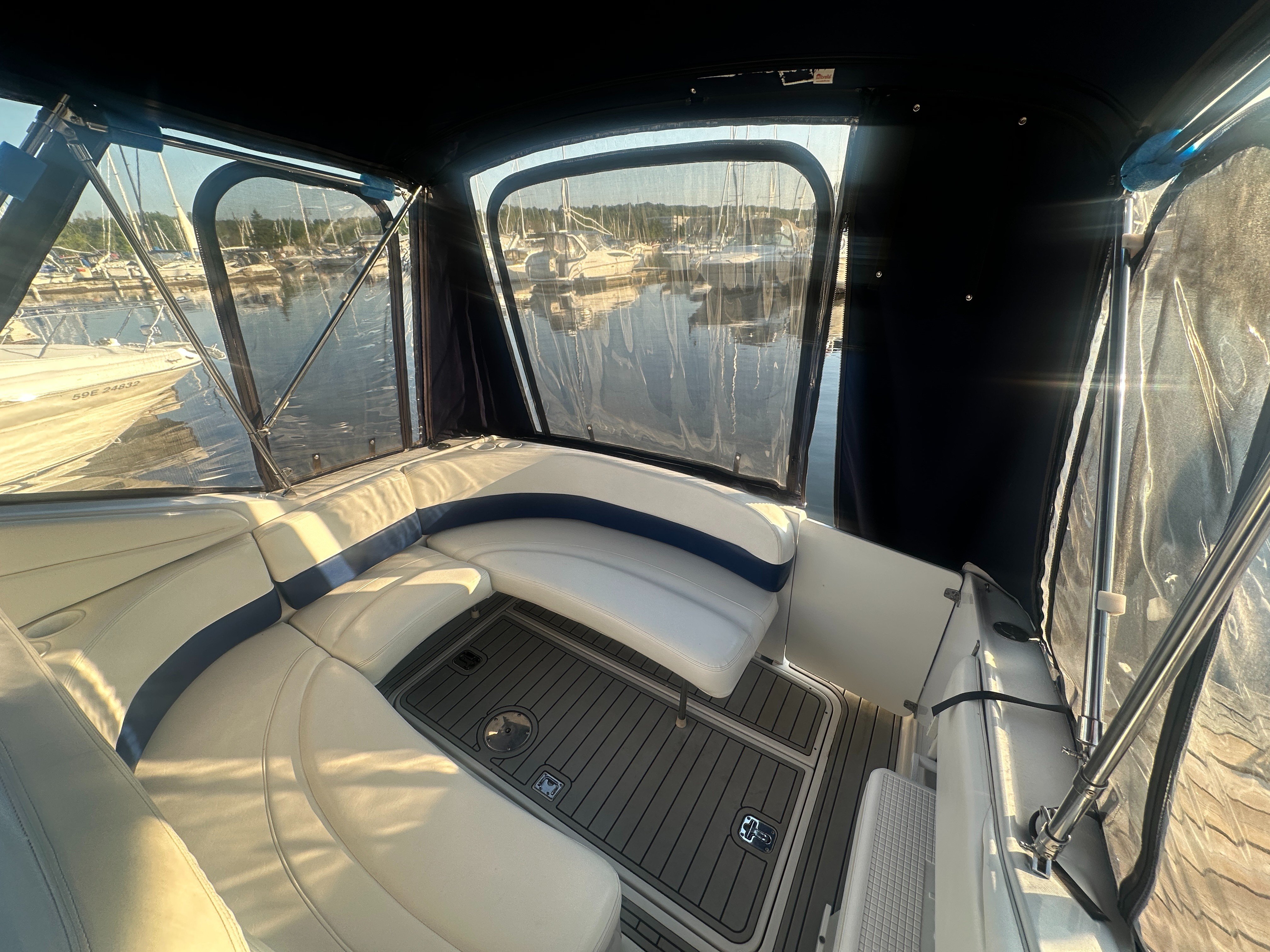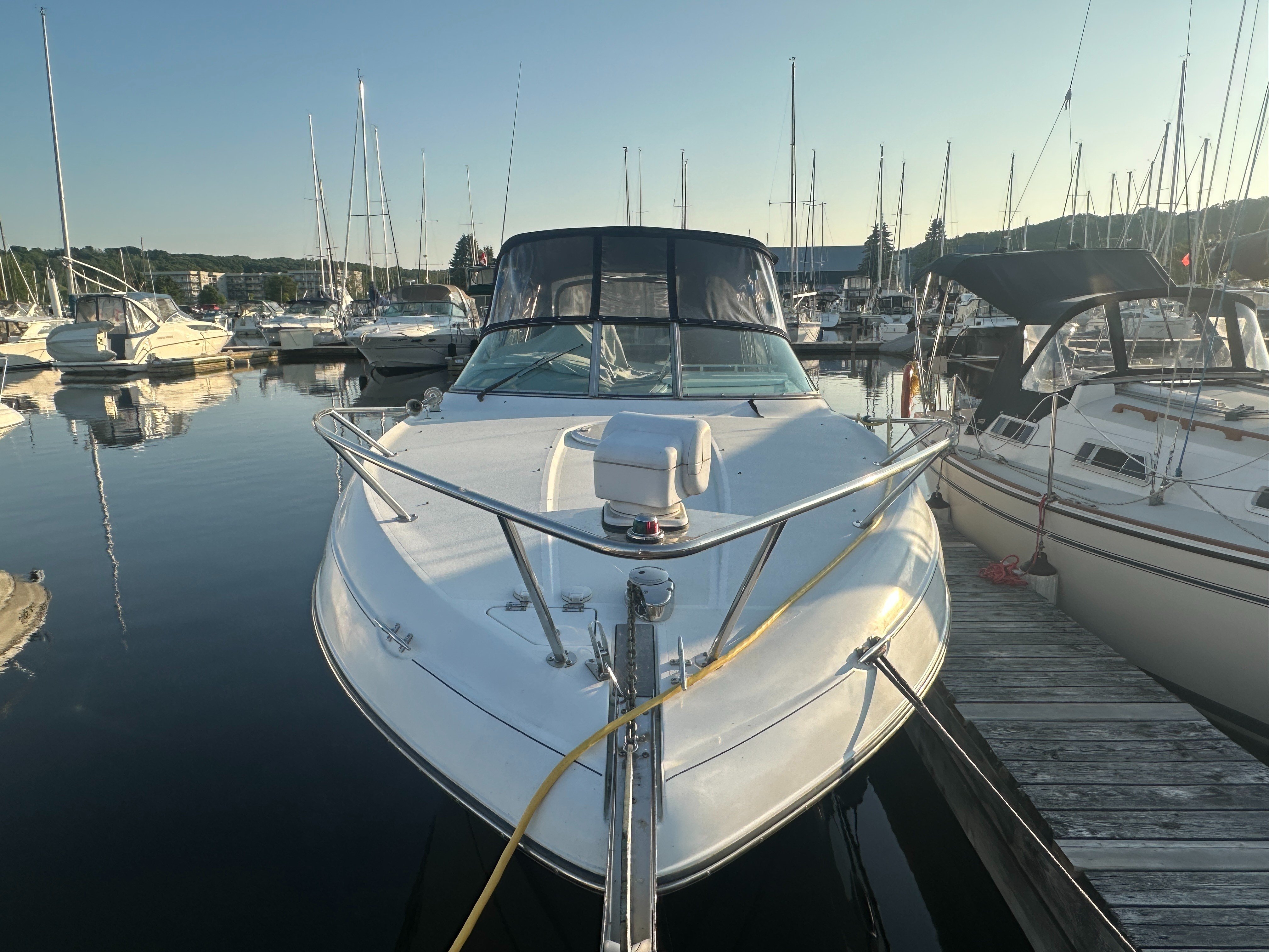 A clean, updated, and upgraded single engine family cruiser. Powered by a 5.7L Volvo with 650 hours, paired with a 3 year old drive. The canvas is in good shape, the helm features a new 12 inch Raymarine, and the tabs have new trim rams. The boat also features a comfortable layout and heat/ac, and has a trailable beam without permits.