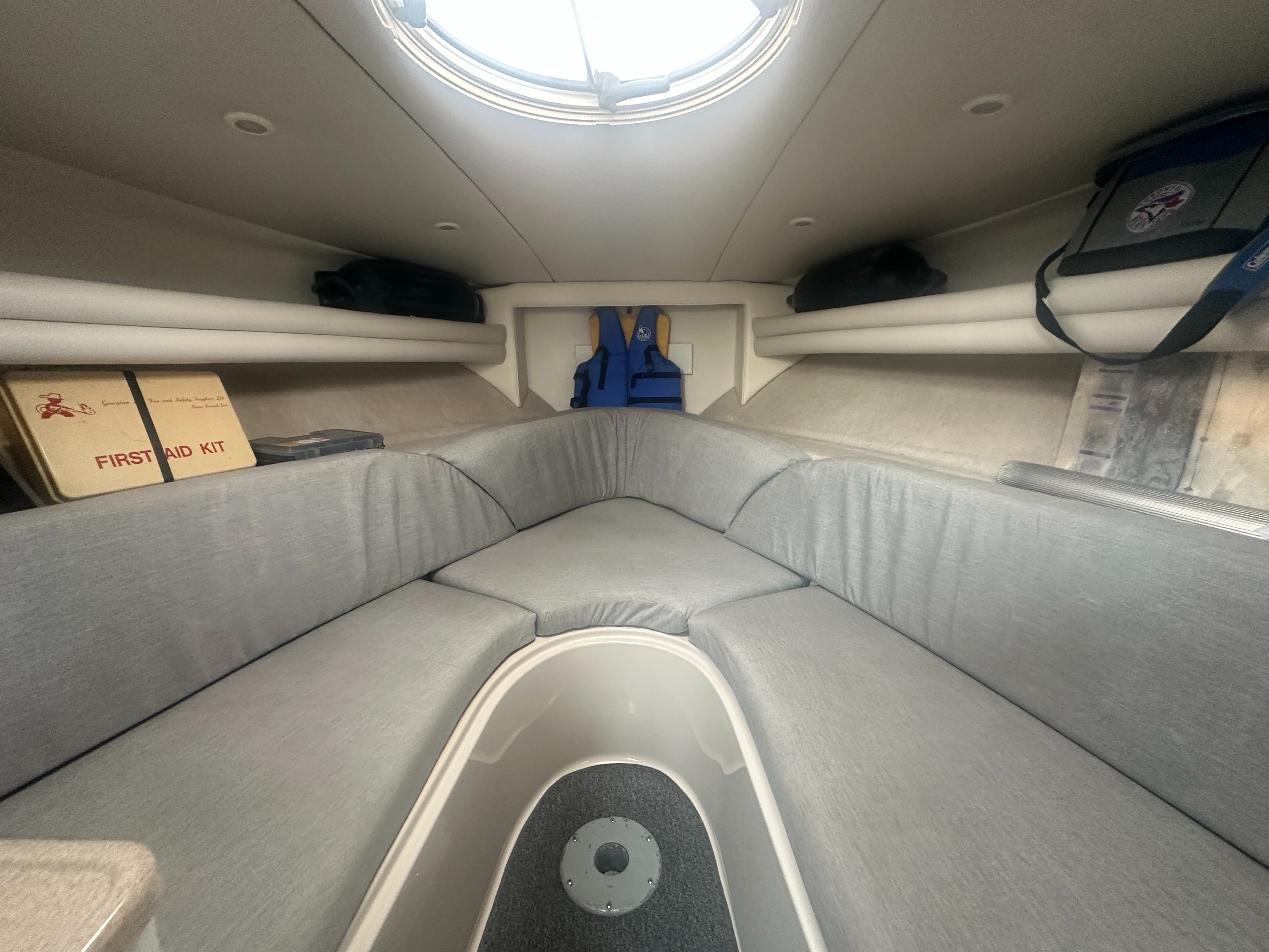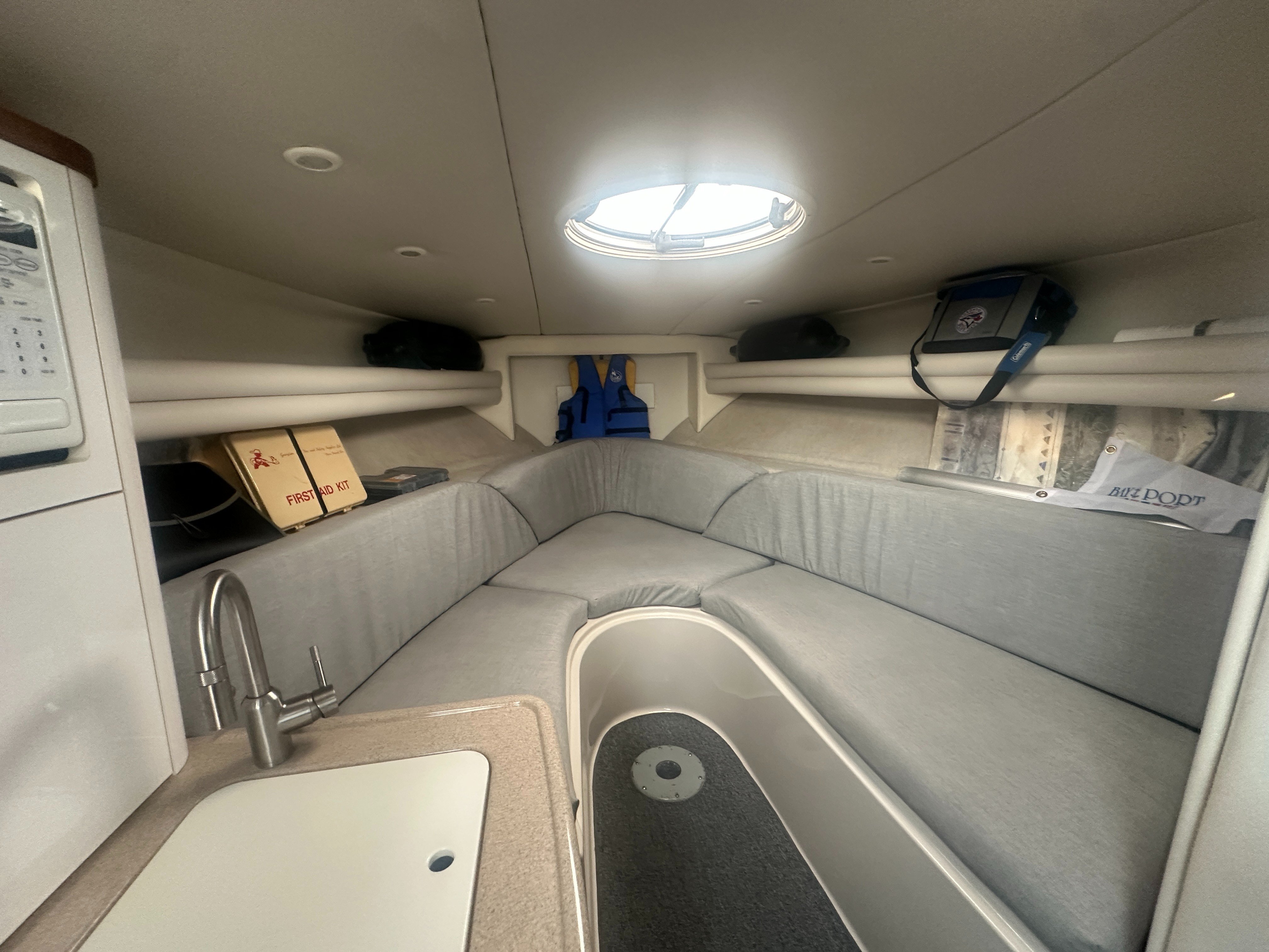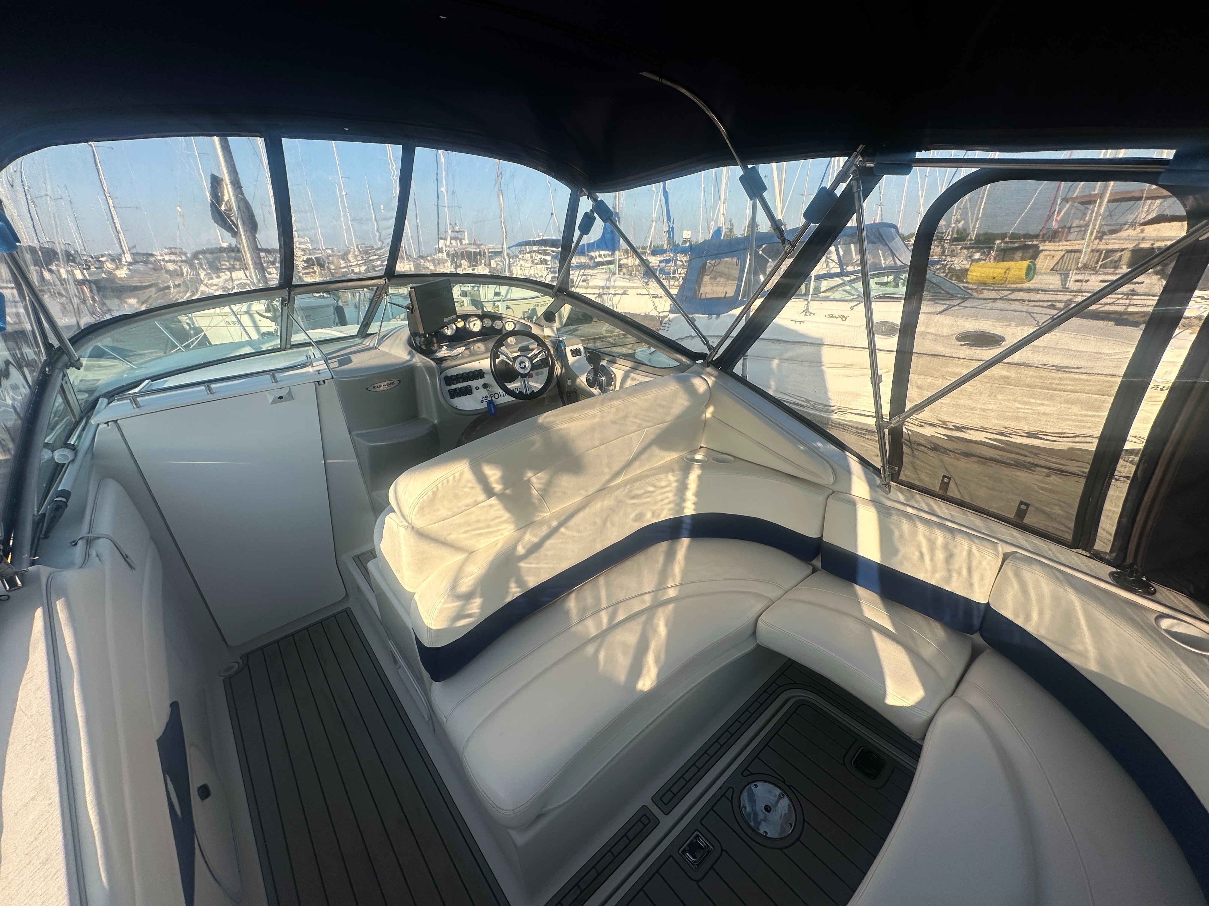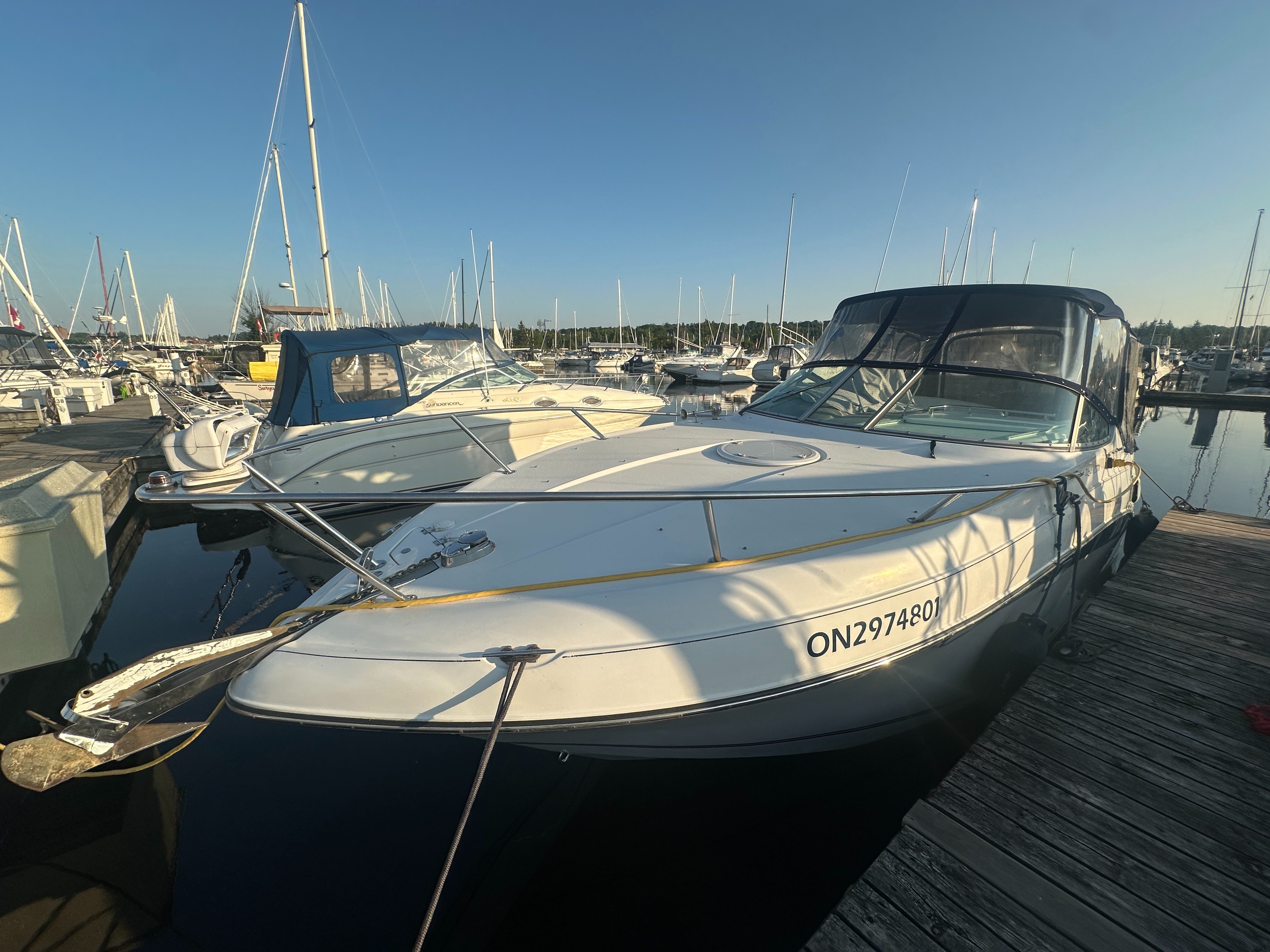 A clean, updated, and upgraded single engine family cruiser. Powered by a 5.7L Volvo with 650 hours, paired with a 3 year old drive. The canvas is in good shape, the helm features a new 12 inch Raymarine, and the tabs have new trim rams. The boat also features a comfortable layout and heat/ac, and has a trailable beam without permits.