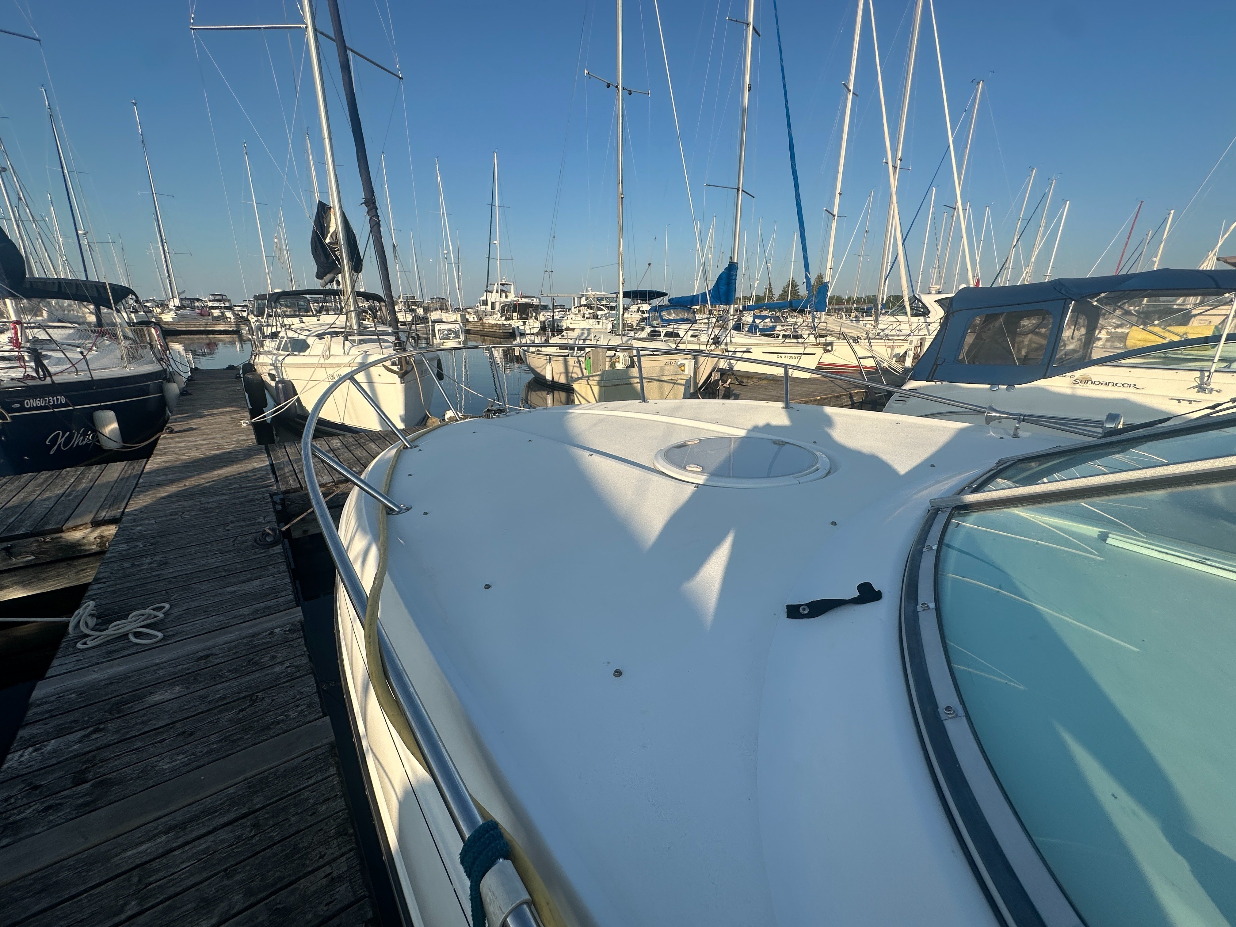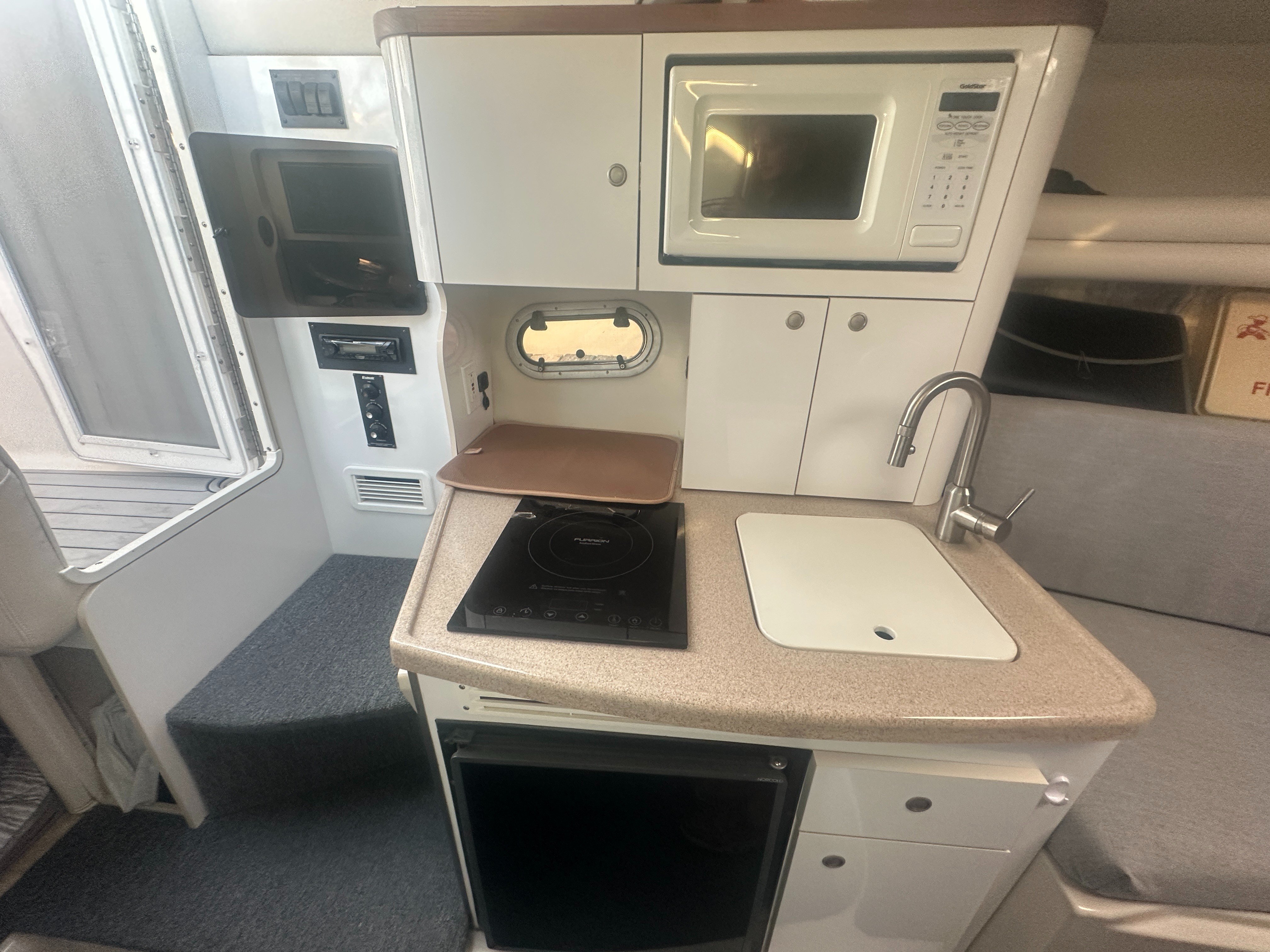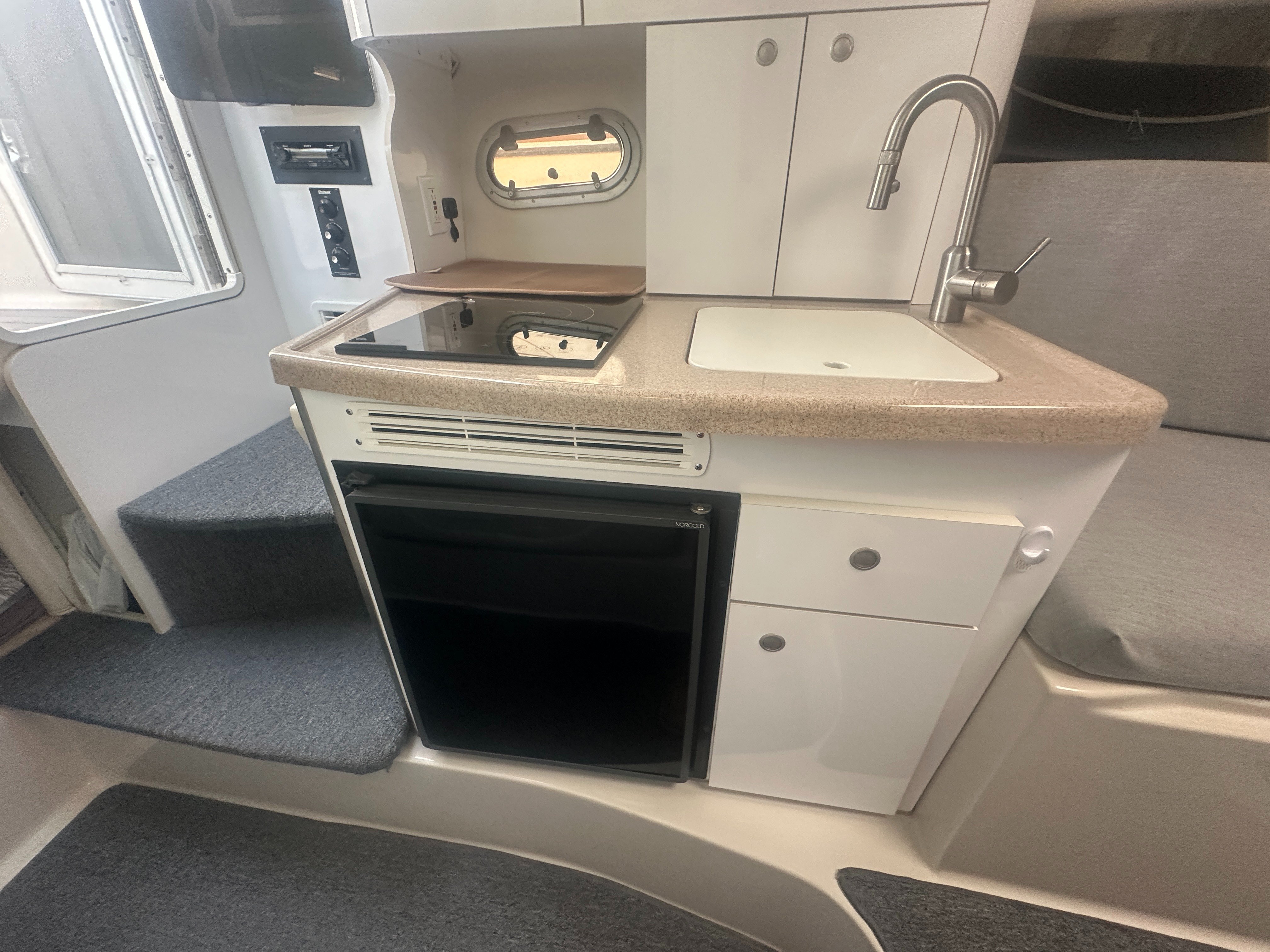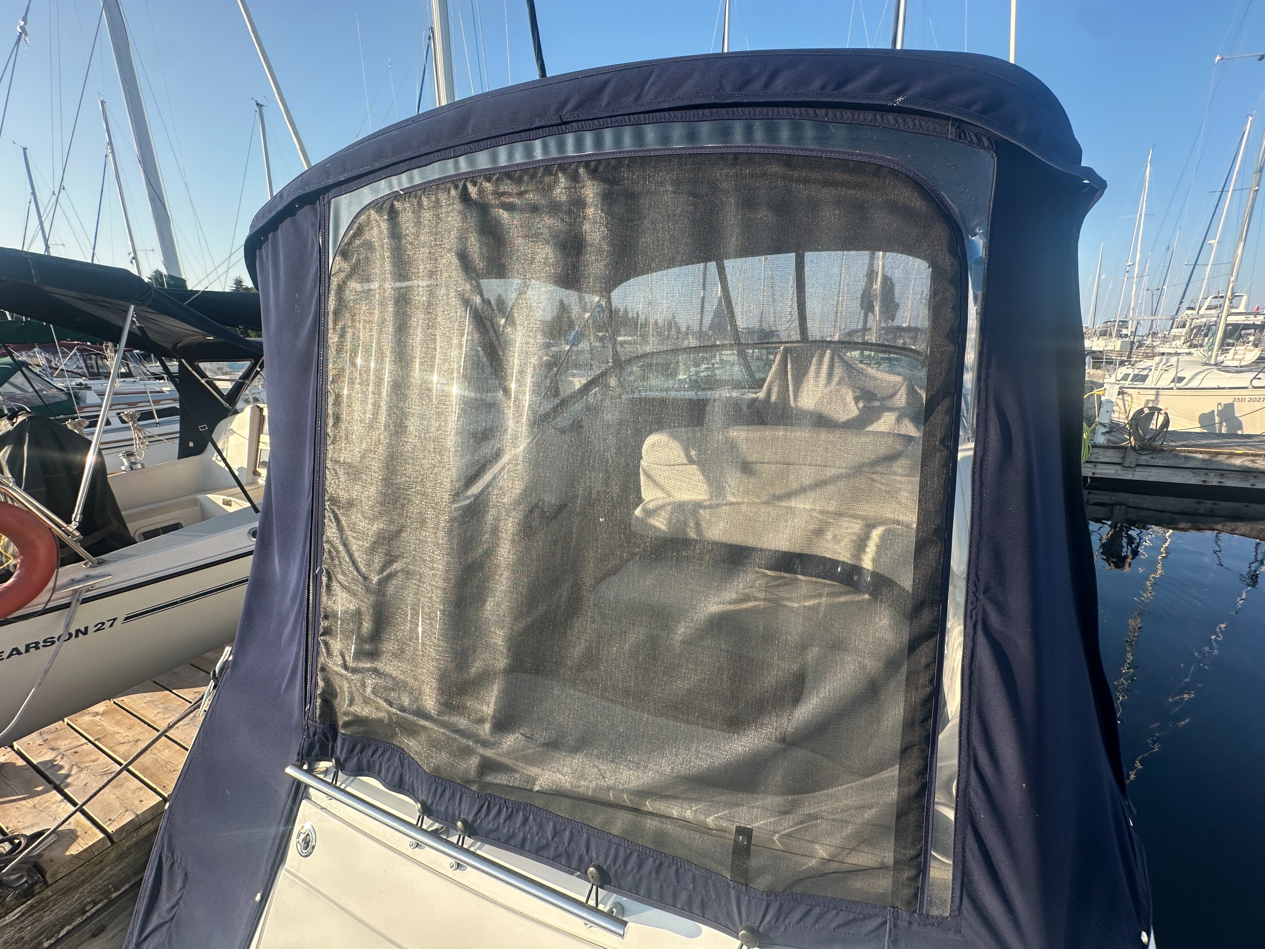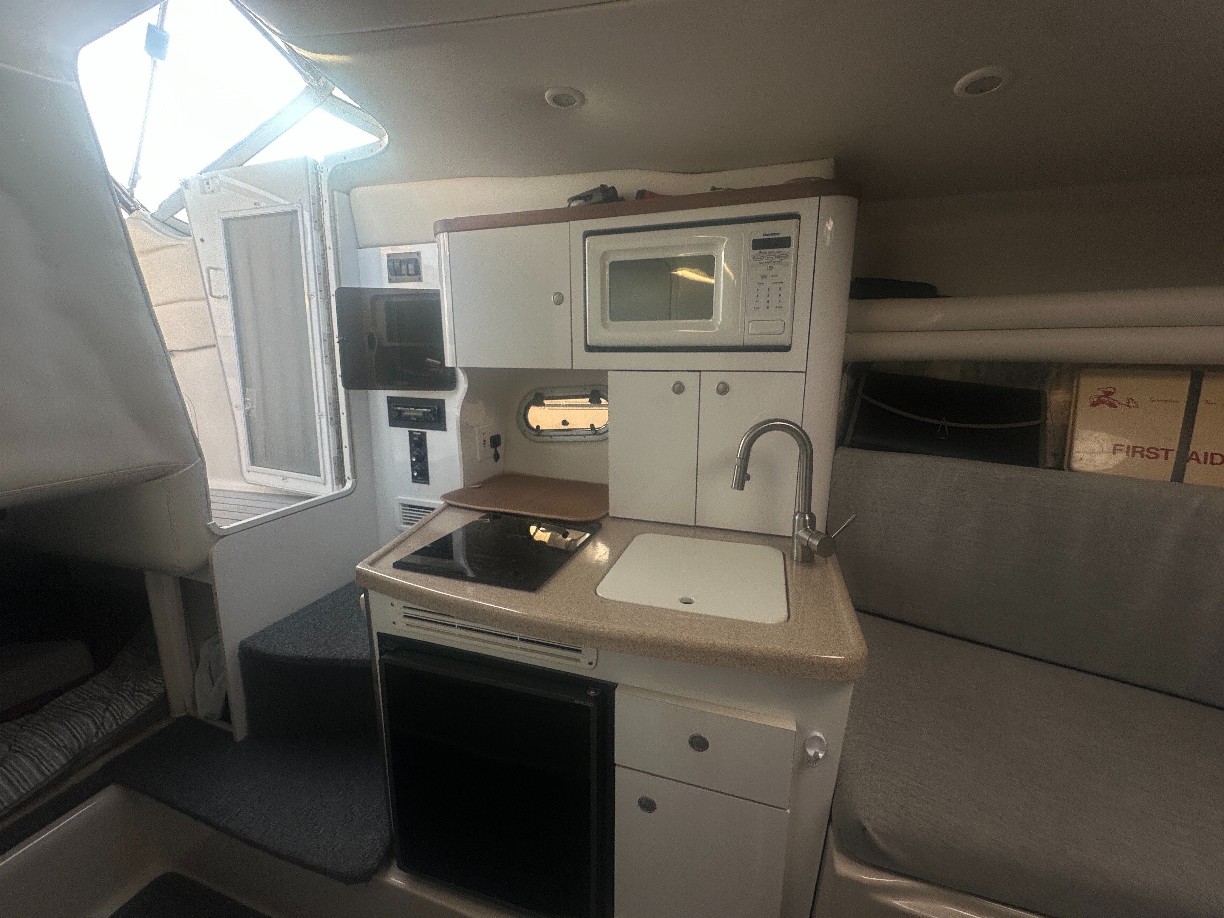 A clean, updated, and upgraded single engine family cruiser. Powered by a 5.7L Volvo with 650 hours, paired with a 3 year old drive. The canvas is in good shape, the helm features a new 12 inch Raymarine, and the tabs have new trim rams. The boat also features a comfortable layout and heat/ac, and has a trailable beam without permits.