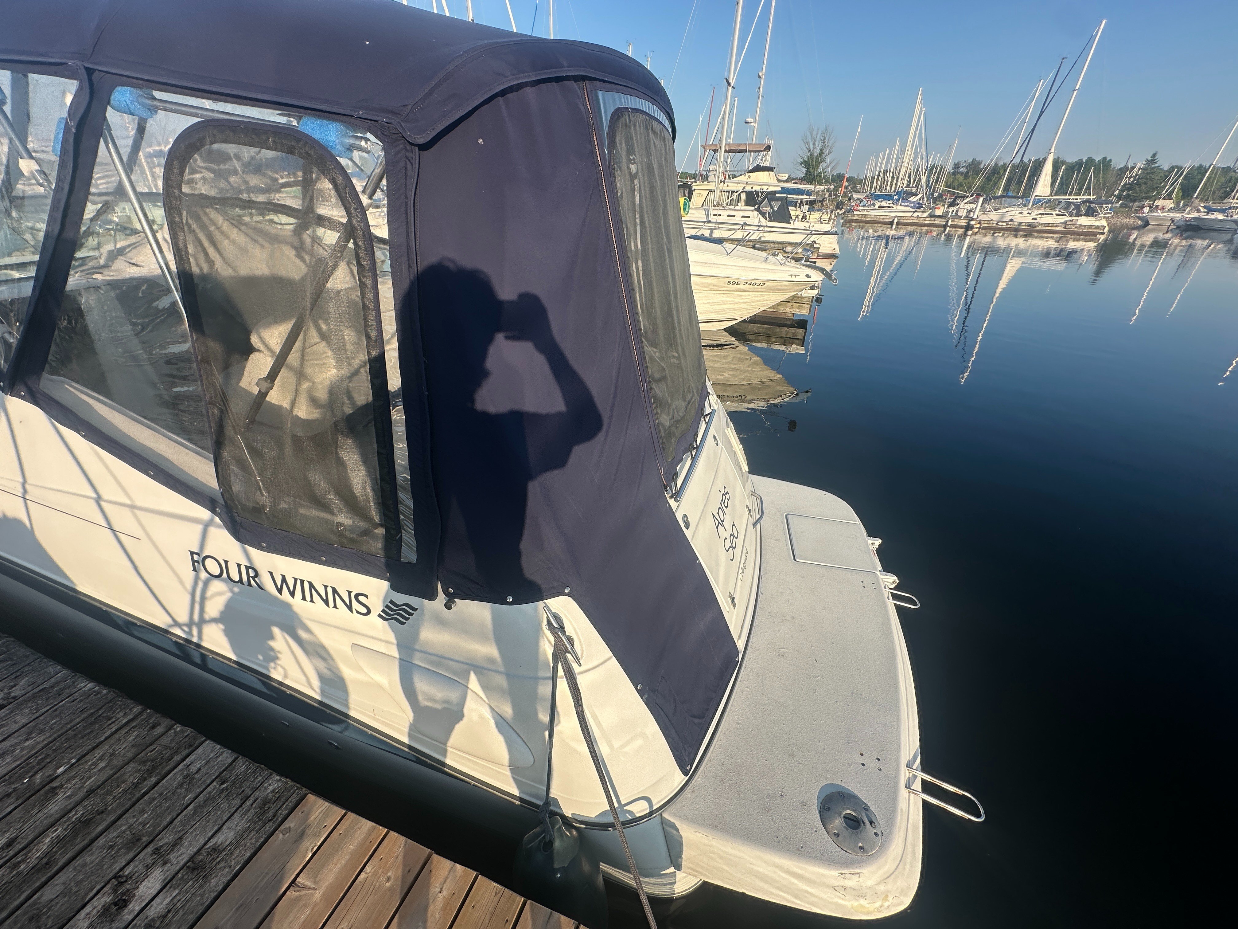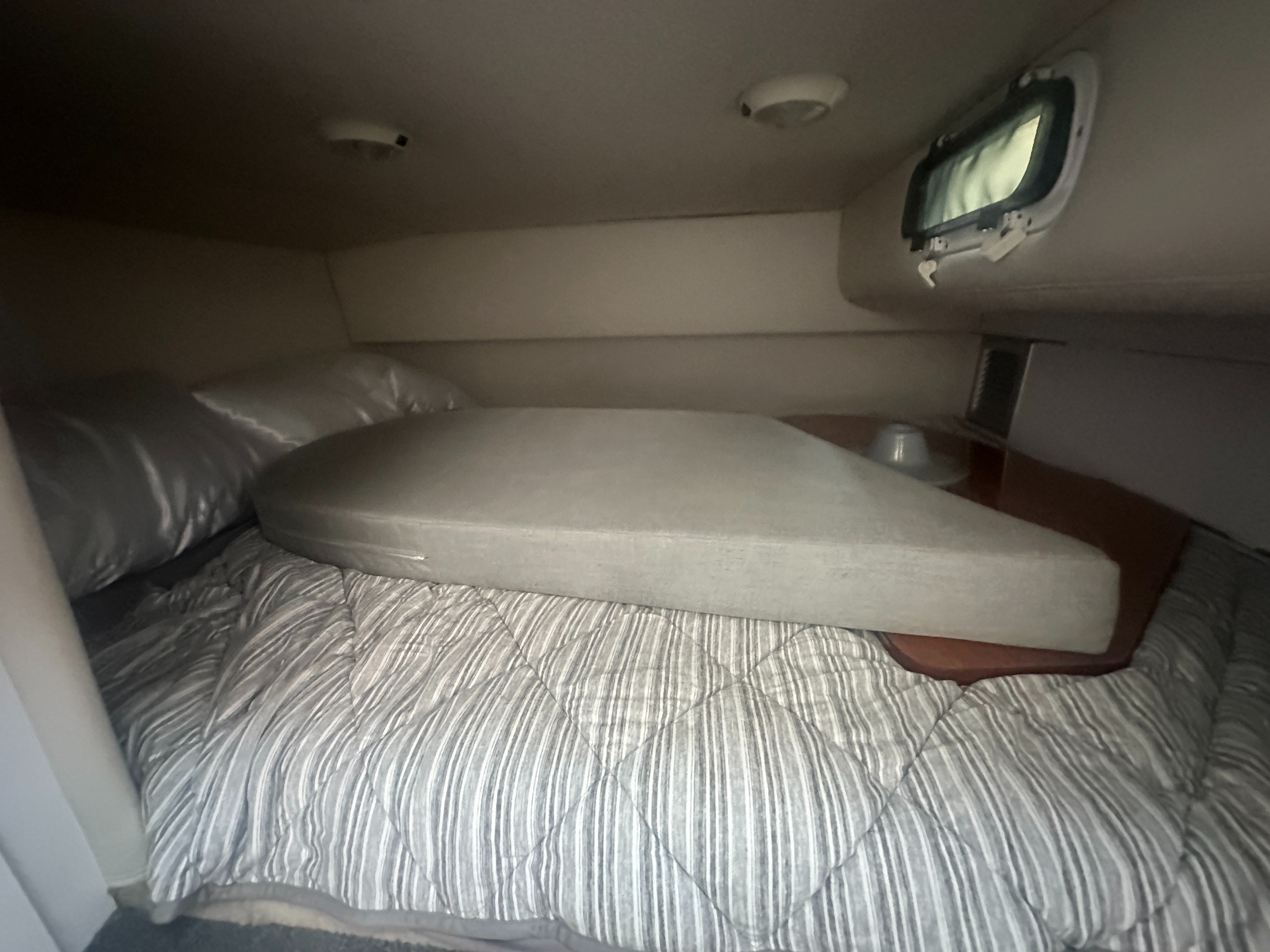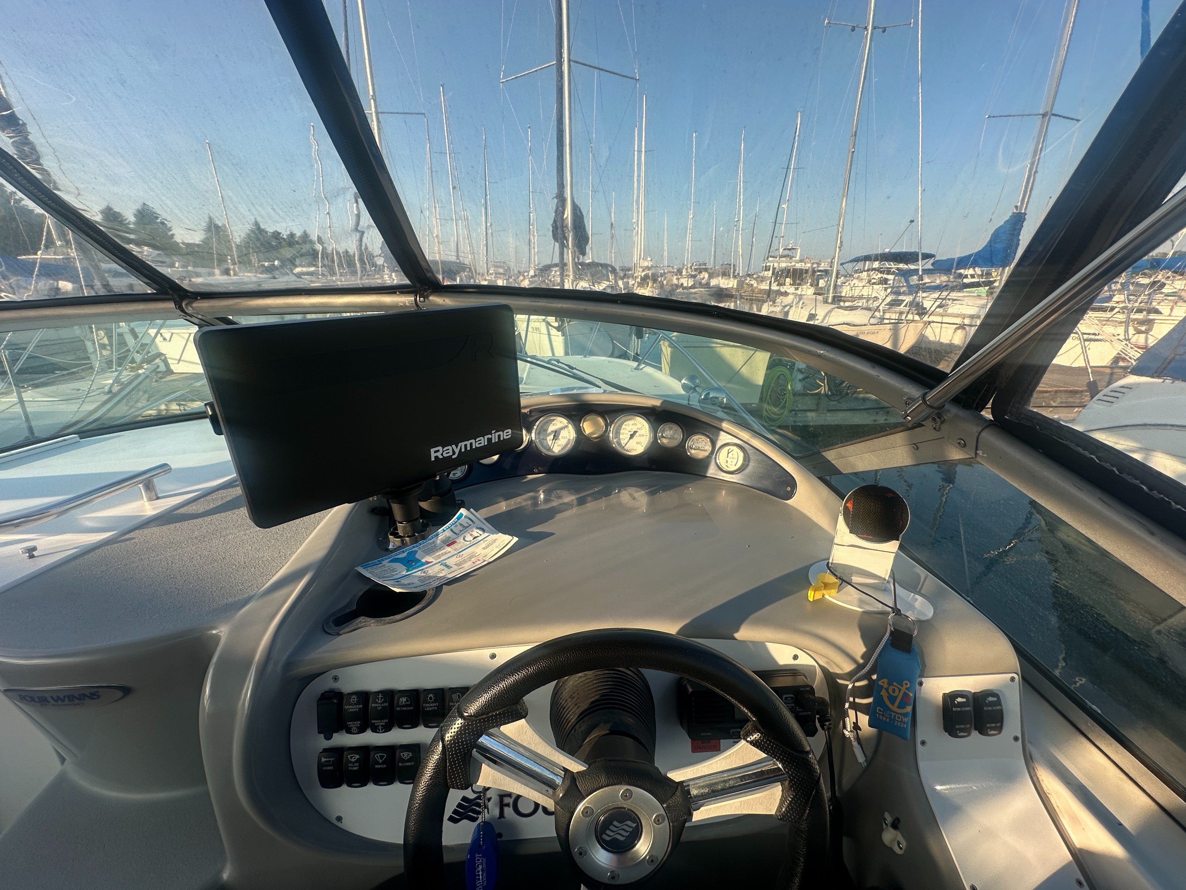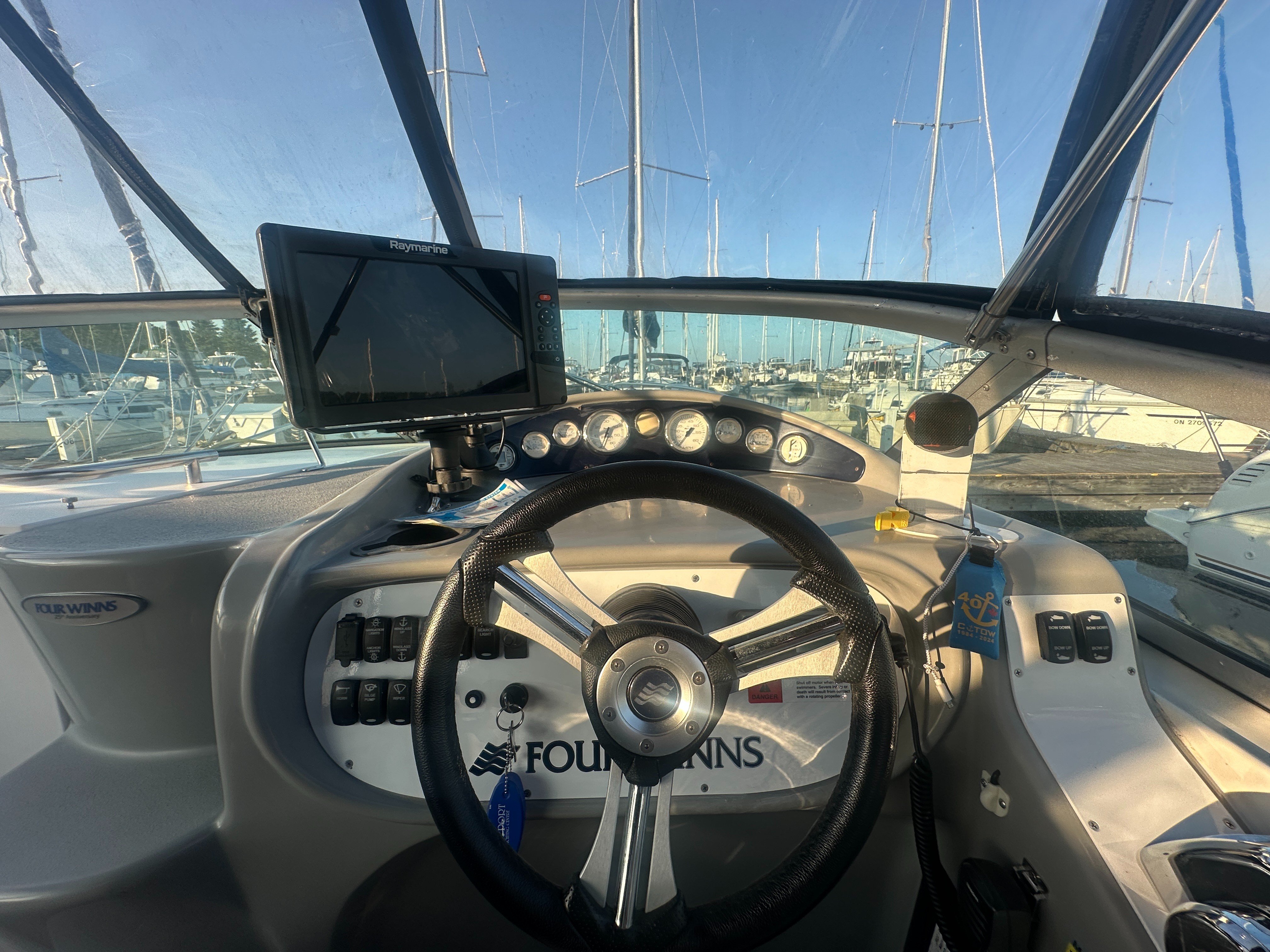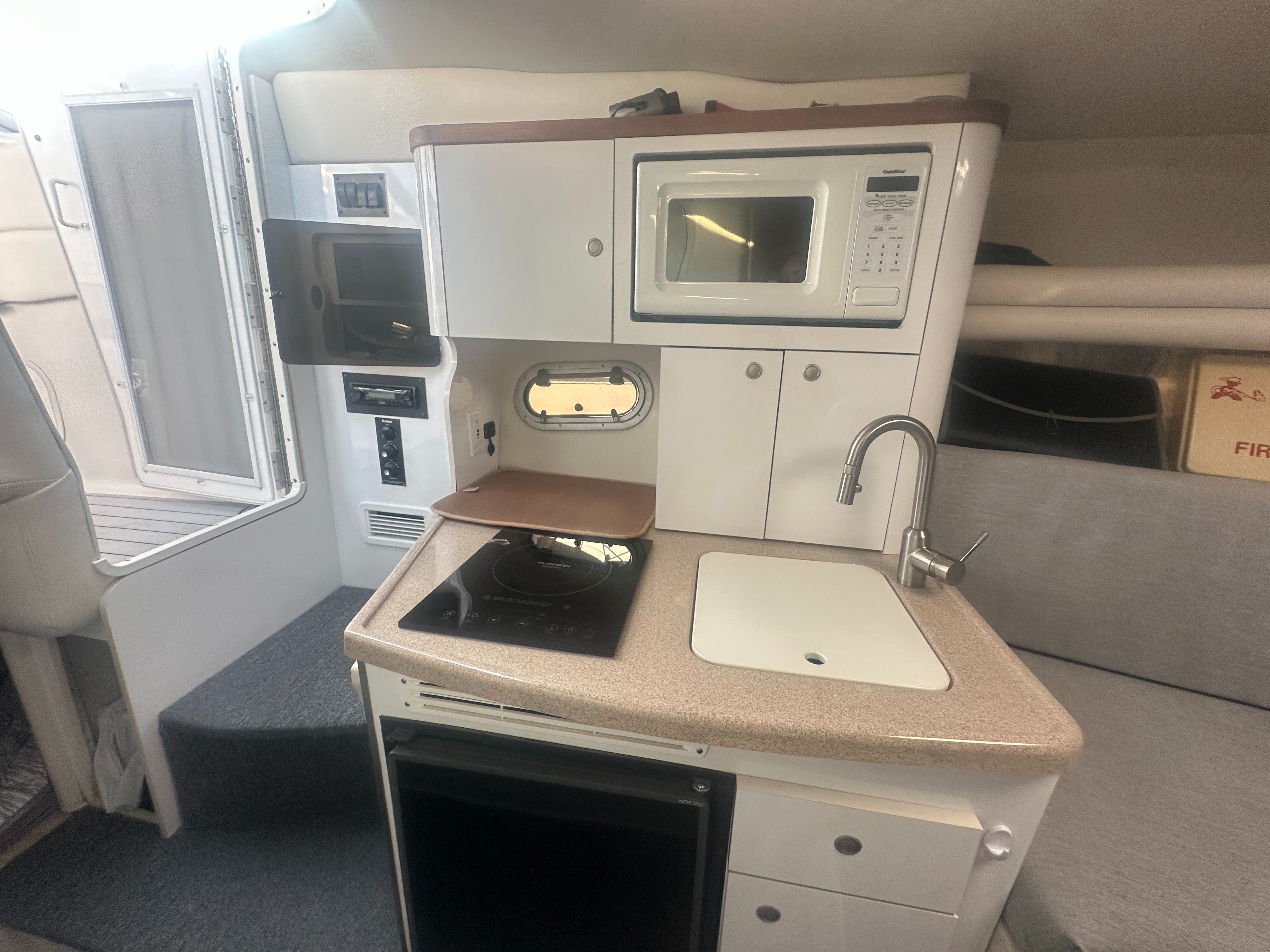 A clean, updated, and upgraded single engine family cruiser. Powered by a 5.7L Volvo with 650 hours, paired with a 3 year old drive. The canvas is in good shape, the helm features a new 12 inch Raymarine, and the tabs have new trim rams. The boat also features a comfortable layout and heat/ac, and has a trailable beam without permits.