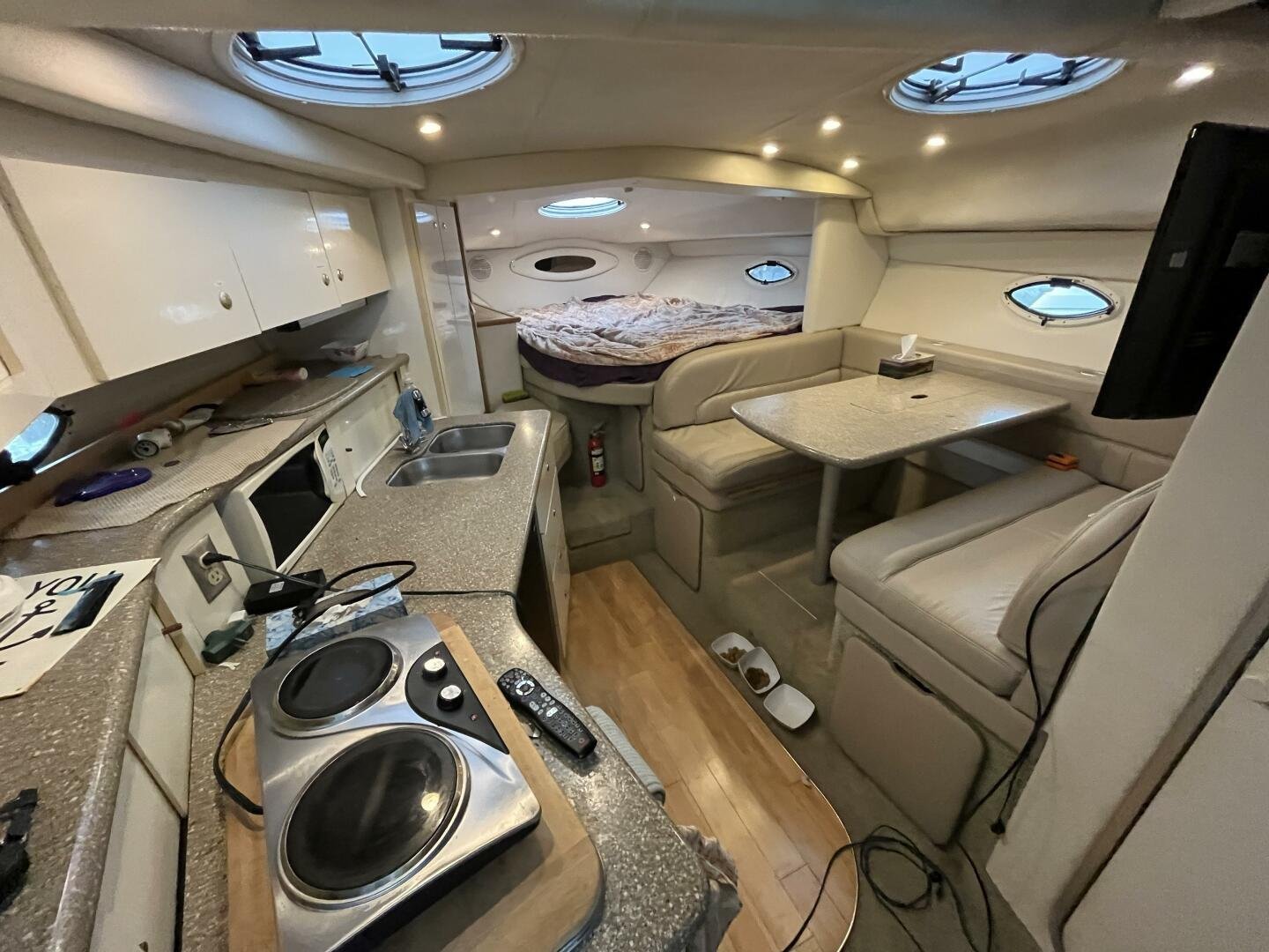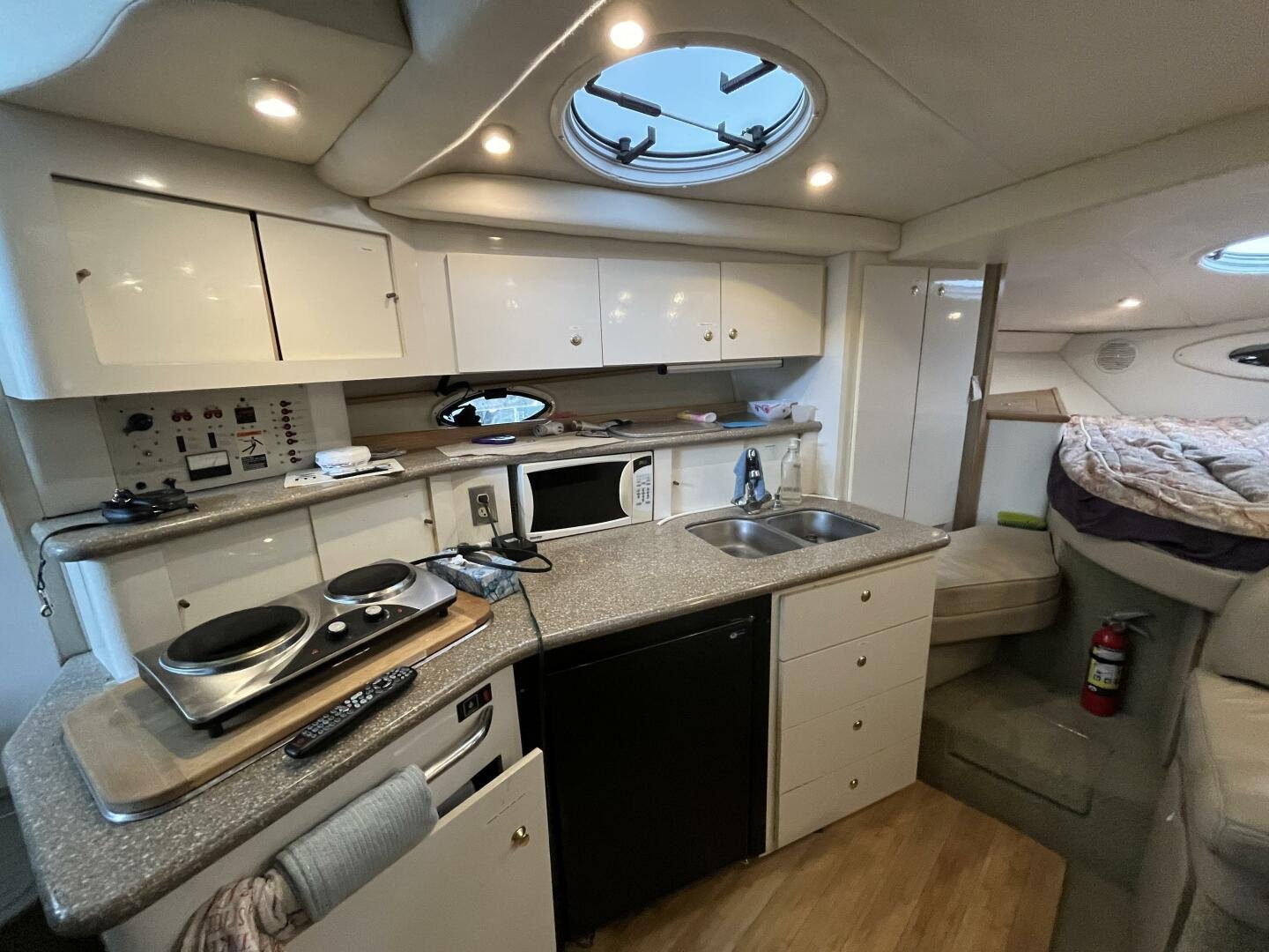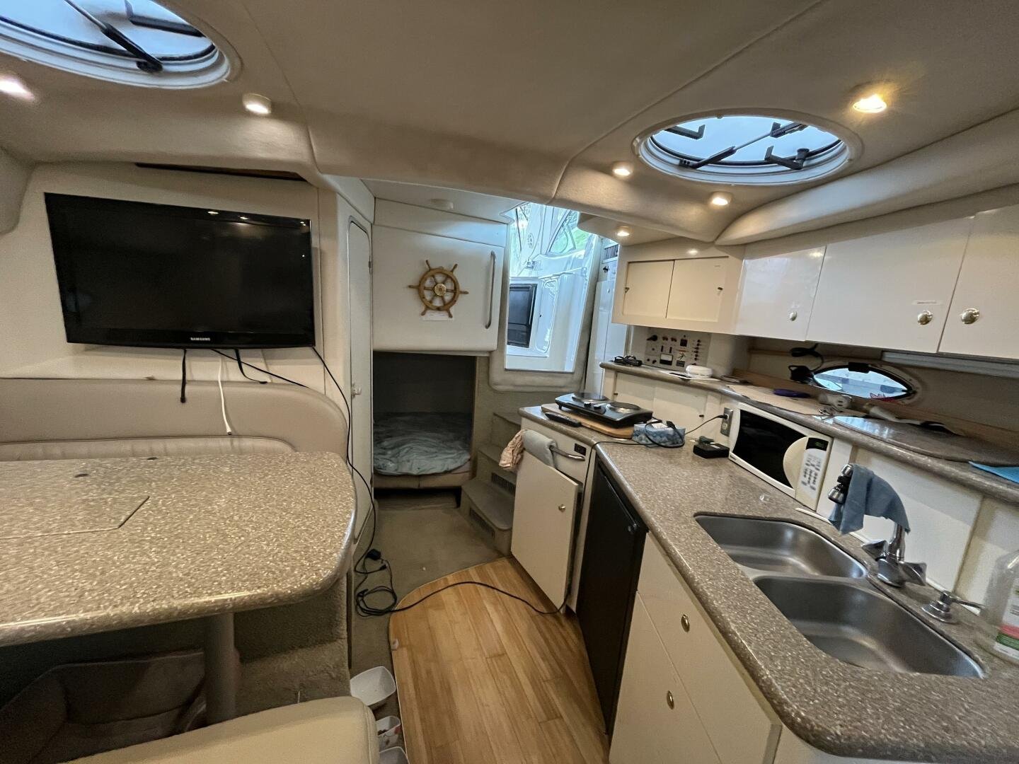 - Galley – Equipped with refrigerator, microwave, stove, and sink